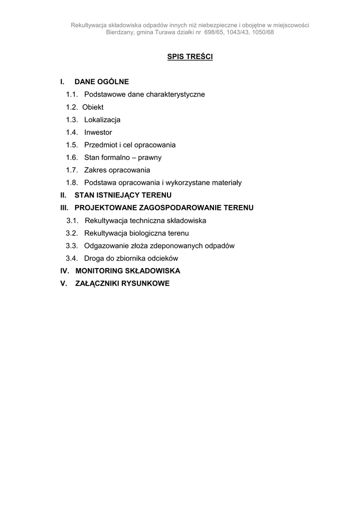 Rekultywacja składowiska odpadów innych niŜ niebezpieczne i obojętne w miejscowości Bierdzany, gmina Turawa działki nr 698/65, 1043/43, 1050/68 SPIS TREŚCI I. DANE OGÓLNE 1.1. Podstawowe dane charakterystyczne 1.2. Obiekt 1.3. Lokalizacja 1.4. Inwestor 1.5. Przedmiot i cel opracowania 1.6. Stan formalno – prawny 1.7. Zakres opracowania 1.8. Podstawa opracowania i wykorzystane materiały II. STAN ISTNIEJĄCY TERENU III. PROJEKTOWANE ZAGOSPODAROWANIE TERENU 3.1. Rekultywacja techniczna składowiska 3.2. Rekultywacja biologiczna terenu 3.3. Odgazowanie złoŜa zdeponowanych odpadów 3.4. Droga do zbiornika odcieków IV. MONITORING SKŁADOWISKA V. ZAŁĄCZNIKI RYSUNKOWE Rekultywacja składowiska odpadów innych niŜ niebezpieczne i obojętne w miejscowości Bierdzany, gmina Turawa działki nr 698/65, 1043/43, 1050/68 I. DANE OGÓLNE 1.1. Podstawowe dane charakterystyczne Lp. Wyszczególnienie 1 2 Jedn. 1 2 3 4 5 Powierzchnia terenu objętego opracowaniem Powierzchnia składowiska Powierzchnia wierzchowiny składowiska Powierzchnia skarp składowiska Kubatura robót ziemnych, w tym: wykopy nasypy 6 Kubatura okrywy rekultywacyjnej 7 Kubatura wierzchniej warstwy z gruntów organicznych 8 Sadzenie drzew i krzewów: na wierzchowinie odpadów i terenach przyległych na skarpy 9 Studzienki odgazowujące istniejące 10 Droga do zbiorników odcieków 3 Ilość 4 m2 m2 m2 m2 14.425 7.950 5.425 2.525 m3 m3 m3 m3 1.015 1.015 2.031 1.354 szt. szt. szt. m2 1.820 204 3 750 1.2. Obiekt Gminne składowisko odpadów innych niŜ niebezpieczne i obojętne. 1.3. Lokalizacja Miejscowość Bierdzany, gmina Turawa, województwo opolskie działka nr 698/65, AM 4 o powierzchni całkowitej 1,8217ha oraz na działkach nr 1043/43, 1050/68. 1.4. Inwestor Gmina Turawa, 46-045 Turawa, ul. Opolska 39c. 1.5. Przedmiot i cel opracowania Przedmiotem opracowania jest projekt budowlano-wykonawczy rekultywacji składowiska odpadów innych niŜ niebezpieczne i obojętne. 1.6. Stan formalno - prawny Właścicielem i uŜytkownikiem przedmiotowego składowiska odpowiedzialnym za jego zamknięcie i rekultywację jest Gmina Turawa. oraz 1.7. Zakres opracowania Zakres niniejszego opracowania obejmuje projekt zakończenia prac związanych z docelową rekultywacją składowiska poprzez wykonanie: Rekultywacja składowiska odpadów innych niŜ niebezpieczne i obojętne w miejscowości Bierdzany, gmina Turawa działki nr 698/65, 1043/43, 1050/68 ukształtowania skarp i korony składowiska oraz zabezpieczenia przed erozją wietrzną i wodną poprzez wykonanie okrywy rekultywacyjnej bariery biologicznej umoŜliwiającej powstanie i utrzymania trwałej pokrywy roślinnej, wykonania wierzchniej warstwy ziemnej z gleby urodzajnej pozwalającej na wegetację roślin rekultywacyjnych, wykonania zabiegów agrotechnicznych, nawoŜenia, obsiewu mieszankami traw oraz nasadzeń drzew i krzewów wykonanie drogi dojazdowej do zbiornika odcieków oraz na wierzchowinę składowiska. 1.8. Podstawa opracowania i wykorzystane materiały mapa do celów projektowych w skali 1: 500 terenu składowiska – opracowanie wrzesień 2010r. mapa ewidencji gruntów wraz z wypisem z rejestru gruntów, Ustawa z dnia 27 kwietnia 2001 r. Prawo ochrony środowiska (tekst jednolity z dnia 23 stycznia 2008 r. - Dz. U. nr 25, poz. 150 ze zmianami). Ustawa z dnia 27 kwietnia 2001 r. o odpadach (tekst jednolity z dnia 23 stycznia 2008 r. - Dz. U. nr 25, poz. 150 ze zmianami). Ustawa z dnia 3 lutego 1995 r. o ochronie gruntów rolnych i leśnych (tekst jednolity z 2004 r. Dz. U. nr 121, poz. 1266). Ustawa z dnia 27 lipca 2001 r. o wprowadzeniu ustawy - Prawo ochrony środowiska, ustawy o odpadach oraz o zmianie niektórych ustaw (Dz. U. nr 100, poz. 1085). Rozporządzenie Ministra Środowiska z dnia 26 lutego 2009 r. zmieniające rozporządzenie w sprawie szczegółowych wymagań dotyczących lokalizacji, budowy, eksploatacji i zamknięcia, jakim powinny odpowiadać poszczególne typy składowisk odpadów (Dz. U. nr 39, poz. 320). Rozporządzenie Ministra Środowiska z dnia 24 marca 2003 r. w sprawie szczegółowych wymagań dotyczących lokalizacji, budowy, eksploatacji i zamknięcia, jakim powinny odpowiadać poszczególne typy składowisk odpadów (Dz. U. nr 61, poz. 549). Rozporządzenie Ministra Gospodarki z dnia 12 czerwca 2007 r. zmieniające rozporządzenie w sprawie kryteriów oraz procedur dopuszczania odpadów do składowania na składowisku odpadów danego typu (Dz. U. z 2007 r. nr 121, poz. 832). Rozporządzenie Ministra Środowiska z dnia 21 marca 2006 r. w sprawie odzysku lub unieszkodliwiania odpadów poza instalacjami i urządzeniami (Dz. U. z 2006 r. nr 49, poz. 356). Rozporządzenie Ministra Środowiska z dnia 27 września 2001 r. w sprawie katalogu odpadów (Dz. U. nr 112 poz.1206) Rozporządzenie Ministra Gospodarki z dnia 30 października 2002 r. w sprawie rodzajów odpadów, które mogą być składowane w sposób nieselektywny (Dz. U. z 2002 r. nr 191, poz. 1595). Rozporządzenie Ministra Środowiska z dnia 9 grudnia 2002 r. w sprawie zakresu, czasu, sposobu oraz warunków prowadzenia monitoringu składowisk odpadów (Dz. U. z 2002 r. nr 220, poz. 1858). Rekultywacja składowiska odpadów innych niŜ niebezpieczne i obojętne w miejscowości Bierdzany, gmina Turawa działki nr 698/65, 1043/43, 1050/68 Rozporządzenie Ministra Środowiska z dnia 23 lipca 2008 w sprawie kryteriów i sposobu oceny stanu wód podziemnych (Dz. U. z 2008, nr 143, poz. 896). Rozporządzenie Ministra Środowiska z dnia 1 sierpnia 2002 r. w sprawie komunalnych osadów ściekowych (Dz. U. z 2002 r. nr 134, poz. 1140 z późn. zmianami). II. STAN ISTNIEJĄCY TERENU W ramach przeprowadzonych robót związanych z rekultywacją składowiska uŜytkownik i właściciel składowiska dokonał wstępnej rekultywacji czaszy odpadów poprzez przykryciu ich warstwą gruntową o gubości średniej 0,30 m. Zasypano teŜ istniejące wyrobisko poŜwirowe. Ponadto zlikwidowano istniejące o