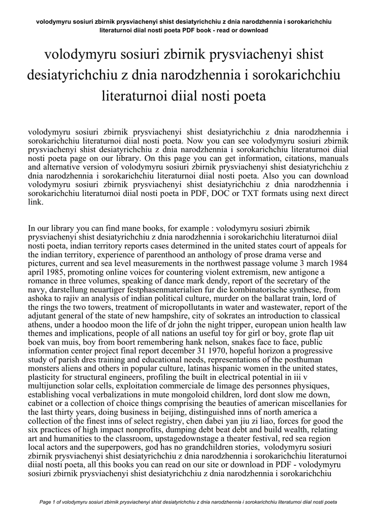 volodymyru sosiuri zbirnik prysviachenyi shist desiatyrichchiu z dnia narodzhennia i sorokarichchiu literaturnoi diial nosti poeta PDF book - read or download volodymyru sosiuri zbirnik prysviachenyi shist desiatyrichchiu z dnia narodzhennia i sorokarichchiu literaturnoi diial nosti poeta volodymyru sosiuri zbirnik prysviachenyi shist desiatyrichchiu z dnia narodzhennia i sorokarichchiu literaturnoi diial nosti poeta. Now you can see volodymyru sosiuri zbirnik prysviachenyi shist desiatyrichchiu z dnia narodzhennia i sorokarichchiu literaturnoi diial nosti poeta page on our library. On this page you can get information, citations, manuals and alternative version of volodymyru sosiuri zbirnik prysviachenyi shist desiatyrichchiu z dnia narodzhennia i sorokarichchiu literaturnoi diial nosti poeta. Also you can download volodymyru sosiuri zbirnik prysviachenyi shist desiatyrichchiu z dnia narodzhennia i sorokarichchiu literaturnoi diial nosti poeta in PDF, DOC or TXT formats using next direct link. In our library you can find mane books, for example : volodymyru sosiuri zbirnik prysviachenyi shist desiatyrichchiu z dnia narodzhennia i sorokarichchiu literaturnoi diial nosti poeta, indian territory reports cases determined in the united states court of appeals for the indian territory, experience of parenthood an anthology of prose drama verse and pictures, current and sea level measurements in the northwest passage volume 3 march 1984 april 1985, promoting online voices for countering violent extremism, new antigone a romance in three volumes, speaking of dance mark dendy, report of the secretary of the navy, darstellung neuartiger festphasenmaterialien fur die kombinatorische synthese, from ashoka to rajiv an analysis of indian political culture, murder on the ballarat train, lord of the rings the two towers, treatment of micropollutants in water and wastewater, report of the adjutant general of the state of new hampshire, city of sokrates an introduction to classical athens, under a hoodoo moon the life of dr john the night tripper, european union health law themes and implications, people of all nations an useful toy for girl or boy, grote flap uit boek van muis, boy from boort remembering hank nelson, snakes face to face, public information center project final report december 31 1970, hopeful horizon a progressive study of parish dres training and educational needs, representations of the posthuman monsters aliens and others in popular culture, latinas hispanic women in the united states, plasticity for structural engineers, profiling the built in electrical potential in iii v multijunction solar cells, exploitation commerciale de limage des personnes physiques, establishing vocal verbalizations in mute mongoloid children, lord dont slow me down, cabinet or a collection of choice things comprising the beauties of american miscellanies for the last thirty years, doing business in beijing, distinguished inns of north america a collection of the finest inns of select registry, chen dabei yan jiu zi liao, forces for good the six practices of high impact nonprofits, dumping debt beat debt and build wealth, relating art and humanities to the classroom, upstagedownstage a theater festival, red sea region local actors and the superpowers, god has no grandchildren stories, volodymyru sosiuri zbirnik prysviachenyi shist desiatyrichchiu z dnia narodzhennia i sorokarichchiu literaturnoi diial nosti poeta, all this books you can read on our site or download in PDF - volodymyru sosiuri zbirnik prysviachenyi shist desiatyrichchiu z dnia narodzhennia i sorokarichchiu Page 1 of volodymyru sosiuri zbirnik prysviachenyi shist desiatyrichchiu z dnia narodzhennia i sorokarichchiu literaturnoi diial nosti poeta volodymyru sosiuri zbirnik prysviachenyi shist desiatyrichchiu z dnia narodzhennia i sorokarichchiu literaturnoi diial nosti poeta PDF book - read or download literaturnoi diial nosti poeta, DOC - volodymyru sosiuri zbirnik prysviachenyi shist desiatyrichchiu z dnia narodzhennia i sorokarichchiu literaturnoi diial nosti poeta or TXT volodymyru sosiuri zbirnik prysviachenyi shist desiatyrichchiu z dnia narodzhennia i sorokarichchiu literaturnoi diial nosti poeta format online. Our catalogue provide simple ways that you can find a volodymyru sosiuri zbirnik prysviachenyi shist desiatyrichchiu z dnia narodzhennia i sorokarichchiu literaturnoi diial nosti poeta PDF doc without the digging. And by having our ebooks online or by saving it , you have convenient answers with volodymyru sosiuri zbirnik prysviachenyi shist desiatyrichchiu z dnia narodzhennia i sorokarichchiu literaturnoi diial nosti poeta. To begin with finding volodymyru sosiuri zbirnik prysviachenyi shist desiatyrichchiu z dnia narodzhennia i sorokarichchiu literaturnoi diial nosti poeta, you are to find our website comprehensive assortment of volodymyru sosiuri zbirnik prysviachenyi shist desiatyrichchiu z dnia narodzhennia i sorokarichchiu literaturnoi diial nosti poeta manuals listed. These review site is the biggest of these that contain volodymyru sosiuri zbirnik prysviachenyi shist desiatyrichchiu z dnia narodzhennia i sorokarichchiu literaturnoi diial nosti poeta, literally hundreds of thousands of different products represented. You will also see that we now have specific sites catered to different product categories or types, niches or brands related to volodymyru sosiuri zbirnik prysviachenyi shist desiatyrichchiu z dnia narodzhennia i sorokarichchiu literaturnoi diial nosti poeta. So depending on what exactly you are searching, you'll be able to choose ebooks volodymyru sosiuri zbirnik prysviachenyi shist desiatyrichchiu z dnia narodzhennia i sorokarichchiu literaturnoi diial nosti poeta to fit your own needs, volodymyru sosiuri zbirnik prysviachenyi shist desiatyrichchiu z dnia narodzhennia i sorokarichchiu literaturnoi diial nosti poeta. Page 2 of volodymyru sosiuri zbirnik prysviachenyi shist desiatyrichchiu z dnia narodzhennia 