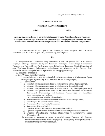 Projekt z dnia 24 maja 2012 r. ZARZĄDZENIE Nr PREZESA RADY MINISTRÓW z dnia ..................................................2012 r. zmieniające zarządzenie w sprawie Międzyresortowego Zespołu do Spraw Funduszu Schengen, Norweskiego Mechanizmu Finansowego, Europejskiego Funduszu na rzecz Uchodźców, Funduszu Granic Zewnętrznych oraz Funduszu Powrotu Imigrantów Na podstawie art. 12 ust. 1 pkt 3 i ust. 2 ustawy z dnia 8 sierpnia 1996 r. o Radzie Ministrów (Dz. U. z 2012 r., poz. 392) zarządza się, co następuje: § 1. W zarządzeniu nr 142 Prezesa Rady Ministrów z dnia 20 grudnia 2007 r. w sprawie Międzyresortowego Zespołu do Spraw Funduszu Schengen, Norweskiego Mechanizmu Finansowego, Europejskiego Funduszu na rzecz Uchodźców, Funduszu Granic Zewnętrznych oraz Funduszu Powrotu Imigrantów, zmienionym zarządzeniem nr 85 Prezesa Rady Ministrów z dnia 8 sierpnia 2008 r. wprowadza się następujące zmiany: 1) § 2 otrzymuje brzmienie: „§ 2. 1. W skład Zespołu wchodzą: 1) przewodniczący – sekretarz stanu lub podsekretarz stanu w Ministerstwie Spraw Wewnętrznych wyznaczony przez Ministra Spraw Wewnętrznych; 2) członkowie: a) sekretarz lub podsekretarz stanu w Ministerstwie Spraw Zagranicznych, b) sekretarz lub podsekretarz stanu w Ministerstwie Sprawiedliwości, c) sekretarz lub podsekretarz stanu w Ministerstwie Pracy i Polityki Społecznej, d) sekretarz lub podsekretarz stanu w Ministerstwie Finansów, w kwestiach dotyczących Norweskiego Mechanizmu Finansowego w charakterze obserwatora, bez prawa głosu, - wyznaczeni przez właściwych ministrów, e) podsekretarz stanu w Ministerstwie Finansów - Szef Służby Celnej, f) Szef Urzędu do Spraw Cudzoziemców, g) Komendant Główny Straży Granicznej, h) Komendant Główny Policji, i) Dyrektor Władzy Wdrażającej Programy Europejskie, j) Dyrektor Departamentu Budżetu w Ministerstwie Spraw Wewnętrznych, k) Dyrektor Departamentu Polityki Migracyjnej w Ministerstwie Spraw Wewnętrznych; 3) sekretarz – wyznaczony przez przewodniczącego Dyrektor lub Zastępca Dyrektora Departamentu Unii Europejskiej i Współpracy Międzynarodowej w Ministerstwie Spraw Wewnętrznych. 2. Przewodniczący Zespołu lub działający z jego upoważnienia sekretarz mogą zapraszać do udziału w pracach Zespołu inne osoby niż wymienione w § 2 ust. 1 pkt 2, w tym przedstawicieli zainteresowanych organów państwowych, instytucji i organizacji, a także ekspertów. 3. Sekretarz pełni obowiązki przewodniczącego Zespołu w razie jego nieobecności.”; 2) w § 5 wprowadzenie do wyliczenia otrzymuje brzmienie: „Przewodniczący Zespołu:”. § 2. Zarządzenie wchodzi w życie z dniem podpisania. PREZES RADY MINISTRÓW Uzasadnienie 1. Cel wydania zarządzenia Proponowane zmiany mają wyłącznie charakter porządkujący, wynikają ze zniesienia Ministerstwa Spraw Wewnętrznych i Administracji oraz utworzenia, w drodze przekształcenia, Ministerstwa Spraw Wewnętrznych oraz Ministerstwa Administracji i Cyfryzacji oraz z zakończenia działalności Urzędu Komitetu Integracji Europejskiej. Ponadto projekt nie przewiduje utrzymania w składzie Zespołu funkcji zastępcy przewodniczącego Zespołu. Przewodniczący uzyskuje natomiast możliwość delegowania swoich obowiązków na Sekretarza, a ponadto sekretarz będzie mógł zapraszać inne osoby niż członków Zespołu do udziału w jego pracach. W projekcie ograniczono także liczbę przedstawicieli Departamentu Unii Europejskiej i Współpracy Międzynarodowej resortu spraw wewnętrznych. Obecnie przedstawicielem Departamentu będzie osoba pełniąca funkcję sekretarza Zespołu w randze dyrektora lub zastępcy dyrektora. 2. Zmiany szczegółowe Zgodnie z obowiązującym brzmieniem Zarządzenia Nr 142 Prezesa Rady Ministrów z dnia 20 grudnia 2007 r. w sprawie Międzyresortowego Zespołu do Spraw Funduszu Schengen, Norweskiego Mechanizmu Finansowego, Europejskiego Funduszu na rzecz Uchodźców, Funduszu Granic Zewnętrznych oraz Funduszu Powrotu Imigrantów, Sekretarz Komitetu Integracji Europejskiej jest członkiem Międzyresortowego Zespołu do Spraw Funduszu Schengen, Norweskiego Mechanizmu Finansowego, Europejskiego Funduszu na rzecz Uchodźców, Funduszu Granic Zewnętrznych oraz Funduszu Powrotu Imigrantów. Wykreślenie z listy członków Zespołu Sekretarza Komitetu Integracji Europejskiej jest zasadne w związku z wejściem w życie ustawy z dnia 27 sierpnia 2009 r. o Komitecie do Spraw Europejskich (Dz. U. Nr 161, poz. 1277), na mocy której likwidacji uległ Urząd Komitetu Integracji Europejskiej. W związku z treścią rozporządzenia Rady Ministrów z dnia 21 listopada 2011 r. w sprawie utworzenia Ministerstwa Spraw Wewnętrznych (Dz. U. Nr 250, poz. 1502) i powstaniem Ministerstwa Spraw Wewnętrznych oraz Ministerstwa Administracji i Cyfryzacji z wydzielenia z Ministerstwa Spraw Wewnętrznych i Administracji, konieczne było odpowiednie dostosowanie treści przepisów Zarządzenia. Jednocześnie w związku z wyłączeniem Władzy Wdrażającej Programy Europejskie spod podległości względem Ministerstwa Spraw Wewnętrznych odpowiednio zmodyfikowano przepis. Ze składu Zespołu wykreślono Dyrektora lub Zastępcę Dyrektora w Departamencie Unii Europejskiej i Współpracy Międzynarodowej w resorcie spraw wewnętrznych, z uwagi iż DUEiWM MSW reprezentowany jest już w osobie sekretarza Zespołu. Zrezygnowano również z funkcji zastępcy przewodniczącego, gdyż od dłuższego czasu na tym stanowisku utrzymywał się wakat. Proponowane zmiany mają wyłącznie charakter porządkujący, nie spowodują obciążeń finansowych i są zgodne z prawem Unii Europejskiej. Tak jak dotychczas, obsługę techniczną oraz merytoryczną działalności Zespołu zapewnia urząd obsługujący ministra właściwego do spraw wewnętrznych. Projekt zarządzenia nie podlega procedurze notyfikacji określonej w przepisach rozporządzenia Rady Ministrów z dnia 23 grudnia 2002 r. w sp