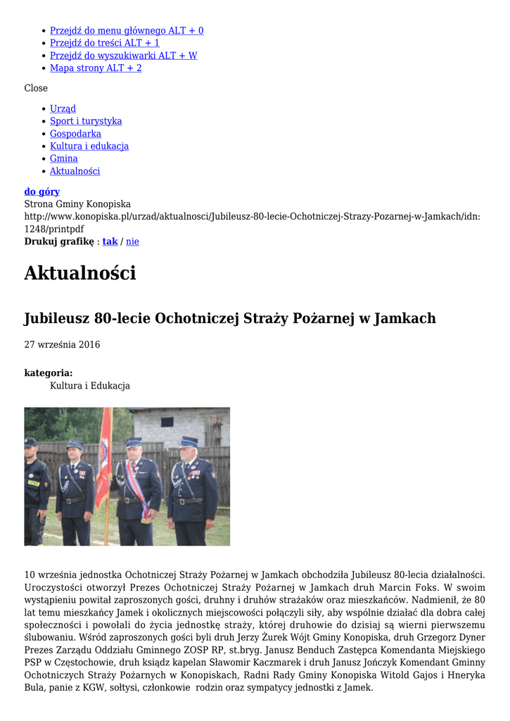 Przejdź do menu głównego ALT + 0 Przejdź do treści ALT + 1 Przejdź do wyszukiwarki ALT + W Mapa strony ALT + 2 Close Urząd Sport i turystyka Gospodarka Kultura i edukacja Gmina Aktualności do góry Strona Gminy Konopiska http://www.konopiska.pl/urzad/aktualnosci/Jubileusz-80-lecie-Ochotniczej-Strazy-Pozarnej-w-Jamkach/idn: 1248/printpdf Drukuj grafikę : tak / nie Aktualności Jubileusz 80-lecie Ochotniczej Straży Pożarnej w Jamkach 27 września 2016 kategoria: Kultura i Edukacja 10 września jednostka Ochotniczej Straży Pożarnej w Jamkach obchodziła Jubileusz 80-lecia działalności. Uroczystości otworzył Prezes Ochotniczej Straży Pożarnej w Jamkach druh Marcin Foks. W swoim wystąpieniu powitał zaproszonych gości, druhny i druhów strażaków oraz mieszkańców. Nadmienił, że 80 lat temu mieszkańcy Jamek i okolicznych miejscowości połączyli siły, aby wspólnie działać dla dobra całej społeczności i powołali do życia jednostkę straży, której druhowie do dzisiaj są wierni pierwszemu ślubowaniu. Wśród zaproszonych gości byli druh Jerzy Żurek Wójt Gminy Konopiska, druh Grzegorz Dyner Prezes Zarządu Oddziału Gminnego ZOSP RP, st.bryg. Janusz Benduch Zastępca Komendanta Miejskiego PSP w Częstochowie, druh ksiądz kapelan Sławomir Kaczmarek i druh Janusz Jończyk Komendant Gminny Ochotniczych Straży Pożarnych w Konopiskach, Radni Rady Gminy Konopiska Witold Gajos i Hneryka Bula, panie z KGW, sołtysi, członkowie rodzin oraz sympatycy jednostki z Jamek. Następnie, zgodnie z obowiązującym zwyczajem dh Marcin Foks Prezes OSP, w swoim wystąpieniu przedstawił kronikę jednostki. W krótkim rysie historycznym zawarte były informacje o założycielach straży i okresach działalności, w których druhowie wspólnie z mieszkańcami i władzami samorządowymi, podejmowanymi działaniami rozbudowywali i umacniali jednostkę. Ochotnicza Straż Pożarna w Jamkach powstała 24 kwietnia 1936 roku z inicjatywy druhów: Jana Grabki, Andrzeja Rosoła, Józefa Fornalika, Pawła Sitka, Piotra Kucharczyka, Stanisława Świtały, Feliksa Kudajczyka, Zygmunta Buli, Czesława Cabana, Władysława Chalemskiego, Jana Ciekota, Józefa Gorzelaka, Stanisława Gorzelaka, Władysława Dziuka, Józefa Kędzi, Piotra Klechy, Konstantego Kołaczyka, Piotra Kołaczyka, Władysława Krawczyka, Stanisława Kowala, Franciszka Kuśmierskiego, Stanisława Pacyny, Konstantego Sitka. Pierwszy sprzęt zakupiono ze składek członkowskich oraz ofiar pienieżnych mieszkańców. Była to pompa ręczna, kilka odcinków węży i sprzęt podręczny. Na początku działalności sprzęt przechowywali strażacy. Druhowie Józef Kędzia i Feliks Kudajczyk użyczali także koni do akcji gaśniczych. Podczas II wojny światowej naczelnikiem został druh Leon Sitek. W czasie wojny zginęli druhowie: Zygmunt Bula, Bolesław Kołaczyk, Władysław Kołaczyk, Władysław Kuśmierski i Jan Pilawka. Po zakończeniu wojny prezesem został Feliks Kudajczyk, a naczelnikiem Józef Fornalik. Lata powojenne to stały rozwój jednostki, która sukcesywnie pozyskiwała sprzęt bojowy miedzy innymi: motopompę czy samochód cieżarowy marki STAR 21. Pierwszą strażnicą jednostki był drewniany budynek po szkole podstawowej w Jamkach. W latach siedemdziesiątych przy wsparciu mieszkańców wsi wybudowano garaże. Przez następne lata gromadzono materiały na budowę nowej strażnicy. Strażacy we własnym zakresie i bezinteresownie wykonali niezbędne prace budowlane. Należy także zaznaczyć, że cała społeczność Jamek i sąsiednich wsi wspierała finansowo budowę nowej siedziby jednostki. Budowę rozpoczęto w czerwcu 1987 roku, a zakończono w 1989. Uroczyste otwarcie Domu Strażaka nastąpiło w roku 1990. Przełom lat osiemdziesiątych i dziewięćdziesiątych był dla naszej jednostki czasem wytężonej pracy z młodzieżą. Zaowocowało to utworzeniem młodzieżowych drużyn męskich i żeńskich, które zajmowały czołowe miejsca w zawodach gminnych i wojewódzkich. Największym sukcesem, do którego przyczynili się druhowie Jerzy Fornalik, Wojciech Żukow, Jan Ziora było III miejsce Młodzieżowych Drużyn Żeńskich w ogólnopolskim zgrupowaniu w Słupsku. Był to rok 1988. Dzięki osiągnięciom nasza jednostka jako jedna z nielicznych uczestniczyła w cyklu zawodów w ówczesnej Republice Federalnej Niemiec. Prowadzone cyklicznie pogadanki dla młodzieży szkolnej z zakresu przepisów przeciwpożarowych odniosły duży sukces. Druhna Dorota Błach aż pięciokrotnie reprezentowała ówczesne województwo częstochowskie w Ogólnopolskim Turnieju Wiedzy Pożarniczej. Dobrą tradycję udziału w tym turnieju podtrzymał druh Teodor Gajos, który zajmował czołowe lokaty na poziomie krajowym. Jego największym sukcesem było drugie miejsce w 2007 roku w Finale Ogólnopolskim Turnieju Wiedzy Pożarniczej "Młodzież Zapobiega Pożarom" w Gnieźnie. W roku 2012 w finale tegoż turnieju godnie reprezentował jednostkę Przemysław Minkina zajmując czwartą lokatę. Praca z młodzieżą przełożyła się również na wyniki drużyn seniorów żeńskich i męskich. Od lat 90-tych do chwili obecnej nasze drużyny zdobywały ponad 30 razy pierwsze miejsca w zawodach na poziomie gminnym, powiatowym i wojewódzkim. Przez 12 lat z rzędu męska drużyna seniorów dominowała w gminie. To bardzo duże osiągnięcie biorąc pod uwagę wysoki poziom przygotowania jaki reprezentowały drużyny z pozostałych jednostek strażackich. Niestety strażacka służba to nie tylko pogadanki, szkolenia i sportowe zawody pożarnicze, ale przede wszystkim niesienie pomocy potrzebującym, ratowanie ich życia i mienia. Druhowie uczestniczyli w akcji ratowniczo –gaśniczej w Kuźni Raciborskiej, był to jeden z największych pożarów jaki dotknął województwo śląskie. Ponadto strażacy brali udział w usuwaniu skutków trąby powietrznej jaka przeszła przez sąsiednie gminy Herby i Blachownia. Usuwali
