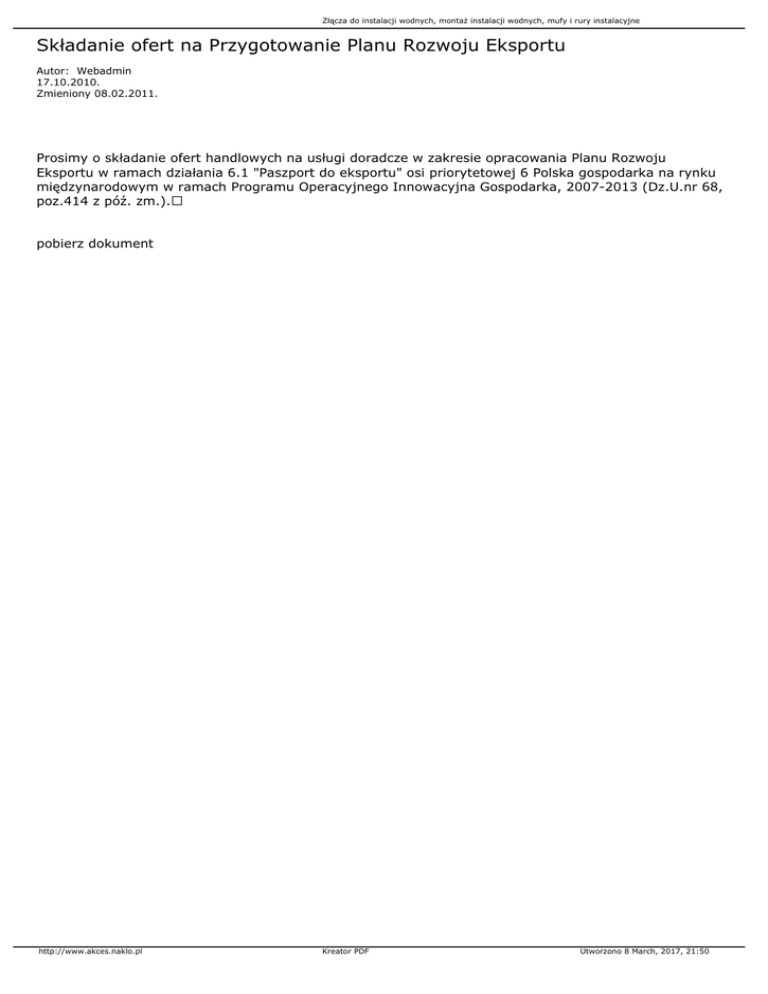 Złącza do instalacji wodnych, montaż instalacji wodnych, mufy i rury instalacyjne Składanie ofert na Przygotowanie Planu Rozwoju Eksportu Autor: Webadmin 17.10.2010. Zmieniony 08.02.2011. Prosimy o składanie ofert handlowych na usługi doradcze w zakresie opracowania Planu Rozwoju Eksportu w ramach działania 6.1 "Paszport do eksportu" osi priorytetowej 6 Polska gospodarka na rynku międzynarodowym w ramach Programu Operacyjnego Innowacyjna Gospodarka, 2007-2013 (Dz.U.nr 68, poz.414 z póź. zm.). pobierz dokument http://www.akces.naklo.pl Kreator PDF Utworzono 8 March, 2017, 21:50
