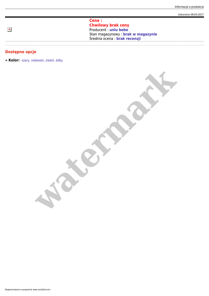 Informacje o produkcie Utworzono 08-03-2017 Cena : Chwilowy brak ceny Producent : unlu bebe Stan magazynowy : brak w magazynie Średnia ocena : brak recenzji Dostępne opcje w at er m ar k » Kolor: szary, niebieski, zieleń, żółty. Wygenerowano w programie www.oscGold.com