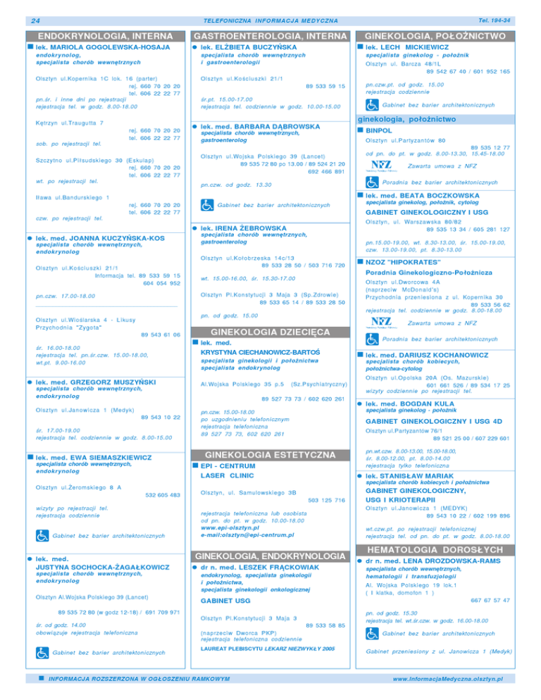 24 ENDOKRYNOLOGIA, INTERNA n lek. MARIOLA GOGOLEWSKA-HOSAJA GASTROENTEROLOGIA, INTERNA l lek. EL¯BIETA BUCZYÑSKA endokrynolog, specjalista chorób wewnêtrznych specjalista chorób wewnêtrznych i gastroenterologii Olsztyn ul.Kopernika 1C lok. 16 (parter) rej. 660 70 20 20 tel. 606 22 22 77 pn.r. i inne dni po rejestracji rejestracja tel. w godz. 8.00-18.00 Olsztyn ul.Kociuszki 21/1 Kêtrzyn ul.Traugutta 7 sob. po rejestracji tel. rej. 660 70 20 20 tel. 606 22 22 77 Szczytno ul.Pi³sudskiego 30 (Eskulap) rej. 660 70 20 20 tel. 606 22 22 77 wt. po rejestracji tel. czw. po rejestracji tel. Olsztyn ul. Barcza 48/1L 89 542 67 40 / 601 952 165 89 533 59 15 r.pt. 15.00-17.00 rejestracja tel. codziennie w godz. 10.00-15.00 l lek. med. BARBARA D¥BROWSKA specjalista chorób wewnêtrznych, gastroenterolog pn.czw.pt. od godz. 15.00 rejestracja codziennie Gabinet bez barier architektonicznych ginekologia, po³o¿nictwo n BINPOL Olsztyn ul.Partyzantów 80 Olsztyn ul.Wojska Polskiego 39 (Lancet) 89 535 72 80 po 13.00 / 89 524 21 20 692 466 891 89 535 12 77 od pn. do pt. w godz. 8.00-13.30, 15.45-18.00 Zawarta umowa z NFZ Poradnia bez barier architektonicznych pn.czw. od godz. 13.30 n lek. med. BEATA BOCZKOWSKA rej. 660 70 20 20 tel. 606 22 22 77 Gabinet bez barier architektonicznych l lek. med. JOANNA KUCZYÑSKA-KOS specjalista chorób wewnêtrznych, endokrynolog Olsztyn ul.Kociuszki 21/1 Informacja tel. 89 533 59 15 604 054 952 pn.czw. 17.00-18.00 __________________________________________ specjalista chorób wewnêtrznych, gastroenterolog GABINET GINEKOLOGICZNY I USG pn.15.00-19.00, wt. 8.30-13.00, r. 15.00-19.00, czw. 13.00-19.00, pt. 8.30-13.00 Olsztyn ul.Ko³obrzeska 14c/13 89 533 28 50 / 503 716 720 wt. 15.00-16.00, r. 15.30-17.00 Olsztyn Pl.Konstytucji 3 Maja 3 (Sp.Zdrowie) 89 533 65 14 / 89 533 28 50 pn. od godz. 15.00 Olsztyn ul.Wiolarska 4 - Likusy Przychodnia "Zygota" specjalista ginekolog, po³o¿nik, cytolog Olsztyn, ul. Warszawska 80/82 89 535 13 34 / 605 281 127 l lek. IRENA ¯EBROWSKA n NZOZ "HIPOKRATES" Poradnia Ginekologiczno-Po³o¿nicza Olsztyn ul.Dworcowa 4A (naprzeciw McDonalds) Przychodnia przeniesiona z ul. Kopernika 30 89 533 56 62 rejestracja tel. codziennie w godz. 8.00-18.00 Zawarta umowa z NFZ 89 543 61 06 r. 16.00-18.00 rejestracja tel. pn.r.czw. 15.00-18.00, wt.pt. 9.00-16.00 l lek. med. GRZEGORZ MUSZYÑSKI specjalista chorób wewnêtrznych, endokrynolog GINEKOLOGIA DZIECIÊCA n lek. med. KRYSTYNA CIECHANOWICZ-BARTO specjalista ginekologii i po³o¿nictwa specjalista endokrynolog Al.Wojska Polskiego 35 p.5 (Sz.Psychiatryczny) 89 527 73 73 / 602 620 261 Olsztyn ul.Janowicza 1 (Medyk) 89 543 10 22 r. 17.00-19.00 rejestracja tel. codziennie w godz. 8.00-15.00 med. EWA SIEMASZKIEWICZ specjalista chorób wewnêtrznych, endokrynolog 532 605 483 wizyty po rejestracji tel. rejestracja codziennie Gabinet bez barier architektonicznych l lek. med. JUSTYNA SOCHOCKA-¯AGA£KOWICZ specjalista chorób wewnêtrznych, endokrynolog Olsztyn Al.Wojska Polskiego 39 (Lancet) 89 535 72 80 (w godz 12-18) / 691 709 971 r. od godz. 14.00 obowi¹zuje rejestracja telefoniczna Gabinet bez barier architektonicznych n lek. med. DARIUSZ KOCHANOWICZ specjalista chorób kobiecych, po³o¿nictwa-cytolog Olsztyn ul.Opolska 20A (Os. Mazurskie) 601 661 526 / 89 534 17 25 wizyty codziennie po rejestracji tel. l lek. med. BOGDAN KULA GABINET GINEKOLOGICZNY I USG 4D Olsztyn ul.Partyzantów 76/1 89 521 25 00 / 607 229 601 GINEKOLOGIA ESTETYCZNA n EPI - CENTRUM pn.wt.czw. 8.00-13.00, 15.00-18.00, r. 8.00-12.00, pt. 8.00-14.00 rejestracja tylko telefoniczna l lek. STANIS£AW MARIAK specjalista chorób kobiecych i po³o¿nictwa Olsztyn, ul. Samulowskiego 3B 503 125 716 rejestracja telefoniczna lub osobista od pn. do pt. w godz. 10.00-18.00 www.epi-olsztyn.pl e-mail:[email protected] GINEKOLOGIA, ENDOKRYNOLOGIA l dr n. med. LESZEK FR¥CKOWIAK endokrynolog, specjalista ginekologii i po³o¿nictwa, specjalista ginekologii onkologicznej GABINET GINEKOLOGICZNY, USG I KRIOTERAPII Olsztyn ul.Janowicza 1 (MEDYK) 89 543 10 22 / 602 199 896 wt.czw.pt. po rejestracji telefonicznej rejestracja tel. od pn. do pt. w godz. 8.00-18.00 HEMATOLOGIA DOROS£YCH l dr n. med. LENA DROZDOWSKA-RAMS specjalista chorób wewnêtrznych, hematologii i transfuzjologii Al. Wojska Polskiego 19 lok.1 ( I klatka, domofon 1 ) 667 67 57 47 GABINET USG Olsztyn Pl.Konstytucji 3 Maja 3 89 533 58 85 (naprzeciw Dworca PKP) rejestracja telefoniczna codziennie LAUREAT PLEBISCYTU LEKARZ NIEZWYK£Y 2005 INFORMACJA ROZSZERZONA W OG£OSZENIU RAMKOWYM Poradnia bez barier architektonicznych specjalista ginekolog - po³o¿nik pn.czw. 15.00-18.00 po uzgodnieniu telefonicznym rejestracja telefoniczna 89 527 73 73, 602 620 261 LASER CLINIC Olsztyn ul.¯eromskiego 8 A n GINEKOLOGIA, PO£O¯NICTWO n lek. LECH MICKIEWICZ specjalista ginekolog - po³o¿nik I³awa ul.Bandurskiego 1 n lek. Tel. 194-34 TELEFONICZNA INFORMACJA MEDYCZNA pn. od godz. 15.30 rejestracja tel. wt.r.czw. w godz. 16.00-18.00 Gabinet bez barier architektonicznych Gabinet przeniesiony z ul. Janowicza 1 (Medyk) www.InformacjaMedyczna.olsztyn.pl