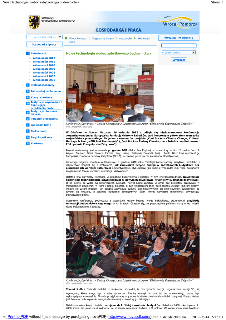 Nowe technologie wobec zabytkowego budownictwa --- wybierz dział --- Wrota Pomorza 2012 Strona 1 Gospodarka i praca Aktualności Aktualności Wyszukaj w serwisie Gospodarka i praca Aktualności Aktualności 2012 Aktualności 2011 Aktualności 2010 Aktualności 2009 Aktualności 2008 Aktualności 2007 Aktualności 2006 Nowe technologie wobec zabytkowego budownictwa w całym portalu Wyszukaj Profil gospodarczy Zainwestuj na Pomorzu Kursy i szkolenia Instytucje wspierające i finansujące przedsiębiorczość Instytucje otoczenia biznesu Poradnik pracownika Zakładam firmę Giełda pracy Targi i spotkania Konkursy Konferencja „Cool Bricks – Zmiany Klimatyczne a Dziedzictwo Kulturowe i Efektywność Energetyczna Zabytków” Fot. materiały prasowe W Gdańsku, w Nowym Ratuszu, 16 kwietnia 2012 r. odbyła się międzynarodowa konferencja zorganizowana przez Europejską Fundację Ochrony Zabytków, pod honorowym patronatem marszałka województwa pomorskiego. To jeden z elementów projektu „Cool Bricks – Climate Change, Cultural Heritage & Energy Efficient Monuments” („Cool Bricks – Zmiany Klimatyczne a Dziedzictwo Kulturowe i Efektywność Energetyczna Zabytków”). Projekt realizowany jest w ramach programu BSR (Baltic Sea Region), a uczestniczy w nim 18 partnerów z 9 krajów: Niemiec, Danii, Szwecji, Estonii, Litwy, Łotwy, Białorusi, Finlandii, Rosji i Polski. Nasz kraj reprezentuje Europejska Fundacja Ochrony Zabytków (EFOZ), kierowana przez prezes Aleksandrę Kociałkowską. Koncepcja projektu powstała w Hamburgu w grudniu 2010 roku. Tamtejsi konserwatorzy zabytków, architekci i inżynierowie borykali się z problemem, jak zmniejszyć zużycie energii w zabytkowych budynkach bez niszczenia ich wartości kulturowej i autentyczności. Byli ciekawi, jak sobie z tym radzą inni, więc postanowili zorganizować forum wymiany informacji i doświadczeń. Ostatnie lata przyniosły rewolucję w dziedzinie budownictwa i ekologii, w tym energooszczędność. Nowatorskie osiągnięcia technologiczne łatwo stosować w nowym budownictwie, trudniej w substancji zabytkowej. O ile kiedyś, co widać na historycznych rycinach, nawet ludzie zamożni w zimie bez protestów przebywali w mieszkaniach poubierani w futra i ciepłe płaszcze, o tyle współcześni chcą mieć jednak większy komfort cieplny. Pojawił się zatem problem, jak ocieplić zabytkowe budynki bez negatywnych dla nich skutków. Szczególnie, że szybko się okazało, iż szczelne ocieplanie zewnętrznych ścian tworzy wewnątrz mikroklimat powodujący powstawanie pleśni. Uczestnicy konferencji, pochodzący z wszystkich krajów basenu Morza Bałtyckiego, prezentowali przykłady renowacji budownictwa ceglanego w ich krajach. Okazało się, że poszczególne państwa mają w tej kwestii różne doświadczenia i poglądy. Konferencja „Cool Bricks – Zmiany Klimatyczne a Dziedzictwo Kulturowe i Efektywność Energetyczna Zabytków” Fot. materiały prasowe Tommi Lindh z Finlandii, architekt i naukowiec, stwierdził, że oszczędzanie energii i ograniczanie emisji CO 2 są wymogami, które mogą być z sobą sprzeczne. Zasoby energii, w tym też tej odnawialnej, muszą być wykorzystywane rozsądnie. Finowie przyjęli zasadę, aby nowe budowle powstawały w ilości rozsądnej. Korzystniejsze jest bowiem zachowywanie energii wbudowanej w struktury już istniejące. Ostatnio w wielu krajach świata panuje moda krótkiej żywotności budynków. Katedra z 1450 roku dopiero ok. 2030 stanie się ruiną (jeśli wykluczy się działania wojenne). Budynki z II połowy XX wieku mają czas trwałości Print to PDF without this message by purchasing novaPDF (http://www.novapdf.com/) http://www.pomorskie.eu/pl/praca/aktualnosci/2012/gdansk_konferencja_cool_bricks_zmiany_klimatyczne_a_dziedzictwo_ku... 2012-05-14 15:15:03 Nowe technologie wobec zabytkowego budownictwa Strona 2 Ostatnio w wielu krajach świata panuje moda krótkiej żywotności budynków. Katedra z 1450 roku dopiero ok. 2030 stanie się ruiną (jeśli wykluczy się działania wojenne). Budynki z II połowy XX wieku mają czas trwałości liczony na lat kilkadziesiąt. Niemniej i w tych przypadkach można dzięki odpowiedniej renowacji przedłużyć okres ich eksploatacji co najmniej do lat stu. Zamiast budować nowe, w Finlandii inwestuje się w budynki porzucone, nie lekceważy się małych projektów renowacyjnych. Te działania opłacają się ze względów zdrowotnych, bezpieczeństwa i jakości życia, ekologii i ekonomii. Metodą na ograniczanie emisji dwutlenku węgla jest zachowanie dawnego budownictwa. Z bardzo bogatymi doświadczeniami niemieckimi w dziedzinie rewitalizacji budynków zapoznał uczestników konferencji Albert Schett z Hamburga. Omówił, w oparciu o konkretne przykłady, popełnione błędy, które spowodowały przenikanie wody do wnętrza budynków, a w konsekwencji zawilgocenia, pojawienie się pleśni i korozję konstrukcyjnych elementów metalowych. Rudolf Plagge z Politechniki w Dreźnie (z Instytutu Technologii Budynków) omówił zasady budownictwa niskoenergetycznego, które mogą być zastosowane wobec substancji zabytkowej, także w Gdańsku. Położył nacisk na izolacje zabezpieczające przed wilgocią, podkreślając zalety izolacji kapilarnej. Jako zasadę główną niemieccy specjaliści przyjmują: „Unikajcie błędów. Zanim zaczniecie działać, sprawdźcie następstwa, w tym skuteczność”. Anna Kłos Publikujący: Aneta Konopacka, data publikacji: 2012.04.23 14:07 Drukuj Poleć stronę Powrót Patronat medialny • Kontakt • Galeria Copyright © 2007 Urząd Marszałkowski Województwa Pomorskiego Print to PDF without this message by purchasing novaPDF (http://www.novapdf.com/) http://www.pomorskie.eu/pl/praca/aktualnosci/2012/gdansk_konferencja_cool_bricks_zmiany_klimatyczne_a_dziedzictwo_ku... 2012-05-14 15:15:03