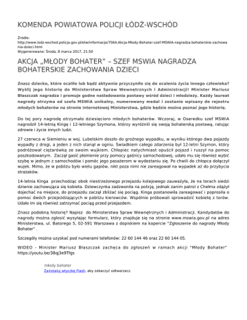 KOMENDA POWIATOWA POLICJI ŁÓDŹ-WSCHÓD Źródło: http://www.lodz-wschod.policja.gov.pl/elw/informacje/7564,Akcja-Mlody-Bohater-szef-MSWiA-nagradza-bohaterskie-zachowa nia-dzieci.html Wygenerowano: Środa, 8 marca 2017, 21:50 AKCJA „MŁODY BOHATER” – SZEF MSWIA NAGRADZA BOHATERSKIE ZACHOWANIA DZIECI Znasz dziecko, które ocaliło lub bądź aktywnie przyczyniło się do ocalenia życia innego człowieka? Wyślij jego historię do Ministerstwa Spraw Wewnętrznych i Administracji! Minister Mariusz Błaszczak nagradza i promuje godne naśladowania postawy wśród dzieci i młodzieży. Każdy laureat nagrody otrzyma od szefa MSWiA unikalny, numerowany medal i zostanie wpisany do rejestru młodych bohaterów na stronie internetowej Ministerstwa, gdzie będzie można poznać jego historię. Do tej pory nagrodę otrzymało dziesięcioro młodych bohaterów. Wczoraj, w Oseredku szef MSWiA nagrodził 14-letnią Kingę i 12-letniego Szymona, którzy wyróżnili się swoją bohaterską postawą, ratując zdrowie i życie innych ludzi. 27 czerwca w Siemieniu w woj. Lubelskim doszło do groźnego wypadku, w wyniku którego dwa pojazdy wypadły z drogi, a jeden z nich stanął w ogniu. Świadkiem całego zdarzenia był 12-letni Szymon, który podróżował ciężarówką ze swoim wujkiem. Chłopiec natychmiast opuścił pojazd i ruszył na pomoc poszkodowanym. Zaczął gasić płomienie przy pomocy gaśnicy samochodowej, udało mu się również wybić szybę w jednym z samochodów i pomóc jego pasażerom w wydostaniu się. Po chwili do chłopca dołączył wujek. Mimo, że w pobliżu było wielu gapiów, nikt poza nimi nie zareagował na wypadek aż do przybycia strażaków. 14-letnia Kinga przechodząc obok niestrzeżonego przejazdu kolejowego zauważyła, że na torach siedzi dziwnie zachowująca się kobieta. Dziewczynka zadzwoniła na policję, jednak zanim patrol z Chełma zdążył dojechać na miejsce, do przejazdu zaczął zbliżać się pociąg. Kinga postanowiła zareagować i poprosiła o pomoc dwóch przejeżdżających w pobliżu kierowców. Wspólnie próbowali sprowadzić kobietę z torów. Udało im się również zatrzymać pociąg przed przejazdem. Znasz podobną historię? Napisz do Ministerstwa Spraw Wewnętrznych i Administracji. Kandydatów do nagrody można zgłosić wysyłając formularz, który znajduje się na stronie www.mswia.gov.pl na adres Ministerstwa, ul. Batorego 5, 02-591 Warszawa z dopiskiem na kopercie "Zgłoszenie do nagrody Młody Bohater" . Szczegóły można uzyskać pod numerami telefonów: 22 60 144 46 oraz 22 60 144 05. WIDEO - Minister Mariusz Błaszczak zachęca do zgłoszeń w ramach akcji "Młody Bohater" https://youtu.be/38qj3e9Tfgs młody bohater Zainstaluj wtyczkę Flash, aby zobaczyć odtwarzacz. pobierz film - Ocena: 0/5 (0) Tweetnij młody bohater, MSWiA