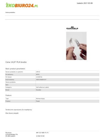 Izabelin 2017-03-08 Karta produktu: Cena 14,07 PLN brutto Basic product parameters Numer produktu w systemie 29572 Nr dostawcy 8078 Nr Celcen 14-00726 Kod kreskowy 4005546805337 Nazwa produktu Opis Kategoria Self-adhesive Labels Brand Durable Feature Type Wzmacniający Product Pasek Serdecznie zapraszamy do współpracy Eko biuro zespół. Eko biuro ul Krasińskiego 23a 05-080 Izabelin NIP: 527-000-75-75 22 864 54 84