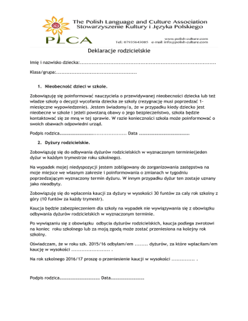 Deklaracje rodzicielskie Imię i nazwisko dziecka:................................................................................. Klasa/grupa:................................................ 1. Nieobecność dzieci w szkole. Zobowiązuję się poinformować nauczyciela o przewidywanej nieobecności dziecka lub też władze szkoły o decyzji wycofania dziecka ze szkoły (rezygnację musi poprzedzać 1miesięczne wypowiedzenie). Jestem świadomy/a, że w przypadku kiedy dziecko jest nieobecne w szkole i jeżeli powstaną obawy o jego bezpieczeństwo, szkoła będzie kontaktować się ze mną w tej sprawie. W razie konieczności szkoła może poinformować o swoich obawach odpowiedni urząd. Podpis rodzica………………………….................... Data ……………………………………… 2. Dyżury rodzicielskie. Zobowiązuję się do odbywania dyżurów rodzicielskich w wyznaczonym terminie(jeden dyżur w każdym trymestrze roku szkolnego). Na wypadek mojej niedyspozycji jestem zobligowany do zorganizowania zastępstwa na moje miejsce we własnym zakresie i poinformowania o zmianach w tygodniu poprzedzającym wyznaczony termin dyżuru. W innym przypadku dyżur ten zostaje uznany jako nieodbyty. Zobowiązuję się do wpłacenia kaucji za dyżury w wysokości 30 funtów za cały rok szkolny z góry (10 funtów za każdy trymestr). Kaucja będzie zabezpieczeniem dla szkoły na wypadek nie wywiązywania się z obowiązku odbywania dyżurów rodzicielskich w wyznaczonym terminie. Po wywiązaniu się z obowiązku odbycia dyżurów rodzicielskich, kaucja podlega zwrotowi na koniec roku szkolnego lub za moją zgodą może zostać przeniesiona na kolejny rok szkolny. Oświadczam, że w roku szk. 2015/16 odbyłam/em ........ dyżurów, za które wpłaciłam/em kaucję w wysokości ....................... . Na rok szkolnego 2016/17 proszę o przeniesienie kaucji w wysokości .............. . Podpis rodzica……………………………… Data………………………… 3. Przestrzeganie regulaminów. Oświadczam, że zapoznałem/am się z Regulaminem rodzicielskim, Regulaminem dyżurów, Regulaminem Ucznia oraz Statutem Polskiej Szkoły Sobotniej przy PLCA i zobowiązuję się do przestrzegania zasad zawartych w powyższych dokumentach. Zobowiązuje się do regularnego odczytywania informacji dotyczących organizacji szkoły przesyłanych do mnie drogą elektorniczną oraz zawartych na stronie internetowej: www.polish-culture.com Podpis rodzica………………………………. Data …………………………………. 4 . Opłata za szkołę. Zobowiązuję się do regularnego uiszczania opłat za szkołę w terminie przewidzianym przez władze szkoły, tj.: Kaucja za dyżury – do 15/10/2016, Za I trymestr – do 31/10/2016, Za II trymestr – do 31/01/2017, Za III trymestr – do 30/04/2017. Opłaty za szkołę zobowiązuję się przekazywać w formie czeku lub wpłacać na konto: Tytuł wpłaty: Nazwisko i imię dziecka oraz numer trymestru, za który należy uiścić opłatę (np.Kowalska Anna, 1 albo Nowak Zbigniew,dep). Account Name: Polish Language & Culture Association (PLCA) Sort Code: 08 – 92 – 99 Account Number: 65686773 Jestem świadomy/a, iż w przypadku nie uiszczenia opłaty w wyznaczonym terminie, zostanie naliczona kara administracyjna do każdej opóźnionej opłaty trymestralnej za każde dziecko w wysokości 10 funtów. Jestem świadomy/a, iż w przypadku nie uiszczenia opłaty w wyznaczonym terminie władze szkoły zastrzegają sobie prawo do wstąpienia na drogę prawną w celu uzyskania należności wraz z zaległymi odsetkami. Podpis rodzica ............................................................. Podpis członka Rady Szkoły............................................... Miejsce i data...............................................................