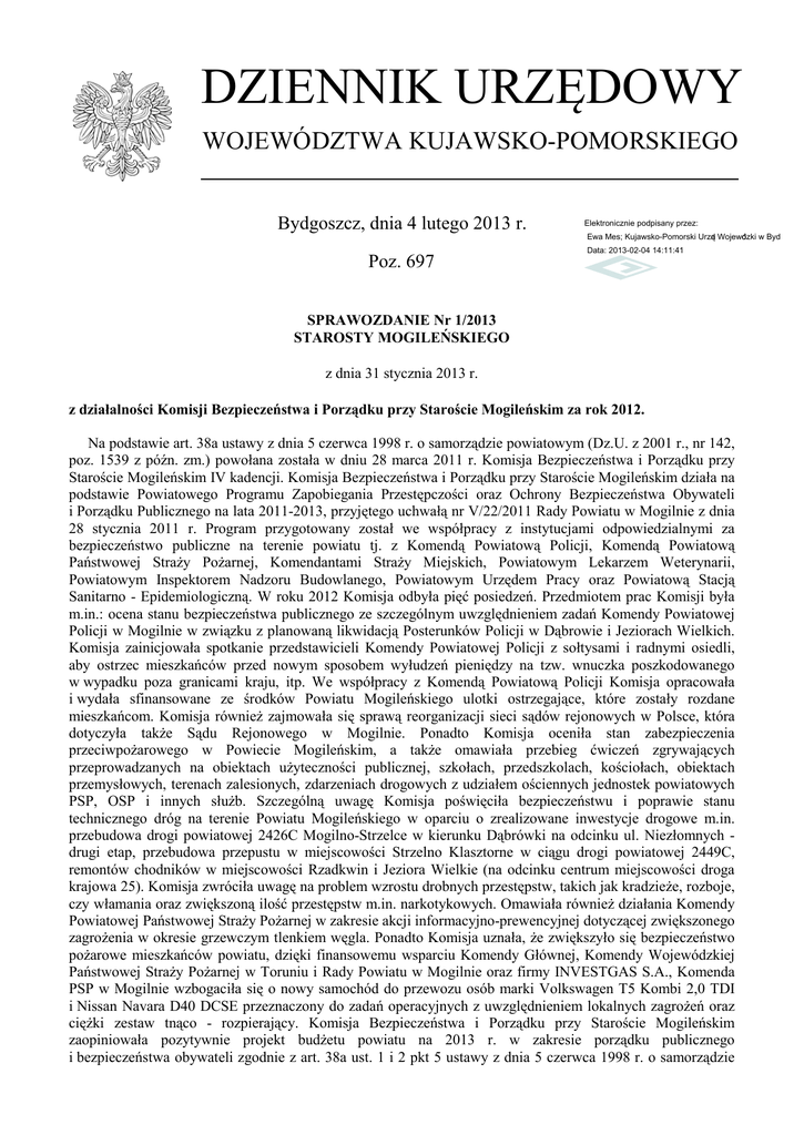 DZIENNIK URZĘDOWY WOJEWÓDZTWA KUJAWSKO-POMORSKIEGO Bydgoszcz, dnia 4 lutego 2013 r. Elektronicznie podpisany przez: Ewa Mes; Kujawsko-Pomorski Urząd Wojewódzki w Bydgoszcz Poz. 697 Data: 2013-02-04 14:11:41 SPRAWOZDANIE Nr 1/2013 STAROSTY MOGILEŃSKIEGO z dnia 31 stycznia 2013 r. z działalności Komisji Bezpieczeństwa i Porządku przy Staroście Mogileńskim za rok 2012. Na podstawie art. 38a ustawy z dnia 5 czerwca 1998 r. o samorządzie powiatowym (Dz.U. z 2001 r., nr 142, poz. 1539 z późn. zm.) powołana została w dniu 28 marca 2011 r. Komisja Bezpieczeństwa i Porządku przy Staroście Mogileńskim IV kadencji. Komisja Bezpieczeństwa i Porządku przy Staroście Mogileńskim działa na podstawie Powiatowego Programu Zapobiegania Przestępczości oraz Ochrony Bezpieczeństwa Obywateli i Porządku Publicznego na lata 2011-2013, przyjętego uchwałą nr V/22/2011 Rady Powiatu w Mogilnie z dnia 28 stycznia 2011 r. Program przygotowany został we współpracy z instytucjami odpowiedzialnymi za bezpieczeństwo publiczne na terenie powiatu tj. z Komendą Powiatową Policji, Komendą Powiatową Państwowej Straży Pożarnej, Komendantami Straży Miejskich, Powiatowym Lekarzem Weterynarii, Powiatowym Inspektorem Nadzoru Budowlanego, Powiatowym Urzędem Pracy oraz Powiatową Stacją Sanitarno - Epidemiologiczną. W roku 2012 Komisja odbyła pięć posiedzeń. Przedmiotem prac Komisji była m.in.: ocena stanu bezpieczeństwa publicznego ze szczególnym uwzględnieniem zadań Komendy Powiatowej Policji w Mogilnie w związku z planowaną likwidacją Posterunków Policji w Dąbrowie i Jeziorach Wielkich. Komisja zainicjowała spotkanie przedstawicieli Komendy Powiatowej Policji z sołtysami i radnymi osiedli, aby ostrzec mieszkańców przed nowym sposobem wyłudzeń pieniędzy na tzw. wnuczka poszkodowanego w wypadku poza granicami kraju, itp. We współpracy z Komendą Powiatową Policji Komisja opracowała i wydała sfinansowane ze środków Powiatu Mogileńskiego ulotki ostrzegające, które zostały rozdane mieszkańcom. Komisja również zajmowała się sprawą reorganizacji sieci sądów rejonowych w Polsce, która dotyczyła także Sądu Rejonowego w Mogilnie. Ponadto Komisja oceniła stan zabezpieczenia przeciwpożarowego w Powiecie Mogileńskim, a także omawiała przebieg ćwiczeń zgrywających przeprowadzanych na obiektach użyteczności publicznej, szkołach, przedszkolach, kościołach, obiektach przemysłowych, terenach zalesionych, zdarzeniach drogowych z udziałem ościennych jednostek powiatowych PSP, OSP i innych służb. Szczególną uwagę Komisja poświęciła bezpieczeństwu i poprawie stanu technicznego dróg na terenie Powiatu Mogileńskiego w oparciu o zrealizowane inwestycje drogowe m.in. przebudowa drogi powiatowej 2426C Mogilno-Strzelce w kierunku Dąbrówki na odcinku ul. Niezłomnych drugi etap, przebudowa przepustu w miejscowości Strzelno Klasztorne w ciągu drogi powiatowej 2449C, remontów chodników w miejscowości Rzadkwin i Jeziora Wielkie (na odcinku centrum miejscowości droga krajowa 25). Komisja zwróciła uwagę na problem wzrostu drobnych przestępstw, takich jak kradzieże, rozboje, czy włamania oraz zwiększoną ilość przestępstw m.in. narkotykowych. Omawiała również działania Komendy Powiatowej Państwowej Straży Pożarnej w zakresie akcji informacyjno-prewencyjnej dotyczącej zwiększonego zagrożenia w okresie grzewczym tlenkiem węgla. Ponadto Komisja uznała, że zwiększyło się bezpieczeństwo pożarowe mieszkańców powiatu, dzięki finansowemu wsparciu Komendy Głównej, Komendy Wojewódzkiej Państwowej Straży Pożarnej w Toruniu i Rady Powiatu w Mogilnie oraz firmy INVESTGAS S.A., Komenda PSP w Mogilnie wzbogaciła się o nowy samochód do przewozu osób marki Volkswagen T5 Kombi 2,0 TDI i Nissan Navara D40 DCSE przeznaczony do zadań operacyjnych z uwzględnieniem lokalnych zagrożeń oraz ciężki zestaw tnąco - rozpierający. Komisja Bezpieczeństwa i Porządku przy Staroście Mogileńskim zaopiniowała pozytywnie projekt budżetu powiatu na 2013 r. w zakresie porządku publicznego i bezpieczeństwa obywateli zgodnie z art. 38a ust. 1 i 2 pkt 5 ustawy z dnia 5 czerwca 1998 r. o samorządzie Dziennik Urzędowy Województwa Kujawsko-Pomorskiego –2– Poz. 697 powiatowym (Dz.U. z 2001 r., nr 142, poz. 1539 z późn. zm.). Ponadto na swych posiedzeniach każdorazowo omawiała sprawy bieżące w zakresie porządku publicznego i bezpieczeństwa obywateli. Przewodniczący Komisji Starosta Tomasz Barczak