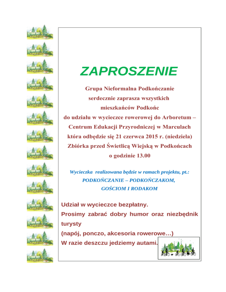 ZAPROSZENIE Grupa Nieformalna Podkończanie serdecznie zaprasza wszystkich mieszkańców Podkońc do udziału w wycieczce rowerowej do Arboretum – Centrum Edukacji Przyrodniczej w Marculach która odbędzie się 21 czerwca 2015 r. (niedziela) Zbiórka przed Świetlicą Wiejską w Podkońcach o godzinie 13.00 Wycieczka realizowana będzie w ramach projektu, pt.: PODKOŃCZANIE – PODKOŃCZAKOM, GOŚCIOM I RODAKOM Udział w wycieczce bezpłatny. Prosimy zabrać dobry humor oraz niezbędnik turysty (napój, ponczo, akcesoria rowerowe…) W razie deszczu jedziemy autami.