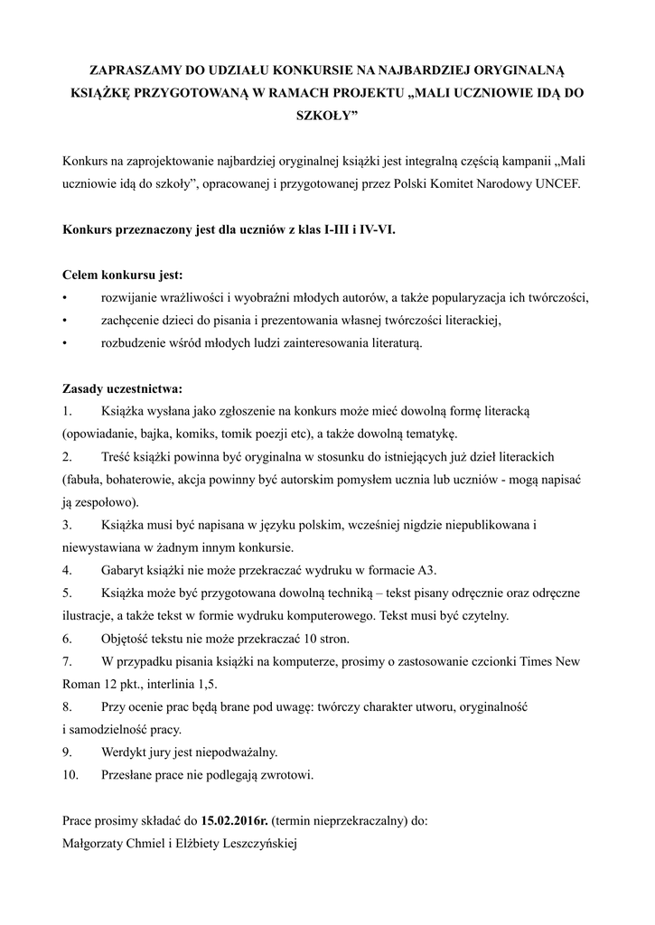 ZAPRASZAMY DO UDZIAŁU KONKURSIE NA NAJBARDZIEJ ORYGINALNĄ KSIĄŻKĘ PRZYGOTOWANĄ W RAMACH PROJEKTU „MALI UCZNIOWIE IDĄ DO SZKOŁY” Konkurs na zaprojektowanie najbardziej oryginalnej książki jest integralną częścią kampanii „Mali uczniowie idą do szkoły”, opracowanej i przygotowanej przez Polski Komitet Narodowy UNCEF. Konkurs przeznaczony jest dla uczniów z klas I-III i IV-VI. Celem konkursu jest: • rozwijanie wrażliwości i wyobraźni młodych autorów, a także popularyzacja ich twórczości, • zachęcenie dzieci do pisania i prezentowania własnej twórczości literackiej, • rozbudzenie wśród młodych ludzi zainteresowania literaturą. Zasady uczestnictwa: 1. Książka wysłana jako zgłoszenie na konkurs może mieć dowolną formę literacką (opowiadanie, bajka, komiks, tomik poezji etc), a także dowolną tematykę. 2. Treść książki powinna być oryginalna w stosunku do istniejących już dzieł literackich (fabuła, bohaterowie, akcja powinny być autorskim pomysłem ucznia lub uczniów - mogą napisać ją zespołowo). 3. Książka musi być napisana w języku polskim, wcześniej nigdzie niepublikowana i niewystawiana w żadnym innym konkursie. 4. Gabaryt książki nie może przekraczać wydruku w formacie A3. 5. Książka może być przygotowana dowolną techniką – tekst pisany odręcznie oraz odręczne ilustracje, a także tekst w formie wydruku komputerowego. Tekst musi być czytelny. 6. Objętość tekstu nie może przekraczać 10 stron. 7. W przypadku pisania książki na komputerze, prosimy o zastosowanie czcionki Times New Roman 12 pkt., interlinia 1,5. 8. Przy ocenie prac będą brane pod uwagę: twórczy charakter utworu, oryginalność i samodzielność pracy. 9. Werdykt jury jest niepodważalny. 10. Przesłane prace nie podlegają zwrotowi. Prace prosimy składać do 15.02.2016r. (termin nieprzekraczalny) do: Małgorzaty Chmiel i Elżbiety Leszczyńskiej