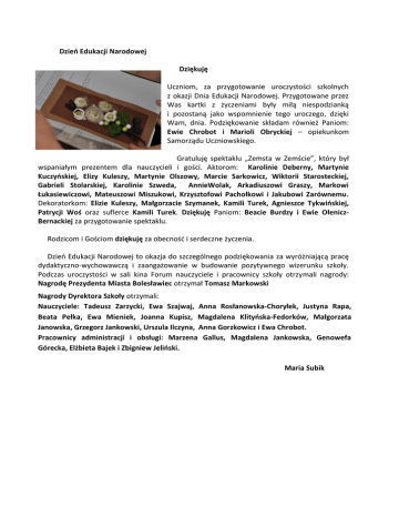 Dzień Edukacji Narodowej Dziękuję Uczniom, za przygotowanie uroczystości szkolnych z okazji Dnia Edukacji Narodowej. Przygotowane przez Was kartki z życzeniami były miłą niespodzianką i pozostaną jako wspomnienie tego uroczego, dzięki Wam, dnia. Podziękowanie składam również Paniom: Ewie Chrobot i Marioli Obryckiej – opiekunkom Samorządu Uczniowskiego. Gratuluję spektaklu „Zemsta w Zemście”, który był wspaniałym prezentem dla nauczycieli i gości. Aktorom: Karolinie Deberny, Martynie Kuczyńskiej, Elizy Kuleszy, Martynie Olszowy, Marcie Sarkowicz, Wiktorii Starosteckiej, Gabrieli Stolarskiej, Karolinie Szweda, AnnieWolak, Arkadiuszowi Graszy, Markowi Łukasiewiczowi, Mateuszowi Miszukowi, Krzysztofowi Pachołkowi i Jakubowi Zarównemu. Dekoratorkom: Elizie Kuleszy, Małgorzacie Szymanek, Kamili Turek, Agnieszce Tykwińskiej, Patrycji Woś oraz suflerce Kamili Turek. Dziękuję Paniom: Beacie Burdzy i Ewie OłeniczBernackiej za przygotowanie spektaklu. Rodzicom i Gościom dziękuję za obecność i serdeczne życzenia. Dzień Edukacji Narodowej to okazja do szczególnego podziękowania za wyróżniającą pracę dydaktyczno-wychowawczą i zaangażowanie w budowanie pozytywnego wizerunku szkoły. Podczas uroczystości w sali kina Forum nauczyciele i pracownicy szkoły otrzymali nagrody: Nagrodę Prezydenta Miasta Bolesławiec otrzymał Tomasz Markowski Nagrody Dyrektora Szkoły otrzymali: Nauczyciele: Tadeusz Zarzycki, Ewa Szajwaj, Anna Rosłanowska-Choryłek, Justyna Rapa, Beata Pełka, Ewa Mieniek, Joanna Kupisz, Magdalena Klityńska-Fedorków, Małgorzata Janowska, Grzegorz Jankowski, Urszula Ilczyna, Anna Gorzkowicz i Ewa Chrobot. Pracownicy administracji i obsługi: Marzena Gallus, Magdalena Jankowska, Genowefa Górecka, Elżbieta Bajek i Zbigniew Jeliński. Maria Subik