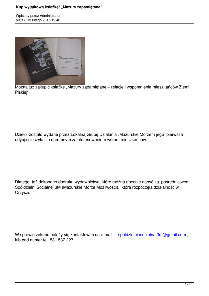 Kup wyjątkową książkę! „Mazury zapamiętane” Wpisany przez Administrator piątek, 13 lutego 2015 19:48 Można już zakupić książkę „Mazury zapamiętane – relacje i wspomnienia mieszkańców Ziemi Piskiej”. Dzieło zostało wydane przez Lokalną Grupę Działania „Mazurskie Morze” i jego pierwsza edycja cieszyła się ogromnym zainteresowaniem wśród mieszkańców. Dlatego też dokonano dodruku wydawnictwa, które można obecnie nabyć za pośrednictwem Spółdzielni Socjalnej 3M (Mazurskie Morze Możliwości), która rozpoczęła działalność w Orzyszu. W sprawie zakupu należy się kontaktować na e-mail: lub pod numer tel. 531 537 227. [email protected] , 1/2 Kup wyjątkową książkę! „Mazury zapamiętane” Wpisany przez Administrator piątek, 13 lutego 2015 19:48 Natomiast już w marcu będzie można zakupić książkę w sklepie prowadzonym przez Spółdzielnię w Orzyszu, przy ul. Ełckiej 2. Zapraszamy. 2/2