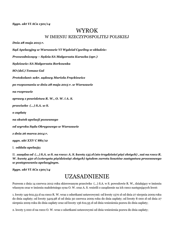 Sygn. akt VI ACa 1301/14 WYROK W IMIENIU RZECZYPOSPOLITEJ POLSKIEJ Dnia 28 maja 2015 r. Sąd Apelacyjny w Warszawie VI Wydział Cywilny w składzie: Przewodniczący – Sędzia SA Małgorzata Kuracka (spr.) Sędziowie: SA Małgorzata Borkowska SO (del.) Tomasz Gal Protokolant: sekr. sądowy Mariola Frąckiewicz po rozpoznaniu w dniu 28 maja 2015 r. w Warszawie na rozprawie sprawy z powództwa R. W., O. W. i A. S. przeciwko (...) S.A. w S. o zapłatę na skutek apelacji pozwanego od wyroku Sądu Okręgowego w Warszawie z dnia 26 marca 2014 r. sygn. akt XXV C 881/12 I. oddala apelację; II. zasądza od (...) S.A. w S. na rzecz: A. S. kwotę 135 zł (sto trzydzieści pięć złotych) , zaś na rzecz R. W. kwotę 450 zł (czterysta pięćdziesiąt złotych) tytułem zwrotu kosztów zastępstwa procesowego w postępowaniu apelacyjnym. Sygn. akt VI ACa 1301/14 UZASADNIENIE Pozwem z dnia 14 czerwca 2012 roku skierowanym przeciwko (...) S.A. w S. powodowie R. W., działający w imieniu własnym oraz w imieniu małoletniego syna O. W. oraz A. S. wnieśli o zasądzenie na ich rzecz następujących kwot: 1. kwoty 149 602,53 zł na rzecz R. W. wraz z odsetkami ustawowymi: od kwoty 1570 zł od dnia 27 sierpnia 2009 roku do dnia zapłaty; od kwoty 3419,98 zł od dnia 30 czerwca 2009 roku do dnia zapłaty; od kwoty 8 000 zł od dnia 27 sierpnia 2009 roku do dnia zapłaty oraz od kwoty 136 612,55 zł od dnia wniesienia pozwu do dnia zapłaty; 2. kwoty 5 000 zł na rzecz O. W. wraz z odsetkami ustawowymi od dnia wniesienia pozwu do dnia zapłaty; 3. kwota 46 213,25 zł na rzecz A. S. wraz z odsetkami ustawowymi: od kwoty 905 zł od dnia 27 sierpnia 2009 roku do dnia zapłaty; od kwoty 5 000 zł od dnia wniesienia pozwu do dnia zapłaty ; od kwoty 9 000 zł od dnia 27 sierpnia 2009 roku do dnia zapłaty oraz od kwoty 31 308,25 zł od dnia wniesienia pozwu do dnia zapłaty. Pozwana wnosiła o oddalenie powództwa, a także o zasądzenie od powodów na jej rzecz kosztów procesu. Wyrokiem z dnia 26 marca 2014 r. Sąd Okręgowy w Warszawie zasądził od pozwanego na rzecz R. W. tytułem odszkodowania kwotę 1 570 złotych wraz z ustawowymi odsetkami: - od kwoty 1170 złotych od dnia 27 sierpnia 2009 r. do dnia zapłaty, - od kwoty 400 złotych od dnia 3 sierpnia 2012 r. do dnia zapłaty (pkt 1); zasądził od pozwanego na rzecz R. W. tytułem zadośćuczynienia kwotę 8000 złotych wraz z ustawowymi odsetkami od dnia 3 sierpnia 2012 r. do dnia zapłaty (pkt 2); oddalił powództwo R. W. w pozostałym zakresie (pkt 3); zasądził od pozwanego na rzecz O. W. tytułem zadośćuczynienia kwotę 3000 złotych wraz z ustawowymi odsetkami od dnia 3 sierpnia 2012 r. do dnia zapłaty (pkt 4); oddalił powództwo O. W. w pozostałym zakresie (pkt 5); zasądził od pozwanego na rzecz A. S. tytułem odszkodowania kwotę 4255 złotych wraz z ustawowymi odsetkami: - od kwoty 825 złotych od dnia 27 sierpnia 2009.r. do dnia zapłaty, - od kwoty 3430 złotych od dnia 3 sierpnia 2012 r. do dnia zapłaty (pkt 6); zasądził od pozwanego na rzecz A. S. tytułem zadośćuczynienia kwotę 9000 złotych wraz z ustawowymi odsetkami od dnia 3 sierpnia 2012 r. do dnia zapłaty (pkt 7); oddalił powództwo A. S. w pozostałym zakresie (pkt 8); zasądził od pozwanego na rzecz O. W. kwotę 750 złotych tytułem kosztów procesu (pkt 9); nie obciążył R. W. i A. S. obowiązkiem zwrotu kosztów postępowania na rzecz pozwanego (pkt 10). Sąd Okręgowy ustalił, że w dniu 14 czerwca 2009 roku około godziny 23, na drodze (...), gmina M., J. C. kierując samochodem osobowym marki P. (...) nieumyślnie naruszył zasady w ruchu lądowym i spowodował wypadek drogowy, w ten sposób, że wykonując manewr wyprzedzania samochodu ciężarowego nie zachował szczególnej uwagi i zderzył się z jadącym z przeciwka samochodem osobowym marki V. (...) o nr rej. (...), którym kierował R. W., w wyniku czego kierowca R. W. i pasażerka samochodu marki V. A. S. doznali obrażeń ciała. A. S. doznała obrażeń ciała w postaci stłuczenia powłok klatki piersiowej po stronie prawej, urazu prawego stawu kolanowego, uszkodzenia wiązadła krzyżowego przedniego, krwiaka stawu i rozerwania torebki stawowej okolicy kłykcia bocznego piszczeli, które to obrażenia zaburzają prawidłowe funkcje organizmu na okres dłuższy niż 7 dni. R. W. doznał obrażeń ciała w postaci stłuczenia głowy w okolicy czołowej, urazu stawu kolanowego prawego z uszkodzeniem więzadła krzyżowego przedniego, łękotki przyśrodkowej z krwiakiem w stawie kolanowym oraz stłuczenia tkanek miękkich więzadeł stawu z rozerwaniem torebki stawowej, które to obrażenia zaburzają prawidłowe funkcje organizmu na okres dłuższy niż 7 dni. Drugi pasażer samochodu V. małoletni O. W. bezpośrednio po wypadku w dniu 14 czerwca 2009 roku skarżył się na ból okolicy pośladków i okolic krzyżowych. Był także niespokojny. A. S., R. W. i O. W. bezpośrednio po wypadku zostali przewiezieni do szpitala w M., który opuścili po udzieleniu im doraźnej pomocy tej samej nocy z 14/15 czerwca 2009 roku. R. W. bezpośrednio po wypadku skarżył się na ból okolicy czołowej i kolana, ogólne potłuczenia. Badanie ultrasonograficzne wykonane w dniu 15 czerwca 2009 roku wykazało: zwiększoną ilość płynu w stawie kolanowym prawym, błonę maziową z cechami przerostu w części bocznej zachyłka górnego, cechy nieznacznego powiększenia kaletki przedrzepkowej podskórnej, zmiany osteofityczne w przyczepie ścięgna mięśnia czworogłowego w części bocznej przyczepu, wiązadło poboczne piszczelowe w części bliższej z cechami uszkodzenia I na II stopień, zerwanie całkowite wiązadła krzyżowego przedniego w badaniu dynamicznym. Nadto badanie wskazywało na: łąkotkę przyśrodkową z cechami zmian degeneracyjnych - z cechami poziomego uszkodzenia idącego ku trzonowi, łąkotkę boczną z cechami zmian degeneracyjnych - bez cech uszkodzenia, chrząstkę szklist