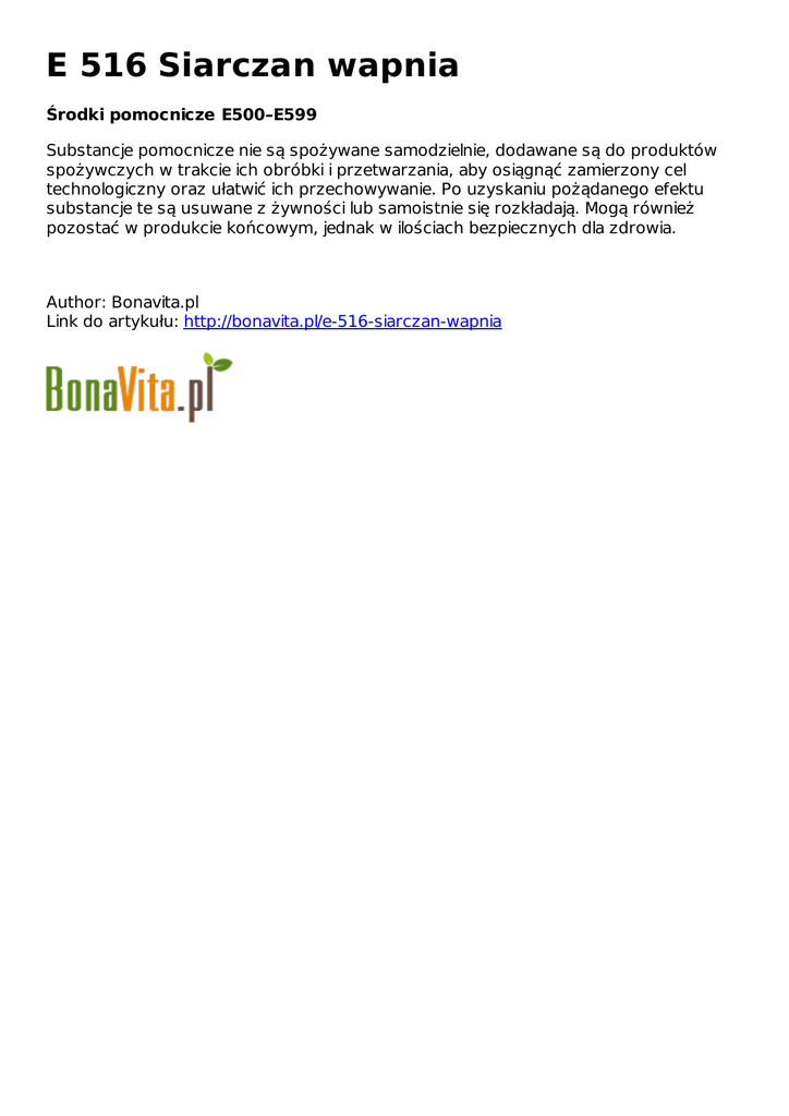 E 516 Siarczan wapnia Środki pomocnicze E500–E599 Substancje pomocnicze nie są spożywane samodzielnie, dodawane są do produktów spożywczych w trakcie ich obróbki i przetwarzania, aby osiągnąć zamierzony cel technologiczny oraz ułatwić ich przechowywanie. Po uzyskaniu pożądanego efektu substancje te są usuwane z żywności lub samoistnie się rozkładają. Mogą również pozostać w produkcie końcowym, jednak w ilościach bezpiecznych dla zdrowia. Author: Bonavita.pl Link do artykułu: http://bonavita.pl/e-516-siarczan-wapnia