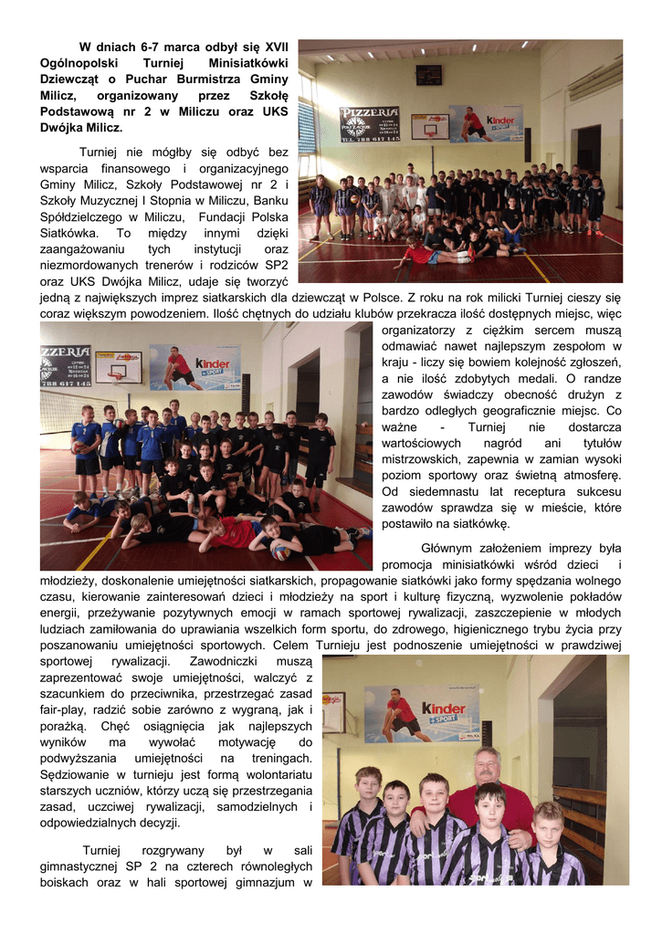 W dniach 6-7 marca odbył się XVII Ogólnopolski Turniej Minisiatkówki Dziewcząt o Puchar Burmistrza Gminy Milicz, organizowany przez Szkołę Podstawową nr 2 w Miliczu oraz UKS Dwójka Milicz. Turniej nie mógłby się odbyć bez wsparcia finansowego i organizacyjnego Gminy Milicz, Szkoły Podstawowej nr 2 i Szkoły Muzycznej I Stopnia w Miliczu, Banku Spółdzielczego w Miliczu, Fundacji Polska Siatkówka. To między innymi dzięki zaangażowaniu tych instytucji oraz niezmordowanych trenerów i rodziców SP2 oraz UKS Dwójka Milicz, udaje się tworzyć jedną z największych imprez siatkarskich dla dziewcząt w Polsce. Z roku na rok milicki Turniej cieszy się coraz większym powodzeniem. Ilość chętnych do udziału klubów przekracza ilość dostępnych miejsc, więc organizatorzy z ciężkim sercem muszą odmawiać nawet najlepszym zespołom w kraju - liczy się bowiem kolejność zgłoszeń, a nie ilość zdobytych medali. O randze zawodów świadczy obecność drużyn z bardzo odległych geograficznie miejsc. Co ważne Turniej nie dostarcza wartościowych nagród ani tytułów mistrzowskich, zapewnia w zamian wysoki poziom sportowy oraz świetną atmosferę. Od siedemnastu lat receptura sukcesu zawodów sprawdza się w mieście, które postawiło na siatkówkę. Głównym założeniem imprezy była promocja minisiatkówki wśród dzieci i młodzieży, doskonalenie umiejętności siatkarskich, propagowanie siatkówki jako formy spędzania wolnego czasu, kierowanie zainteresowań dzieci i młodzieży na sport i kulturę fizyczną, wyzwolenie pokładów energii, przeżywanie pozytywnych emocji w ramach sportowej rywalizacji, zaszczepienie w młodych ludziach zamiłowania do uprawiania wszelkich form sportu, do zdrowego, higienicznego trybu życia przy poszanowaniu umiejętności sportowych. Celem Turnieju jest podnoszenie umiejętności w prawdziwej sportowej rywalizacji. Zawodniczki muszą zaprezentować swoje umiejętności, walczyć z szacunkiem do przeciwnika, przestrzegać zasad fair-play, radzić sobie zarówno z wygraną, jak i porażką. Chęć osiągnięcia jak najlepszych wyników ma wywołać motywację do podwyższania umiejętności na treningach. Sędziowanie w turnieju jest formą wolontariatu starszych uczniów, którzy uczą się przestrzegania zasad, uczciwej rywalizacji, samodzielnych i odpowiedzialnych decyzji. Turniej rozgrywany był w sali gimnastycznej SP 2 na czterech równoległych boiskach oraz w hali sportowej gimnazjum w Miliczu na 7 równoległych boiskach. Mecze sędziowali uczniowie SOS-u mieszczącego się przy Gimnazjum w Miliczu, byli uczniowie z klas sportowych Dwójki. Otwarcie turnieju uświetnił występ duetu Paweł Rząsa i Marcin Szafran oraz instruktorka Zumby - Asia Ludwiczak. Nad prawidłowym przebiegiem imprezy czuwają wszyscy nauczyciele wychowania fizycznego w SP 2. Organizację Turnieju wspierają pracownicy obsługi i administracji szkoły. Oficjalnego otwarcia Turnieju dokonała dyrektor Szkoły Podstawowej nr 2 i Szkoły Muzycznej I Stopnia w Miliczu Jolanta Wybierała, a podsumowania, wręczenia medali, pucharów, dyplomów i nagród dokonał: Burmistrz Gminy Milicz Piotr Lech. Podczas uroczystości zakończenia Turnieju Burmistrzowi Piotrowi Lechowi w dowód uznania i podziękowania za wieloletnią pracę dla dobra polskiej siatkówki, w imieniu Fundacji Polska Siatkówka oraz Polskiego Związku Piłki Siatkowej, z okazji obchodów XX – lecia Minisiatkówki i przypadającego 9 marca XX-lecia UKS Dwójka Milicz, wręczono okolicznościowy medal oraz list gratulacyjny podpisany przez Prezesa Zarządu Fundacji Polska Siatkówka Pana Tadeusza Sąsarę. Klasyfikacja końcowa klas IV 1. 2. 3. 4. 5. 6. 7. 8. 9. 10. 11. 12. 13. 14. 15. 16. 17. 18. 19. 20. 21. 22. 23. 24. 25. 26. 27. 28. 29. MKS MOS Wieliczka I NOSiR Nowy Dwór Mazowiecki I MKS MOS Wieliczka III SP Kosieczyn I SP 87 Kraków I SP 87 Kraków II UKS Dwójka Milicz I UKS Trójka Sulechów I MKS MOS Wieliczka II UKS Pogodno SP 48 Szczecin NOSiR Nowy Dwór Mazowiecki II MUKS Sari Żory II MUKS Sari Żory I UKS Ares Nowa Sól I UKS Polon Krotoszyn II UKS Polon Krotoszyn I SP Kosieczyn II UKS Dwójka Milicz II UKS 22 Kraków I UKS 22 Kraków II SP 6 Kołobrzeg UKS Volley Wałcz I UKS Dwójka Milicz V UKS Trójka Sulechów II UKS Volley Wałcz II UKS Ares Nowa Sól II PSP 11 Kędzierzyn- Koźle I UKS Dwójka Milicz III UKS Dwójka Milicz IV Klasyfikacja końcowa klas V 1. SP 6 Jastrzębie Zdrój I 2. UKS BARNIM Goleniów I 3. UKS 22 Kraków I 3. UKS Volley Wałcz I 5. UKS Dwójka Milicz I 6. PSP 11 Kędzierzyn Koźle I 7. SP 87 Kraków I 8. MKS MOS Wieliczka I 9. SP Kosieczyn I 10. MUKS Sari Żory I 11. UKS Volley Wałcz II 12. UKS Dwójka Milicz II 13. SP 1 Sulechów 14. UKS Trójka Sulechów III 15. MUKS Sari Żory II 16. UKS Dwójka Milicz III 17. SP 6 Jastrzębie Zdrój II 18. SP 8 Krotoszyn I 19. UKS Trójka Sulechów I 20. UKS Trójka Sulechów II 21. SP 8 Krotoszyn II 22. SP 87 Kraków II 23. PSP 11 Kędzierzyn Koźle II Klasyfikacja końcowa klas VI 1. SP Kosieczyn 2. UKS Pogodno SP 48 Szczecin 3. MKS MOS Wieliczka I 4. PSP 11 Kędzierzyn- Koźle I 5. UKS Ares Nowa Sól II 6. MKS MOS Wieliczka II 7. UKS Volley Wałcz 8. UKS Trójka Sulechów I 9. UKS Trójka Sulechów II 10. SP 87 Kraków 11. MLKS Echo Twardogóra 12. UKS 22 Kraków 13. OPP Kołobrzeg 14. UKS Dwójka Milicz I 15. PSP 11 Kędzierzyn- Koźle II 16. UKS Dwójka Milicz II 16. UKS Ares Nowa Sól I