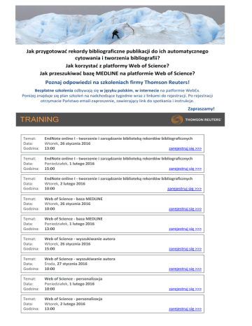 Jak przygotować rekordy bibliograficzne publikacji do ich automatycznego cytowania i tworzenia bibliografii? Jak korzystać z platformy Web of Science? Jak przeszukiwać bazę MEDLINE na platformie Web of Science? Poznaj odpowiedzi na szkoleniach firmy Thomson Reuters! Bezpłatne szkolenia odbywają się w języku polskim, w internecie na patformie WebEx. Poniżej znajduje się plan szkoleń na nadchodzące tygodnie wraz z linkami do rejestracji. Po rejestracji otrzymacie Państwo email-zaproszenie, zawierający link do spotkania i instrukcje. Zapraszamy! Temat: Data: Godzina: EndNote online I - tworzenie i zarządzanie biblioteką rekordów bibliograficznych Wtorek, 26 stycznia 2016 13:00 zarejestruj się >>> Temat: Data: Godzina: EndNote online I - tworzenie i zarządzanie biblioteką rekordów bibliograficznych Poniedziałek, 1 lutego 2016 15:00 zarejestruj się >>> Temat: Data: Godzina: EndNote online I - tworzenie i zarządzanie biblioteką rekordów bibliograficznych Wtorek, 2 lutego 2016 10:00 zarejestruj się >>> Temat: Data: Godzina: Web of Science - baza MEDLINE Wtorek, 26 stycznia 2016 10:00 zarejestruj się >>> Temat: Data: Godzina: Web of Science - baza MEDLINE Poniedziałek, 1 lutego 2016 13:00 zarejestruj się >>> Temat: Data: Godzina: Web of Science - wyszukiwanie autora Wtorek, 26 stycznia 2016 15:00 zarejestruj się >>> Temat: Data: Godzina: Web of Science - wyszukiwanie autora Środa, 27 stycznia 2016 10:00 zarejestruj się >>> Temat: Data: Godzina: Web of Science - personalizacja Poniedziałek, 1 lutego 2016 10:00 zarejestruj się >>> Temat: Data: Godzina: Web of Science - personalizacja Wtorek, 2 lutego 2016 13:00 zarejestruj się >>>