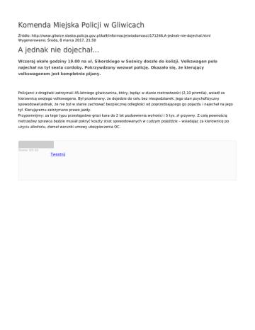 Komenda Miejska Policji w Gliwicach Źródło: http://www.gliwice.slaska.policja.gov.pl/ka9/informacje/wiadomosci/171246,A-jednak-nie-dojechal.html Wygenerowano: Środa, 8 marca 2017, 21:50 A jednak nie dojechał... Wczoraj około godziny 19.00 na ul. Sikorskiego w Sośnicy doszło do kolizji. Volkswagen polo najechał na tył seata cordoby. Pokrzywdzony wezwał policję. Okazało się, że kierujący volkswagenem jest kompletnie pijany. Policjanci z drogówki zatrzymali 45-letniego gliwiczanina, który, będąc w stanie nietrzeźwości (2,10 promila), wsiadł za kierownicę swojego volkswagena. Był przekonany, że dojedzie do celu bez niespodzianek. Jego stan psychofizyczny spowodował jednak, że nie był w stanie zachować bezpiecznej odległości od poprzedzającego go pojazdu i najechał na jego tył. Kierującemu zatrzymano prawo jazdy. Przypomnijmy: za tego typu przestępstwo grozi kara do 2 lat pozbawienia wolności i 5 tys. zł grzywny. Z całą pewnością nietrzeźwy sprawca będzie musiał pokryć koszty strat spowodowanych w cudzym pojeździe – wsiadając za kierownicę po użyciu alkoholu, złamał warunki umowy ubezpieczenia OC. Ocena: 0/5 (0) Tweetnij