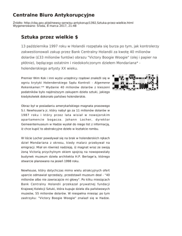Centralne Biuro Antykorupcyjne Źródło: http://cba.gov.pl/pl/newsy-serwisu-antykorup/1392,Sztuka-przez-wielkie.html Wygenerowano: Środa, 8 marca 2017, 21:48 Sztuka przez wielkie $ 13 października 1997 roku w Holandii rozpętała się burza po tym, jak kontrolerzy zakwestionowali zakup przez Bank Centralny Holandii za kwotę 40 milionów dolarów (£33 milionów funtów) obrazu "Victory Boogie Woogie" (olej i papier na płótnie), będącego ostatnim i niedokończonym dziełem Mondariana* holenderskiego artysty XX wieku. Premier Wim Kok i inni wyżsi urzędnicy rządowi znaleźli się w ogniu krytyki Holenderskiego Sądu Kontroli - Algemene Rekenkamer.** Wydanie 40 milionów dolarów z kieszeni podatników było najdroższym zakupem dzieła sztuki, jakiego kiedykolwiek dokonało państwo holenderskie. Obraz był w posiadaniu amerykańskiego magnata prasowego S.I. Newhouse'a jr, który nabył go za 11 milionów dolarów w 1987 roku i który przez lata wisiał w nowojorskim apartamencie bogacza. Johann Locher, dyrektor Gemeentemuseum w Hadze wysłał do niego list z informacją, iż chce kupić to abstrakcyjne dzieło w kształcie rombu. W liście Locher powoływał się na brak w holenderskich rękach dzieł Mondariana z okresu, kiedy malarz przebywał na emigracji. Miał on również nadzieję, iż magnat wraz ze swoją żoną Victorią przychylnym okiem spojrzą na nowopowstały budynek muzeum dzieła architekta H.P. Berlage'a, którego otwarcie planowano na jesień 1998 roku. Newhouse, który dotychczas mimo wielu atrakcyjnych ofert uparcie odmawiał sprzedaży, przedstawił muzeum deal - "40 milionów albo nie zawracajcie mi głowy". Po kilku miesiącach Bank Centralny Holandii przekazał prywatnej fundacji Krajowej Kolekcji Sztuki, która kupuje dzieła dla państwowych muzeów, 55 milionów dolarów. W niespełna miesiąc po tym zastrzyku: "Victory Boogie Woogie" znalazł się w Hadze. Sporny obraz Victory Boogie Woogie127x127 cm Obraz był jednym z 13 sprzedanych za ponad 30 milionów od roku 1990, a więc od krachu na rynku sztuki. Dzieło to uważa się za rzadki wyraz optymizmu w sztuce po zakończeniu drugiej wojny światowej. Jednak niewielu Holendrów na wiadomość o tym zakupie chciało znów zatańczyć ludowy taniec jig. Dla przeciętnego Holendra było rzeczą oburzającą, że nabyto go za cenę czterokrotnie wyższą niż rekordowa cena zapłacona za inny obraz Mandariana "Façade in Tan and Grey" w domu aukcyjnym Sotheby's w 1989 roku. Oliwy do ognia dolała informacja, że Newhouse zyskał na tym obrazie 29 milionów dolarów. Audytorzy państwowi uznali, iż premier i dwóch innych wysokich rangą urzędników przekroczyli swoje uprawnienia przepłacając za obraz. Co więcej Bank Centralny zakupił "Victory Boogie Woogie" z pieniędzy pochodzących z zysków za rok 1998. Ponadto Bank powinien profit przekazać Skarbowi Państwa, a nie prywatnym instytucjom. A miało być tak pięknie. De Nederlandsche Bank pragnął, aby niedokończony obraz z 1944 roku uświetnił w 1999 roku historyczne przyjęcie euro jako jedyną jednostkę monetarną w Holandii. Mimo, iż zażarte publiczne debaty na temat zasług dla dziedzictwa kulturowego są częstą przypadłością Holandii, rzadko zdarza się, by w kłótniach uczestniczyły najważniejsze osoby w państwie, w tym przypadku premier, minister finansów i prezydent Banku Centralnego Holandii. * Piet Mondarian (1872-1944) - holenderski malarz i teoretyk sztuki. Pionier abstrakcji geometrycznej w malarstwie, wywarł wpływ na architekturę współczesną. Współzałożyciel grupy De Stlij ** Algemene Rekenkamer - instytucja powstała w 1814 roku jako organ niezależny od rządu i parlamentu, dokonuje kontroli pod względem efektywności i legalności, nie ma jednak uprawnień sądowniczych i nie może karać osób odpowiedzialnych za wydatki publiczne Źródła: portalwiedzy.onet.pl; sigmaweb.org; archives.tcm.ie; encyclopedia.com; artnet.com Opublikowano 13.10.2014 na www.antykorupcja.gov.pl oprac. Wydział Informacji i Edukacji Antykorupcyjnej GSz CBA