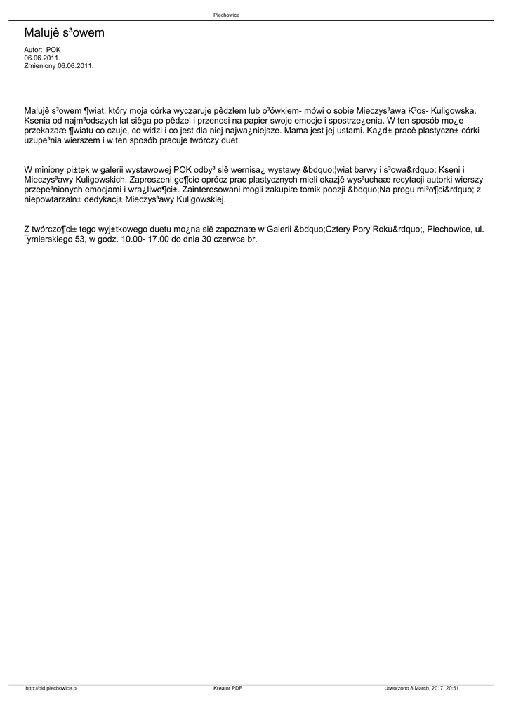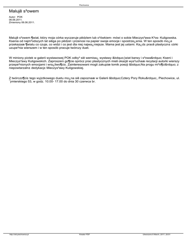 Piechowice Malujê s³owem Autor: POK 06.06.2011. Zmieniony 06.06.2011. Malujê s³owem ¶wiat, który moja córka wyczaruje pêdzlem lub o³ówkiem- mówi o sobie Mieczys³awa K³os- Kuligowska. Ksenia od najm³odszych lat siêga po pêdzel i przenosi na papier swoje emocje i spostrze¿enia. W ten sposób mo¿e przekazaæ ¶wiatu co czuje, co widzi i co jest dla niej najwa¿niejsze. Mama jest jej ustami. Ka¿d± pracê plastyczn± córki uzupe³nia wierszem i w ten sposób pracuje twórczy duet. W miniony pi±tek w galerii wystawowej POK odby³ siê wernisa¿ wystawy „¦wiat barwy i s³owa” Kseni i Mieczys³awy Kuligowskich. Zaproszeni go¶cie oprócz prac plastycznych mieli okazjê wys³uchaæ recytacji autorki wierszy przepe³nionych emocjami i wra¿liwo¶ci±. Zainteresowani mogli zakupiæ tomik poezji „Na progu mi³o¶ci” z niepowtarzaln± dedykacj± Mieczys³awy Kuligowskiej. Z twórczo¶ci± tego wyj±tkowego duetu mo¿na siê zapoznaæ w Galerii „Cztery Pory Roku”, Piechowice, ul. ¯ymierskiego 53, w godz. 10.00- 17.00 do dnia 30 czerwca br. http://old.piechowice.pl Kreator PDF Utworzono 8 March, 2017, 20:51