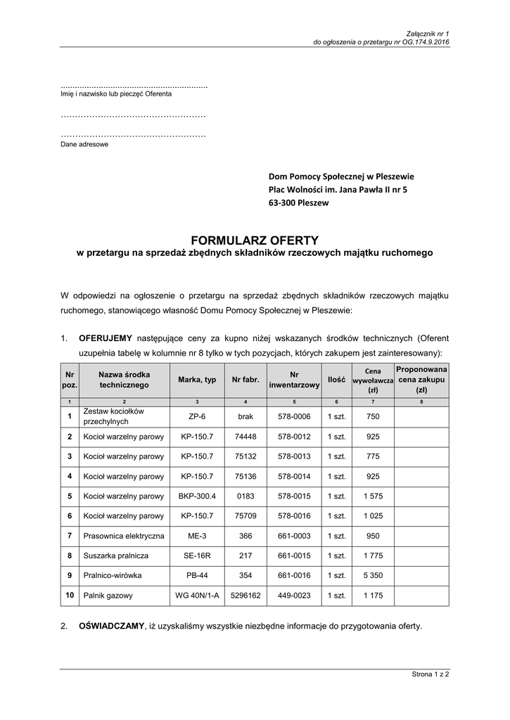 FORMULARZ OFERTY - Dom Pomocy Społecznej w Pleszewie
