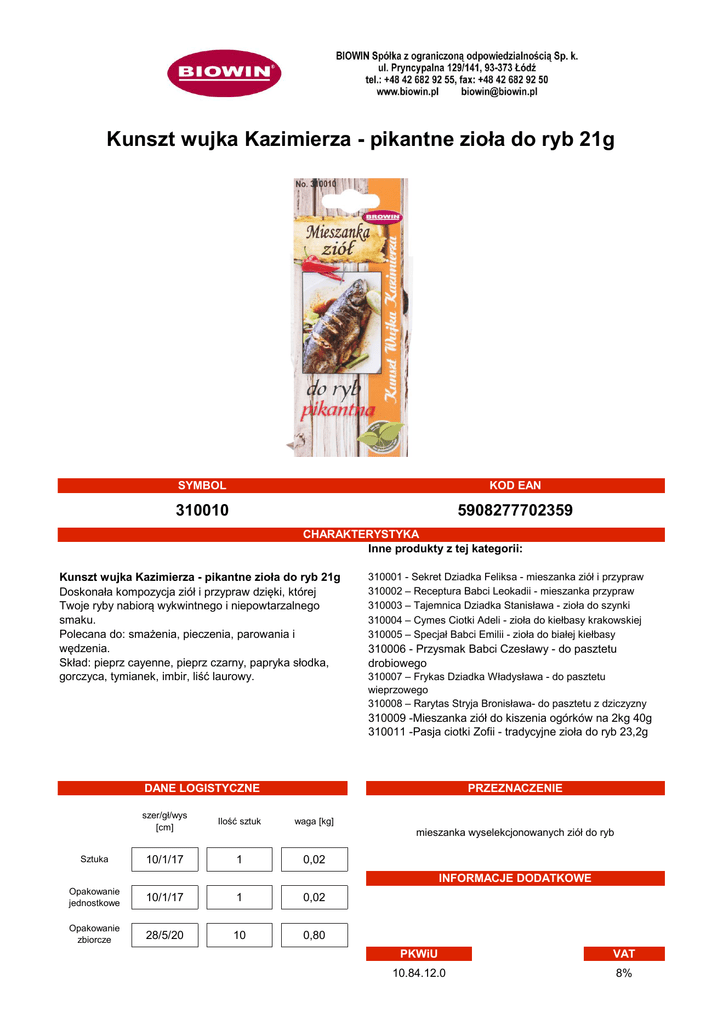 Kunszt wujka Kazimierza - pikantne zioła do ryb 21g SYMBOL KOD EAN 310010 5908277702359 CHARAKTERYSTYKA Inne produkty z tej kategorii: Kunszt wujka Kazimierza - pikantne zioła do ryb 21g Doskonała kompozycja ziół i przypraw dzięki, której Twoje ryby nabiorą wykwintnego i niepowtarzalnego smaku. Polecana do: smażenia, pieczenia, parowania i wędzenia. Skład: pieprz cayenne, pieprz czarny, papryka słodka, gorczyca, tymianek, imbir, liść laurowy. 310001 - Sekret Dziadka Feliksa - mieszanka ziół i przypraw 310002 – Receptura Babci Leokadii - mieszanka przypraw 310003 – Tajemnica Dziadka Stanisława - zioła do szynki 310004 – Cymes Ciotki Adeli - zioła do kiełbasy krakowskiej 310005 – Specjał Babci Emilii - zioła do białej kiełbasy 310006 - Przysmak Babci Czesławy - do pasztetu drobiowego 310007 – Frykas Dziadka Władysława - do pasztetu wieprzowego 310008 – Rarytas Stryja Bronisława- do pasztetu z dziczyzny 310009 -Mieszanka ziół do kiszenia ogórków na 2kg 40g 310011 -Pasja ciotki Zofii - tradycyjne zioła do ryb 23,2g DANE LOGISTYCZNE Sztuka szer/gł/wys [cm] Ilość sztuk 10/1/17 1 PRZEZNACZENIE waga [kg] mieszanka wyselekcjonowanych ziół do ryb 0,02 INFORMACJE DODATKOWE Opakowanie jednostkowe 10/1/17 1 0,02 Opakowanie zbiorcze 28/5/20 10 0,80 PKWiU VAT 10.84.12.0 8%