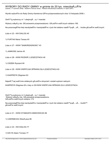 WYBORY DO RADY GMINY w gminie do 20 tys. mieszkaÅ„ców (sobota, 17 czerwiec 2006) - Nades³a³ Dariusz Sowa - Ostatnia aktualizacja (niedziela, 01 lipiec 2007) Wyniki wyborów do Rady Gminy Kamienna Góra przeprowadzonych dnia 12 listopada 2006 r. OkrÄ™g wyborczy nr 1 obejmujÄ…cy 1 mandat. Wybory odbyÅ‚y sie. GÅ‚osowanie przeprowadzono. GÅ‚osów ważnych oddano 195. Na poszczególne listy kandydatów i kandydatów z tych list oddano nastÄ™pujÄ…cÄ… liczbie gÅ‚osów ważnych: Lista nr 23 - KW DIALOG 40 1) FURTAK Maria Teresa 40 Lista nr 27 - KWW "SAMORZADNOSC" 43 1) JANKOSZ Janina 43 Lista nr 28 - KWW ROZWÓJ LESZCZYNCA 49 1) CISZEK Ryszard 49 Lista nr 29 - KWW WSPÓLNA SPRAWA DLA LESZCZYNCA 63 1) KASPRZYK Zbigniew 63 NajwiÄ™cej ważnie oddanych gÅ‚osów otrzymali i zostali wybrani radnymi: KASPRZYK Zbigniew 63 z listy nr 29 KWW WSPÓLNA SPRAWA DLA LESZCZYNCA OkrÄ™g wyborczy nr 2 obejmujÄ…cy 1 mandat. Wybory odbyÅ‚y sie. GÅ‚osowanie przeprowadzono. GÅ‚osów ważnych oddano 173 Na poszczególne listy kandydatów i kandydatów z tych list oddano nastÄ™pujÄ…cÄ… liczbÄ™ gÅ‚osów ważnych: Lista nr 21 - KWW ZYGMUNTA MISKOWICZA 96 1) CZERNECKA WiesÅ‚awa 96 Lista nr 23 - KW DIALOG 77 1) KÅ•YS Adam Tomasz 77 http://kamiennagora.kei.pl - Gmina wiejska Kamienna G�ra Powered by Mambo Generated: 8 March, 2017, 22:51 NajwiÄ™cej ważnie oddanych gÅ‚osów otrzymali i zostali wybrani radnymi: CZERNECKA WiesÅ‚awa 96 z listy nr 21 KWW ZYGMUNTA MISKOWICZA OkrÄ™g wyborczy nr 3 obejmujÄ…cy 1 mandat. Wybory odbyÅ‚y sie. GÅ‚osowania nie przeprowadzono. W zwiÄ…zku z tym, iż w okrÄ™gu wyborczym liczba zarejestrowanych kandydatów jest mniejsza lub równa liczbie mandatów, nastÄ™pujÄ…cy zarejestrowani kandydaci uzyskali mandaty radnego bez przeprowadzenia gÅ‚osowania: Z listy nr 23 KW DIALOG REKIEC Józefa StanisÅ‚awa OkrÄ™g wyborczy nr 4 obejmujÄ…cy 2 mandaty. Wybory odbyÅ‚y sie. GÅ‚osowanie przeprowadzono. GÅ‚osów ważnych oddano 397 Na poszczególne listy kandydatów i kandydatów z tych list oddano nastÄ™pujÄ…cÄ… liczbÄ™ gÅ‚osów ważnych: Lista nr 20 - KWW "WSPÓLNA GMINA" 236 1) Å•EPSKI Jan WÅ‚adysÅ‚aw 236 Lista nr 23 - KW DIALOG 350 1) CIESIELSKI Dobromir StanisÅ‚aw 229 2) PASTUCH Krzysztof Henryk 121 NajwiÄ™cej ważnie oddanych gÅ‚osów otrzymali i zostali wybrani radnymi: CIESIELSKI Dobromir StanisÅ‚aw 229 z listy nr 23 KW DIALOG Å•EPSKI Jan WÅ‚adysÅ‚aw 236 z listy nr 20 KWW "WSPÓLNA GMINA" OkrÄ™g wyborczy nr 5 obejmujÄ…cy 1 mandat. Wybory odbyÅ‚y sie. GÅ‚osowanie przeprowadzono. GÅ‚osów ważnych oddano 188 Na poszczególne listy kandydatów i kandydatów z tych list oddano nastÄ™pujÄ…cÄ… liczbie gÅ‚osów ważnych: http://kamiennagora.kei.pl - Gmina wiejska Kamienna G�ra Powered by Mambo Generated: 8 March, 2017, 22:51 Lista nr 7 - KW SAMOOBRONA RP 41 1) BENC Eugeniusz 41 Lista nr 23 - KW DIALOG 97 1) KOÅ•ODZIEJ Józef Jan 97 Lista nr 26 - KWW NASZ RASZÓW 50 1) KLOCEK Irena 50 NajwiÄ™cej ważnie oddanych gÅ‚osów otrzymali i zostali wybrani radnymi: KOÅ•ODZIEJ Józef Jan 97 z listy nr 23 KW DIALOG OkrÄ™g wyborczy nr 6 obejmujÄ…cy 1 mandat. Wybory odbyÅ‚y sie. GÅ‚osowanie przeprowadzono. GÅ‚osów ważnych oddano 136 Na poszczególne listy kandydatów i kandydatów z tych list oddano nastÄ™pujÄ…cÄ… liczbÄ™ gÅ‚osów ważnych: Lista nr 1 - KOMITET WYBORCZY PSL 90 1) OLSZAK-RZEPIEL Edyta Teresa 90 Lista nr 23 - KW DIALOG 46 1) MAJEWSKI WÅ‚adysÅ‚aw 46 NajwiÄ™cej ważnie oddanych gÅ‚osów otrzymali i zostali wybrani radnymi: OLSZAK-RZEPIEL Edyta Teresa 90 z listy nr 1 KOMITET WYBORCZY PSL OkrÄ™g wyborczy nr 7 obejmujÄ…cy 1 mandat. Wybory odbyÅ‚y sie. GÅ‚osowanie przeprowadzono. GÅ‚osów ważnych oddano 233 http://kamiennagora.kei.pl - Gmina wiejska Kamienna G�ra Powered by Mambo Generated: 8 March, 2017, 22:51 Na poszczególne listy kandydatów i kandydatów z tych list oddano nastÄ™pujÄ…cÄ… liczbÄ™ gÅ‚osów ważnych: Lista nr 22 - KWW RAZEM 131 1) GRON Adam 131 Lista nr 23 - KW DIALOG 102 1) KONCZAK Bożena 102 NajwiÄ™cej ważnie oddanych gÅ‚osów otrzymali i zostali wybrani radnymi: GRON Adam 131 z listy nr 22 KWW RAZEM OkrÄ™g wyborczy nr 8 obejmujÄ…cy 1 mandat. Wybory odbyÅ‚y sie. GÅ‚osowanie przeprowadzono. GÅ‚osów ważnych oddano 235 Na poszczególne listy kandydatów i kandydatów z tych list oddano nastÄ™pujÄ…cÄ… liczbÄ™ gÅ‚osów ważnych: Lista nr 1 - KOMITET WYBORCZY PSL 71 1) IWULSKA Wioletta 71 Lista nr 23 - KW DIALOG 54 1) TOKARSKI Adam Tadeusz 54 Lista nr 25 - KWW NASZ PTASZKÓW 110 1) KALICINSKI Janusz 110 NajwiÄ™cej ważnie oddanych gÅ‚osów otrzymali i zostali wybrani radnymi: KALICINSKI Janusz 110 z listy nr 25 KWW NASZ PTASZKÓW http://kamiennagora.kei.pl - Gmina wiejska Kamienna G�ra Powered by Mambo Generated: 8 March, 2017, 22:51 OkrÄ™g wyborczy nr 9 obejmujÄ…cy 1 mandat. Wybory odbyÅ‚y sie. GÅ‚osowanie przeprowadzono. GÅ‚osów ważnych oddano 322 Na poszczególne listy kandydatów i kandydatów z tych list oddano nastÄ™pujÄ…cÄ… liczbÄ™ gÅ‚osów ważnych: Lista nr 1 - KOMITET WYBORCZY PSL 123 1) TEPINSKI Jan 123 Lista nr 22 - KWW RAZEM 112 1) KWIECINSKA Ewa Helena 112 Lista nr 23 - KW DIALOG 87 1) MIKOÅ•AJCZYK Weronika 87 NajwiÄ™cej ważnie oddanych gÅ‚osów otrzymali i zostali wybrani radnymi: TEPINSKI Jan 123 z listy nr 1 KOMITET WYBORCZY PSL OkrÄ™g wyborczy nr 10 obejmujÄ…cy 1 mandat. Wybory odbyÅ‚y sie. GÅ‚osowanie przeprowadzono. GÅ‚osów ważnych oddano 181 Na poszczególne listy kandydatów i kandydatów z tych list oddano nastÄ™pujÄ…cÄ… liczbÄ™ gÅ‚osów ważnych: Lista nr 21 - KWW ZYGMUNTA MISKOWICZA 85 1) KAMINSKI Zbigniew Jerzy 85 Lista nr 22 - KWW RAZEM 41 1) KIEÅ•BASA Grzegorz 