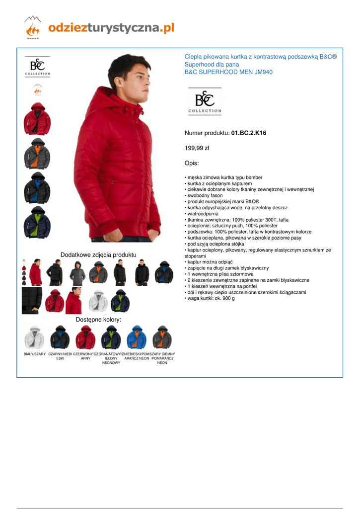 Ciepła pikowana kurtka z kontrastową podszewką B&C® Superhood dla pana B&C SUPERHOOD MEN JM940 Numer produktu: 01.BC.2.K16 199,99 zł Opis: Dodatkowe zdjęcia produktu Dostępne kolory: BIAŁY/SZARY CZARNY/NIEBI CZERWONY/CZ GRANATOWY/Z NIEBIESKI/POM SZARY CIEMNY ESKI ARNY IELONY ARAŃCZ NEON /POMARAŃCZ NEONOWY NEON Powered by TCPDF (www.tcpdf.org) • męska zimowa kurtka typu bomber • kurtka z ocieplanym kapturem • ciekawie dobrane kolory tkaniny zewnętrznej i wewnętrznej • swobodny fason • produkt europejskiej marki B&C® • kurtka odpychająca wodę, na przelotny deszcz • wiatroodporna • tkanina zewnętrzna: 100% poliester 300T, tafta • ocieplenie; sztuczny puch, 100% poliester • podszewka: 100% poliester, tafta w kontrastowym kolorze • kurtka ocieplana, pikowana w szerokie poziome pasy • pod szyją ocieplona stójka • kaptur ocieplony, pikowany, regulowany elastycznym sznurkiem ze stoperami • kaptur można odpiąć • zapięcie na długi zamek błyskawiczny • 1 wewnętrzna plisa sztormowa • 2 kieszenie zewnętrzne zapinane na zamki błyskawiczne • 1 kieszeń wewnętrzna na portfel • dół i rękawy ciepło uszczelnione szerokimi ściągaczami • waga kurtki: ok. 900 g