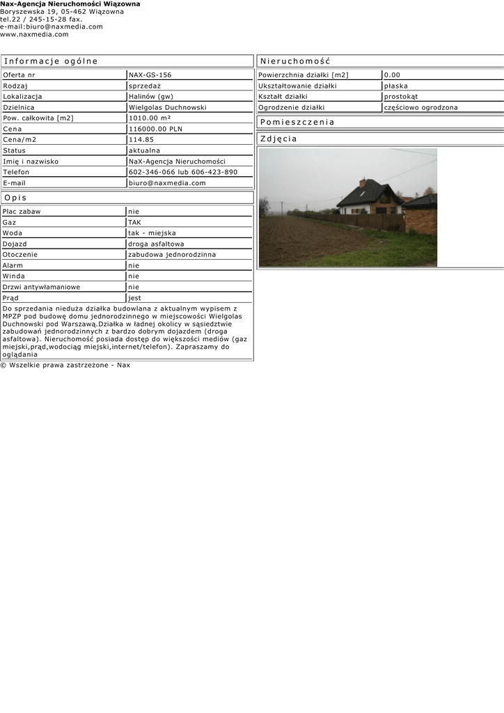 Nax-Agencja Nieruchomości Wiązowna Boryszewska 19, 05-462 Wiązowna tel.22 / 245-15-28 fax. e-mail:[email protected] www.naxmedia.com Informacje ogólne Nieruchomość Oferta nr NAX-GS-156 Powierzchnia działki [m2] 0.00 Rodzaj sprzedaż Ukształtowanie działki płaska Lokalizacja Halinów (gw) Kształt działki prostokąt Dzielnica Wielgolas Duchnowski Ogrodzenie działki częściowo ogrodzona Pow. całkowita [m2] 1010.00 m² Cena 116000.00 PLN Cena/m2 114.85 Status aktualna Imię i nazwisko NaX-Agencja Nieruchomości Telefon 602-346-066 lub 606-423-890 E-mail [email protected] Opis Plac zabaw nie Gaz TAK Woda tak - miejska Dojazd droga asfaltowa Otoczenie zabudowa jednorodzinna Alarm nie Winda nie Drzwi antywłamaniowe nie Prąd jest Do sprzedania nieduża działka budowlana z aktualnym wypisem z MPZP pod budowę domu jednorodzinnego w miejscowości Wielgolas Duchnowski pod Warszawą.Działka w ładnej okolicy w sąsiedztwie zabudowań jednorodzinnych z bardzo dobrym dojazdem (droga asfaltowa). Nieruchomość posiada dostęp do większości mediów (gaz miejski,prąd,wodociąg miejski,internet/telefon). Zapraszamy do oglądania © Wszelkie prawa zastrzeżone - Nax Pomieszczenia Zdjęcia