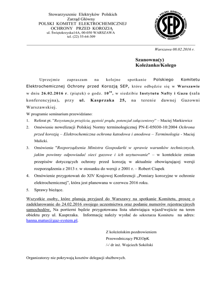 Stowarzyszenie Elektryków Polskich Zarząd Główny POLSKI KOMITET ELEKTROCHEMICZNEJ OCHRONY PRZED KOROZJĄ ul. Świętokrzyska14A, 00-050 WARSZAWA tel. (22) 55-64-309 Warszawa 08.02.2016 r. Szanowna(y) KoleŜanko/Kolego Upr zej mie zapras zam na kolej ne spotkanie Polskiego Komitet u Elektrochemicznej Ochrony przed Korozją SEP, które odbędzi e się w Wars zaw ie w dniu 26.02.2016 r. (piątek) o godz. 10 3 0 , w siedzibie Instytut u Naf ty i Gazu (sala konferencyjna) , przy ul. Kasprzaka 25, na terenie dawnej Gazowni Warszawskiej. W programie seminarium przewidziano: 1. Referat pt. ”Rezystancja przejścia, gęstość prądu, potencjał załączeniowy” – Maciej Markiewicz 2. Omówienie nowelizacji Polskiej Normy terminologicznej PN-E-05030-10:2004 Ochrona przed korozją – Elektrochemiczna ochrona katodowa i anodowa – Terminologia - Maciej Malicki. 3. Omówienie "Rozporządzenia Ministra Gospodarki w sprawie warunków technicznych, jakim powinny odpowiadać sieci gazowe i ich usytuowanie" – w kontekście zmian przepisów dotyczących ochrony przed korozją w aktualnie obowiązującej wersji rozporządzenia z 2013 r. w stosunku do wersji z 2001 r. – Robert Ciupek 4. Omówienie przygotowań do XIV Krajowej Konferencji „Pomiary korozyjne w ochronie elektrochemicznej”, która jest planowana w czerwcu 2016 roku. 5. Sprawy bieŜące. Wszystkie osoby, które planują przyjazd do Warszawy na spotkanie Komitetu, proszę o zadeklarowanie do 24.02.2016 swojego uczestnictwa oraz podanie numerów rejestracyjnych samochodów. Na portierni będzie przygotowana lista ułatwiająca wjazd/wejście na teren obiektu przy ul. Kasprzaka. Informację naleŜy wysłać do sekretarza Komitetu na adres: [email protected]. Z koleŜeńskim pozdrowieniem Przewodniczący PKEOpK /-/ dr inŜ. Wojciech Sokólski Organizatorzy nie pokrywają kosztów delegacji słuŜbowych.