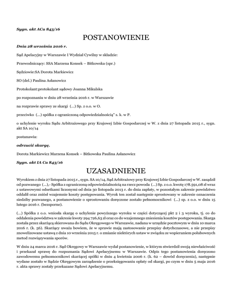 Sygn. akt ACa 843/16 POSTANOWIENIE Dnia 28 września 2016 r. Sąd Apelacyjny w Warszawie I Wydział Cywilny w składzie: Przewodniczący: SSA Marzena Konsek – Bitkowska (spr.) Sędziowie:SA Dorota Markiewicz SO (del.) Paulina Asłanowicz Protokolant:protokolant sądowy Joanna Mikulska po rozpoznaniu w dniu 28 września 2016 r. w Warszawie na rozprawie sprawy ze skargi (...) Sp. z o.o. w O. przeciwko (...) spółka z ograniczoną odpowiedzialnością" s. k. w P. o uchylenie wyroku Sądu Arbitrażowego przy Krajowej Izbie Gospodarczej w W. z dnia 27 listopada 2015 r., sygn. akt SA 10/14 postanawia: odrzucić skargę. Dorota Markiewicz Marzena Konsek – Bitkowska Paulina Asłanowicz Sygn. akt IA Ca 843/16 UZASADNIENIE Wyrokiem z dnia 27 listopada 2015 r., sygn. SA 10/14, Sąd Arbitrażowy przy Krajowej Izbie Gospodarczej w W. zasądził od pozwanego (...),- Spółka z ograniczoną odpowiedzialnością na rzecz powoda (...) Sp. z o.o. kwotę 178.591,08 zł wraz z ustawowymi odsetkami liczonymi od dnia 30 listopada 2013 r. do dnia zapłaty, w pozostałym zakresie powództwo oddalił oraz zniósł wzajemnie koszty postępowania. Wyrok ten został następnie sprostowany w zakresie oznaczenia siedziby pozwanego, a postanowienie o sprostowaniu doręczone zostało pełnomocnikowi (...) sp. z o.o. w dniu 15 lutego 2016 r. (bezsporne). (...) Spółka z o.o. wniosła skargę o uchylenie powyższego wyroku w części dotyczącej pkt 2 i 3 wyroku, tj. co do oddalenia powództwa w zakresie kwoty 294 726,63 zł oraz co do wzajemnego zniesienia kosztów postępowania. Skarga została przez skarżącą skierowana do Sądu Okręgowego w Warszawie, nadana w urzędzie pocztowym w dniu 10 marca 2016 r. (k. 56). Skarżący uważa bowiem, że w sprawie mają zastosowanie przepisy dotychczasowe, a nie przepisy znowelizowane ustawą z dnia 10 września 2015 r. o zmianie niektórych ustaw w związku ze wspieraniem polubownych metod rozwiązywania sporów. W dniu 24 marca 2016 r. Sąd Okręgowy w Warszawie wydał postanowienie, w którym stwierdził swoją niewłaściwość i przekazał sprawę do rozpoznania Sądowi Apelacyjnemu w Warszawie. Odpis tego postanowienia doręczono zawodowemu pełnomocnikowi skarżącej spółki w dniu 4 kwietnia 2006 r. (k. 62 – dowód doręczenia), następnie wydane zostało w Sądzie Okręgowym zarządzenie o przeksięgowaniu opłaty od skargi, po czym w dniu 5 maja 2016 r. akta sprawy zostały przekazane Sądowi Apelacyjnemu. Sąd Apelacyjny zważył, co następuje: Ustawa z dnia 10 września 2015 r. o zmianie niektórych ustaw w związku ze wspieraniem polubownych metod rozwiązywania sporów weszła w życie z dniem 1 stycznia 2016 r. Wprowadziła ona istotne zmiany do przepisów dotyczących postępowania polubownego, a szczególnie postępowania ze skargi o uchylenie wyroku sądu polubownego. Skarga taka dotychczas łączyła w sobie elementy pozwu i apelacji, przy czym Sąd Najwyższy stał na stanowisku, że dominujące znaczenie miały te pierwsze. Pogląd taki był uzasadniany w świetle dwuinstancyjności postępowania ze skargi o uchylenie wyroku sądu polubownego, a także z uwagi na ówczesne brzmienie poszczególnych przepisów. I tak art. 1207 § 1 i 2 k.p.c. nakazywał stosować do skargi odpowiednio przepisy art. 187 k.p.c. (a więc przepisy regulujące wymogi formalne pozwu), zaś do postępowania ze skargi -przepisy księgi pierwszej części pierwszej, o ile dalsze przepisy tytułu VII części piątej kodeksu postępowania cywilnego nie stanowiły inaczej. Trzeba jednak zważyć, że wskazana wyżej ustawa nowelizacyjna przedefiniowała charakter postępowania ze skargi o uchylenie wyroku sądu polubownego. Art. 1207 otrzymał brzmienie następujące: "Art. 1207. § 1. Do skargi o uchylenie wyroku sądu polubownego przepis art. 368 stosuje się odpowiednio. § 2. Jeśli przepisy poniższe nie stanowią inaczej, do postępowania ze skargi o uchylenie wyroku sądu polubownego przepisy o apelacji stosuje się odpowiednio." W art. 1208 § 1 k.p.c. wskazano natomiast, że skargę o uchylenie wyroku sądu polubownego wnosi się do sądu apelacyjnego, na obszarze którego znajduje się sąd, który byłby właściwy do rozpoznania sprawy, gdyby strony nie dokonały zapisu na sąd polubowny, a w braku tej podstawy - do Sądu Apelacyjnego w Warszawie. Jednocześnie zmieniono termin na wniesienie skargi, który obecnie wynosi dwa miesiące, liczone od dnia doręczenia wyroku lub jeżeli strona wniosła o uzupełnienie, sprostowanie lub wykładnię wyroku - od dnia doręczenia przez sąd polubowny orzeczenia rozstrzygającego o tym wniosku. Do art. 1208 dodano także § 3, zgodnie z którym od wyroku wydanego w postępowaniu ze skargi o uchylenie wyroku sądu polubownego przysługuje skarga kasacyjna. Zgodnie z art. 9 powyższej ustawy nowelizującej, do postępowań wszczętych na podstawie k.p.c. i niezakończonych przed dniem wejścia w życie ustawy, stosuje się przepisy dotychczasowe. Ustawa weszła w życie z dniem 1 stycznia 2016 r., z wyjątkiem art. 8, który wszedł w życie z dniem następującym po dniu ogłoszenia (art. 13 ustawy). Mając na względzie treść powyższych przepisów, należy zatem wskazać, że niniejsze postępowanie niewątpliwie powinno toczyć się według przepisów k.p.c. w wersji znowelizowanej. Pogląd strony skarżącej, jakoby toczyło się postępowanie wszczęte przed dniem 1 stycznia 2016 r., w tej dacie niezakończone, jest błędny. Skarżący zdaje się uważać, że postępowanie przed sądem polubownym oraz postępowanie ze skargi o uchylenie wyroku sądu polubownego są etapami jednego postępowania. W ocenie Sądu Apelacyjnego takie stanowisko jest nieuprawnione. Postępowanie polubowne kończy się wydaniem wyroku lub postanowienia o umorzeniu postępowania (art. 1199 k.p.c.). Strona niezadowolona z wyniku postępowania polubownego może następnie zainicjować postępowanie sądowe, wnosząc skargę o uchylenie wyrok