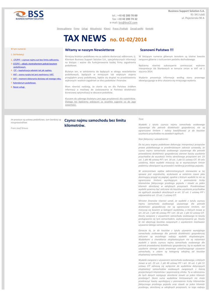Business Support Solution S.A. 91-341 Łódź ul. Pojezierska 90 A tel.: +48 42 200 70 00 fax: +48 42 200 74 32 e-mail: [email protected] Strona główna Firma Usługi Aktualności Klienci Praca i Praktyki Zarząd spółki Kontakt TAX NEWS W tym numerze: 1. Od Redakcji 2. CIT/PIT – czynsze najmu aut bez limitu odliczenia. 3. CIT/PIT – obiad z kontrahentem jednak kosztem podatkowym. 4. CIT – kapitalizacja odsetek tak jak zapłata. 5. VAT – ocena ryzyka też jest zwolniona z VAT. 6. VAT – moment dokonania dostawy od nowego roku. 7. Kalendarium podatkowe. 8. Nasze usługi. no. 01-02/2014 Witamy w naszym Newsletterze Niniejszy biuletyn podatkowy ma za zadanie dostarczać odbiorcom, tj. Klientom Business Support Solution S.A., specjalistycznych informacji na bieżące i ważne dla funkcjonowania każdej firmy zagadnienia podatkowe. Biuletyn ten, w odróżnieniu do będących w obiegu newsletterów podatkowych, będących w mniejszym lub większym stopniu przeglądem prasy podatkowej, będzie się skupiać na przedstawieniu wybranych i ważkich zagadnień ze sfery podatków i finansów. Szanowni Państwo !!! W bieżącym numerze głównym tematem są istotne kwestie związane głównie z rozliczeniem podatku dochodowego. Będziemy również sukcesywnie zamieszczać wybrane interpretacje Izb Skarbowych w temacie zmian w VAT od 1 stycznia 2014. Wydanie prezentuje informacje według stanu prawnego obowiązującego w dniu ukazania się niniejszego wydania. Mam również nadzieję, że stanie się on dla Państwa źródłem informacji o możliwej do zastosowania w Państwa działalności biznesowej optymalizacji w obszarze podatków. Kluczem do udanego biuletynu jest jego przydatność dla czytelników. Dlatego też będziemy wdzięczni za wszelkie sugestie co do jego zawartości. Im prostsze są ustawy podatkowe, tym bardziej są niesprawiedliwe. Franz Josef Strauss Czynsz najmu samochodu bez limitu kilometrów. Teza: Wydatki z tytułu czynszu najmu samochodu osobowego używanego dla potrzeb działalności gospodarczej nie są ograniczone limitem i należy kwalifikować je do kosztów uzyskania przychodów na zasadach ogólnych. Stan faktyczny i uzasadnienie: Do tej pory organy podatkowe dokonując interpretacji przepisów prawa podatkowego w przedmiotowym zakresie uznawały, że czynsz najmu samochodu osobowego używanego dla potrzeb prowadzonej działalności gospodarczej stanowi koszty uzyskania przychodów do wysokości limitu określonego przepisami art. 23 ust. 1 pkt 46 ustawy PIT i art. 16 ust. 1 pkt 51 ustawy CIT. W celu ustalenia, które wydatki mieszczą się w wyznaczonym limicie podatnicy obowiązani są prowadzić ewidencję przebiegu pojazdu. W orzecznictwie sądów administracyjnych stanowisko w tej sprawie jest niejednolite, aczkolwiek w ostatnim czasie jako dominujący przyjął się pogląd, zgodnie z którym wydatki te nie są ograniczone limitem wynikającym z pomnożenia liczby kilometrów faktycznego przebiegu pojazdu i stawki za jeden kilometr określonej w odrębnych przepisach. Przedmiotowe wydatki powinny być zaliczane do kosztów uzyskania przychodów na ogólnych zasadach określonych w art. 22 ust. 1 ustawy PIT i odpowiednio art. 15 ust. 1 ustawy CIT. Minister finansów również uznał, że wydatki z tytułu czynszu najmu samochodu osobowego używanego dla potrzeb działalności gospodarczej nie są ograniczone limitem, nie mieszczą się bowiem w kategorii wydatków, o których mowa w art. 23 ust. 1 pkt 46 ustawy PIT i art. 16 ust. 1 pkt 51 ustawy CIT. Koszty związane z używaniem samochodu osobowego to koszty posługiwania się tym samochodem, wykorzystywania go. Koszty te nie obejmują kosztów związanych z uzyskaniem możliwości używania takiego samochodu. Oznacza to, że do kosztów z tytułu używania wynajętego samochodu osobowego dla potrzeb działalności gospodarczej zaliczane są wszelkiego rodzaju wydatki eksploatacyjne. Wydatkami o charakterze eksploatacyjnym nie są natomiast wydatki z tytułu czynszu najmu samochodu osobowego dla potrzeb prowadzonej działalności gospodarczej. Są to wydatki na uzyskanie samego tytułu prawnego umożliwiającego używanie samochodu, a zatem są kategorią odrębną od kosztów eksploatacji samochodu. Wydatki związane z używaniem samochodu osobowego, o których mowa w art. 23 ust. 1 pkt 46 ustawy PIT i art. 16 ust. 1 pkt 51 ustawy CIT odnoszą się wyłącznie do wydatków dotyczących eksploatacji samochodów osobowych związanych z ilością przejechanych kilometrów i pojemnością silnika. To w odniesieniu do tych danych następuje określenie stawki za jeden kilometr przebiegu?. Skoro suma wydatków limitowanych nie może przekroczyć kwoty wynikającej z pomnożenia liczby kilometrów faktycznego przebiegu pojazdu oraz stawki za jeden kilometr przebiegu, określonej w odrębnych przepisach, to tego rodzaju statystyczna kalkulacja nie może być w jakikolwiek sposób utożsamiana z opłatami, które jej nie podlegają. Przedmiotowa interpretacja ma kolosalne znaczenie dla rozliczenia podatkowego przedsiębiorców i to już za obecny rok. Jej wydanie przez Ministra Finansów uzasadnia dokonanie w księgach podatkowych za rok 2013 stosownych korekt kosztów podatkowych (ich zwiększenie). Tym samym podatek płacony za 2013 rok może być niższy. Wydana interpretacja jest także podstawą do wystosowania w uzasadnionych przypadkach wniosku o stwierdzenie nadpłaty za lata poprzednie, jeżeli w tych latach koszty najmu i dzierżawy samochodów osobowych były ograniczone z uwagi na ujmowanie tych wydatków rozliczeniu tzw. kilometrówki. Dla przypomnienia, z końcem roku 2014 przedawnia się prawo do złożenia wniosku o stwierdzenie nadpłaty za rok 2009. Podstawa prawna: Interpretacja ogólna ministra finansów z 8 listopada 2013 r., DD2/033/55/MWJ/13/RD-111005 Powrót Teza: Posiłek przy spotkaniu z kontrahentem w restauracji też jest kosztem podatkowym. Nie podlegają wykluczeniu z kosztów uzys