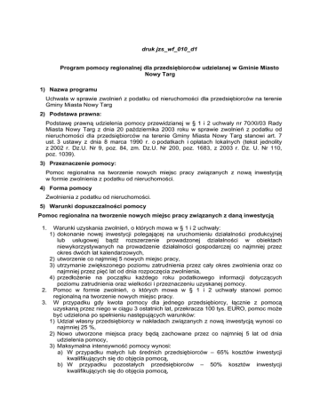 druk jzs_wf_010_d1 Program pomocy regionalnej dla przedsiębiorców udzielanej w Gminie Miasto Nowy Targ 1) Nazwa programu Uchwała w sprawie zwolnień z podatku od nieruchomości dla przedsiębiorców na terenie Gminy Miasta Nowy Targ 2) Podstawa prawna: Podstawę prawną udzielenia pomocy przewidzianej w § 1 i 2 uchwały nr 70/XI/03 Rady Miasta Nowy Targ z dnia 20 października 2003 roku w sprawie zwolnień z podatku od nieruchomości dla przedsiębiorców na terenie Gminy Miasta Nowy Targ stanowi art. 7 ust. 3 ustawy z dnia 8 marca 1990 r. o podatkach i opłatach lokalnych (tekst jednolity z 2002 r. Dz.U. Nr 9, poz. 84, zm. Dz.U. Nr 200, poz. 1683, z 2003 r. Dz. U. Nr 110, poz. 1039). 3) Przeznaczenie pomocy: Pomoc regionalna na tworzenie nowych miejsc pracy związanych z nową inwestycją w formie zwolnienia z podatku od nieruchomości. 4) Forma pomocy Zwolnienia z podatku od nieruchomości. 5) Warunki dopuszczalności pomocy Pomoc regionalna na tworzenie nowych miejsc pracy związanych z daną inwestycją 1. Warunki uzyskania zwolnień, o których mowa w § 1 i 2 uchwały: 1) dokonanie nowej inwestycji polegającej na uruchomieniu działalności produkcyjnej lub usługowej bądź rozszerzenie prowadzonej działalności w obiektach niewykorzystywanych na prowadzenie działalności gospodarczej co najmniej przez okres dwóch lat kalendarzowych, 2) utworzenie co najmniej 5 nowych miejsc pracy, 3) utrzymanie zwiększonego poziomu zatrudnienia przez cały okres zwolnienia oraz co najmniej przez pięć lat od dnia rozpoczęcia zwolnienia, 4) przedłożenie na początku każdego roku podatkowego informacji dotyczących poziomu zatrudnienia oraz wielkości i przeznaczeniu uzyskanej pomocy. 2. Pomoc w formie zwolnień, o których mowa w § 1 i 2 uchwały stanowi pomoc regionalną na tworzenie nowych miejsc pracy. 3. W przypadku gdy kwota pomocy dla jednego przedsiębiorcy, łącznie z pomocą uzyskaną przez niego w ciągu 3 ostatnich lat, przekracza 100 tys. EURO, pomoc może być udzielona po spełnieniu następujących warunków: 1) Udział własny przedsiębiorcy w nakładach związanych z nową inwestycją wynosi co najmniej 25 %, 2) Nowo utworzone miejsca pracy będą zachowane przez co najmniej 5 lat od dnia udzielenia pomocy, 3) Maksymalna intensywność pomocy wynosi: a) W przypadku małych lub średnich przedsiębiorców – 65% kosztów inwestycji kwalifikujących się do objęcia pomocą, b) W przypadku pozostałych przedsiębiorców – 50% kosztów inwestycji kwalifikujących się do objęcia pomocą, 6) Koszty kwalifikujące się do objęcia pomocą Wartość ponoszonych przez przedsiębiorcę dwuletnich kosztów pracy nowo zatrudnianych pracowników, na które składają się: - koszty płacy brutto pracowników, - inne obowiązkowe płatności związane z zatrudnianiem pracowników. 7) Warunki dopuszczalności pomocy eksportowej, operacyjnej lub udzielanej przedsiębiorcom z sektorów uznanych za wrażliwe Program nie przewiduje udzielania pomocy eksportowej, operacyjnej lub udzielanej przedsiębiorcom z sektorów uznanych za wrażliwe. 8) Przewidywana wielkość środków publicznych przeznaczonych na udzielenie pomocy Zastosowanie przedmiotowych zwolnień z podatku od nieruchomości spowoduje zmniejszenie wpływów do budżetu gminy, w zależności od liczby przedsiębiorców, którzy będą tworzyć miejsca pracy związane z daną inwestycją oraz powierzchni budynków lub budowli objętych zwolnieniem. Rocznie może to wynieść ok. 30 000 zł. 9) Procedury zapewniające nie przekroczenie maksymalnych intensywności pomocy Przedsiębiorca korzystający ze zwolnienia jest zobowiązany na początku każdego roku podatkowego do przedłożenia informacji dotyczących: 1) wielkości poniesionych nakładów inwestycyjnych, 2) kosztów zatrudnienia pracowników, 3) wielkości pomocy publicznej uzyskanej w różnych formach i z różnych źródeł przeznaczonej na tworzenie nowych miejsc pracy związanych z nową inwestycją. 10) Czas trwania programu Pomoc będzie udzielana od dnia wejścia w życie uchwały do 31.12.2008 r. Pomoc w formie zwolnienia z podatku od nieruchomości przewidzianego w § 1 i 2 uchwały zwolnienie przysługuje na okres: a) 1 roku – jeśli w wyniku inwestycji utworzono co najmniej 5 miejsc pracy, b) 2 lat – jeśli w wyniku inwestycji utworzono co najmniej 15 miejsc pracy. 11) Kategorie adresatów pomocy Adresatami pomocy są przedsiębiorcy, którzy w wyniku dokonanych inwestycji utworzą nowe miejsca pracy na terenie Miasta Nowy Targ lub poszerzą swoją działalność gospodarczą za wyjątkiem przedsiębiorców prowadzących stacje benzynowe, działalność bankową, oraz działalność handlową na powierzchni powyżej 2 000 m2, a także prowadzących działalność w sektorze górnictwa węgla, hutnictwa żelaza i stali lub transporcie. 12) Organ udzielający pomocy: Rada Miasta Nowy Targ. 13) Obszary, na których będzie udzielana pomoc Program obejmuje swym działaniem teren Gminy Miasto Nowy Targ. 14) Pomoc udzielona na podstawie programu nie wyklucza udzielenia pomocy na podstawie innych programów.
