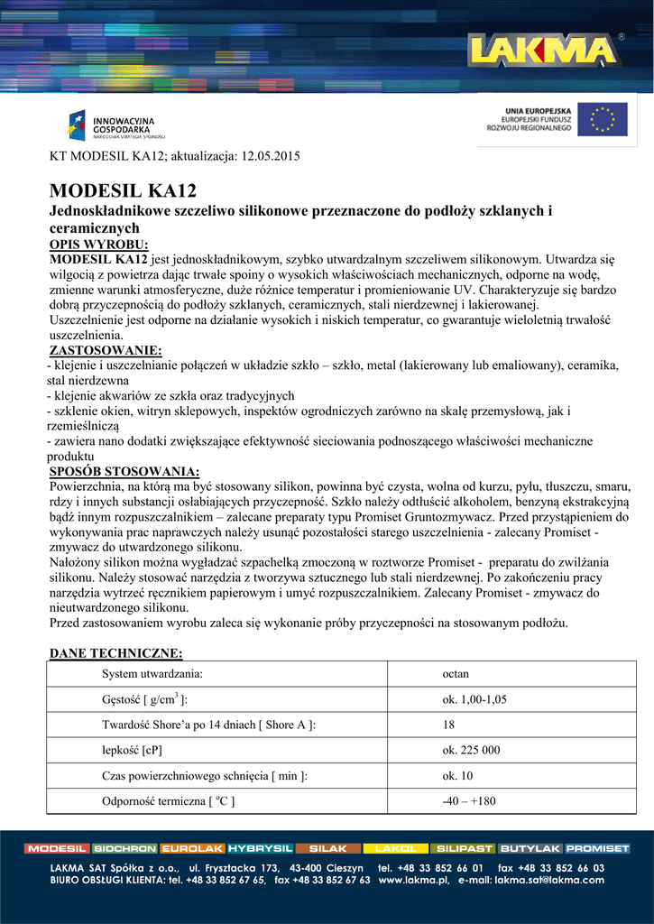 KT MODESIL KA12; aktualizacja: 12.05.2015 MODESIL KA12 Jednoskładnikowe szczeliwo silikonowe przeznaczone do podłoży szklanych i ceramicznych OPIS WYROBU: MODESIL KA12 jest jednoskładnikowym, szybko utwardzalnym szczeliwem silikonowym. Utwardza się wilgocią z powietrza dając trwałe spoiny o wysokich właściwościach mechanicznych, odporne na wodę, zmienne warunki atmosferyczne, duże różnice temperatur i promieniowanie UV. Charakteryzuje się bardzo dobrą przyczepnością do podłoży szklanych, ceramicznych, stali nierdzewnej i lakierowanej. Uszczelnienie jest odporne na działanie wysokich i niskich temperatur, co gwarantuje wieloletnią trwałość uszczelnienia. ZASTOSOWANIE: - klejenie i uszczelnianie połączeń w układzie szkło – szkło, metal (lakierowany lub emaliowany), ceramika, stal nierdzewna - klejenie akwariów ze szkła oraz tradycyjnych - szklenie okien, witryn sklepowych, inspektów ogrodniczych zarówno na skalę przemysłową, jak i rzemieślniczą - zawiera nano dodatki zwiększające efektywność sieciowania podnoszącego właściwości mechaniczne produktu SPOSÓB STOSOWANIA: Powierzchnia, na którą ma być stosowany silikon, powinna być czysta, wolna od kurzu, pyłu, tłuszczu, smaru, rdzy i innych substancji osłabiających przyczepność. Szkło należy odtłuścić alkoholem, benzyną ekstrakcyjną bądź innym rozpuszczalnikiem – zalecane preparaty typu Promiset Gruntozmywacz. Przed przystąpieniem do wykonywania prac naprawczych należy usunąć pozostałości starego uszczelnienia - zalecany Promiset zmywacz do utwardzonego silikonu. Nałożony silikon można wygładzać szpachelką zmoczoną w roztworze Promiset - preparatu do zwilżania silikonu. Należy stosować narzędzia z tworzywa sztucznego lub stali nierdzewnej. Po zakończeniu pracy narzędzia wytrzeć ręcznikiem papierowym i umyć rozpuszczalnikiem. Zalecany Promiset - zmywacz do nieutwardzonego silikonu. Przed zastosowaniem wyrobu zaleca się wykonanie próby przyczepności na stosowanym podłożu. DANE TECHNICZNE: System utwardzania: octan Gęstość [ g/cm3 ]: ok. 1,00-1,05 Twardość Shore’a po 14 dniach [ Shore A ]: 18 lepkość [cP] ok. 225 000 Czas powierzchniowego schnięcia [ min ]: ok. 10 Odporność termiczna [ oC ] -40 – +180 Temperatura stosowania [ oC ] +5 – +40 Temperatura składowania [ oC ] +5 – +35 Składowanie: 18 miesięcy od daty produkcji Utwardzanie wgłębne − warstwa 2 mm [ h ] 24 Utwardzanie wgłębne − warstwa 4 mm [ h ] 24 Utwardzanie wgłębne − warstwa 6 mm [ h ] 24 Zmiana objętości [%] ok. 3,5 Kolor: bezbarwny, czarny Wydajność: z 1 folii Al 600 ml uzyskuje się ok.36 mb spoiny o wymiarach 4 x 4 mm, Opakowanie: folia Al a’400 i 600 ml PŁYTKI SZKLANE 12mm*12mm*50mm, 14 dni ( warunki normalne ), zerwanie Wytrzymałość przy 100% wydłużeniu [ N/mm2 ]: Wytrzymałość do zerwania [ N/mm2 ]: Wydłużenie przy zerwaniu [ % ]: 0,39 0,73 320 PŁYTKI SZKLANE 12mm*12mm*50mm, 14 dni ( warunki normalne ) + 21 dni w wodzie ( o temp. 40 oC ), 1 dzień ( warunki normalne ), 100% wydłużenie Wytrzymałość przy 100% wydłużeniu [ N/mm2 ]: 0,37 PŁYTKI SZKLANE 12mm*12mm*50mm, 14 dni ( warunki normalne ) + 21 dni w wodzie słonej + 21 dni w wodzie ( o temp. 40oC ), 1 dzień ( warunki normalne ), 100% wydłużenie Wytrzymałość przy 100% wydłużeniu [ N/mm2 ]: 0,36 PRÓBKA SILIKONU o wymiarach 12mm*12mm*1mm na szkle, 14 dni (warunki normalne), zerwanie Wytrzymałość przy 100% wydłużeniu [ N/mm2 ]: ----Wytrzymałość do zerwania [ N/mm2 ]: 0,77 Wydłużenie przy zerwaniu [ % ]: 50 PRÓBKA SILIKONU o wymiarach 12mm*12mm*1mm, 14 dni ( warunki normalne ) + 21 dni w wodzie, zerwanie Wytrzymałość przy 100% wydłużeniu [ N/mm2 ]: ----Wytrzymałość do zerwania [ N/mm2 ]: 0,68 Wydłużenie przy zerwaniu [ % ]: 50 Temperatura stosowania [ oC ]: +5 do +40 Odporność termiczna [ oC ]: -40 do +180 Dodatkowe informacje dostępne w Karcie Charakterystyki. Informacje zawarte w niniejszej Karcie Technicznej mają na celu zapewnienie optymalnego wykorzystania produktu, jednak nie są podstawą do odpowiedzialności prawnej Producenta, gdyż warunki wykonawstwa pozostają poza jego kontrolą. Zaproponowane sposoby postępowania uznane są za powszechne, jednak każdy z użytkowników tego materiału powinien upewnić się na wszelkie możliwe sposoby, włącznie ze sprawdzeniem produktu końcowego, o przydatności dostarczanych materiałów do osiągnięcia zamierzonych celów. W przypadku połączenia z wyrobami innych Producentów nie ponosimy żadnej odpowiedzialności. Powyższe dane, zalecenia i wskazówki opierają się na naszej najlepszej wiedzy, badaniach oraz doświadczeniach i zostały udzielone w dobrej wierze, zgodnie z zasadami obowiązującymi w naszej firmie i u naszych dostawców. Producent zastrzega sobie prawo do zmiany treści w kolejnych edycjach bez wcześniejszego informowania o tym fakcie odbiorców. Wraz z ukazaniem się tej Karty Technicznej, karty wcześniejsze tracą ważność.