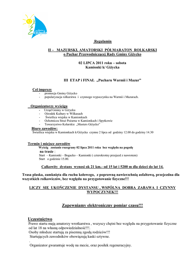 Regulamin II – MAZURSKI, AMATORSKI PÓŁMARATON ROLKARSKI o Puchar Przewodniczącej Rady Gminy Giżycko 02 LIPCA 2011 roku – sobota Kamionki k/ Giżycka III ETAP i FINAŁ „Pucharu Warmii i Mazur” Cel imprezy - promocja Gminy Giżycko popularyzacja rolkarstwa i czynnego wypoczynku na Warmii i Mazurach. Organizatorzy wyścigu - Urząd Gminy w Giżycku Ośrodek Kultury w Wilkasach Świetlica wiejska w Kamionkach Ochotnicza Straż Pożarna w Kamionkach i Spytkowie Towarzystwo Kolarskie „Masters Giżycko” Biuro zawodów: Świetlica wiejska w Kamionkach k/Giżycka czynne 2 lipca od godziny 12.00 do godziny 14.30 Termin i miejsce zawodów Wyścig zostanie rozegrany 02 lipca 2011 roku bez względu na pogodę na trasie : Start – Kamionki – Bogacko – Kamionki ( czterokrotny przejazd z nawrotem) Start o godzinie 15.00. Całkowity dystans wynosi ok 21 km.- od 15 lat i 5200 m dla dzieci do lat 14. Trasa płaska, zamknięta dla ruchu kołowego, z poprawną nawierzchnią asfaltową, przejezdna dla wszystkich rolkowiczów, bez względu na przygotowanie fizyczne!!! LICZY SIĘ UKOŃCZENIE DYSTANSU , WSPÓLNA DOBRA ZABAWA I CZYNNY WYPOCZYNEK!!! Zapewniamy elektroniczny pomiar czasu!!! Uczestnictwo Prawo startu mają amatorzy wrotkarstwa , wszyscy chętni bez względu na przygotowanie fizyczne od lat 18 na własną odpowiedzialność!!!. Osoby młodsze startują za pisemną zgodą rodziców!!! Startujących zawodników obowiązują kaski sztywne. . Organizator gwarantuje wodę na mecie, oraz posiłek regeneracyjny. Zgłoszenia i zasady finansowania. Drogą elektroniczną na adres: www.sport-timing.pl , do dnia 28 czerwca 2011r po wniesieniu opłaty startowej w wysokości : 50 zł - dla uczestników powyżej 18 lat, 15 zł - do lat 17 włącznie na konto: P.K.O. Bank Polski o/w Giżycku 77 1020 4753 0000 0902 0027 2047 T.K. „MASTERS GIŻYCKO” z dopiskiem: ”półmaraton” W treści proszę podać nazwisko, imię, rok urodzenia, nazwę klubu lub miejsce zamieszkania Kategorie wiekowe, klasyfikacja i dystans: Kobiety: Kat.IA - do lat 14 – 5200 m 21km Kat.I - do lat 14 Kat. II - 15 do 17 lat Kat. III - 18 do 39 lat Kat. IV - 40 lat i starsze Mężczyżni: Kat. IA - do lat 14 – 5200 m 21km Kat.I - do lat 14 Kat. II - 15 do 17 lat Kat. III - 18 do 39 lat Kat . IV- 40- 49 lat Kat. V- 50 -59 lat Kat . VI - 60 lat i starsi Nagrody I -III miejsca w każdej kategorii wiekowej : puchar i dyplom, Wszystkim uczestnikom za ukończenie wyścigu wręczone zostaną pamiątkowe medale!!! Postanowienia końcowe . Każdy zawodnik ubezpiecza się od następstw nieszczęśliwych wypadków we własnym zakresie / OC i NW/ i uczestniczy w wyścigu na własną odpowiedzialność. Organizator nie odpowiada za szkody wyrządzone przez lub na rzecz uczestników wyścigów i osób towarzyszących Organizator zastrzega sobie prawo do interpretacji niniejszego regulaminu w porozumieniu z Sędzią Głównym wyścigu . Odpowiedzialnym za przebieg i bezpieczeństwo imprezy z ramienia organizatora jest Towarzystwa Kolarskiego „ Masters Giżycko” tel. 0 – 502 84 10 33 E – mail : masters7@ wp.pl Jerzy Gawarecki – Prezes Adres szpitala : Samodzielny Publiczny Zakład Opieki Zdrowotnej w Giżycku ul.Warszawska 41 tel. centrali : 0 – 87 428 52 71 Zapraszamy - życzymy sukcesów i radości ze sportowej rywalizacji . Organizatorzy GIŻYCKO TOWARZYSTWO KOLARSKIE “MASTERS GIŻYCKO” ul. Warszawska 28 11 – 500 Giżycko tel. 0 – 502 84 10 33 e – mail: [email protected] MAPKA LOKALIZACJI PÓŁMARATONU ROLKARSKIEGO 02 lipca 2011 r.