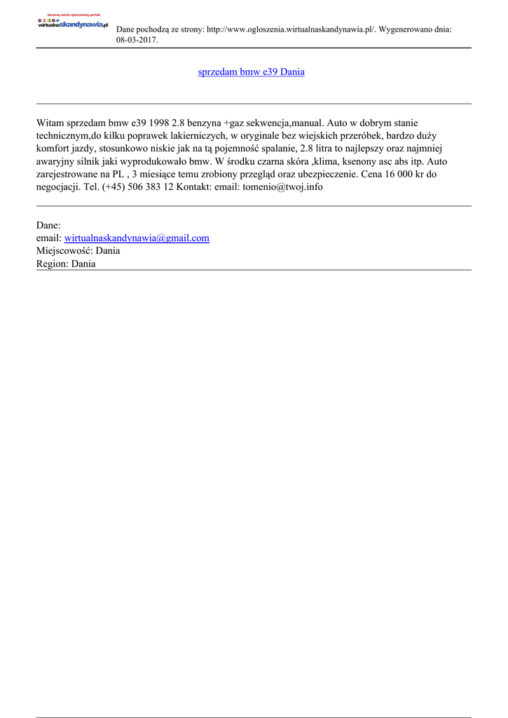 Dane pochodzą ze strony: http://www.ogloszenia.wirtualnaskandynawia.pl/. Wygenerowano dnia: 08-03-2017. sprzedam bmw e39 Dania Witam sprzedam bmw e39 1998 2.8 benzyna +gaz sekwencja,manual. Auto w dobrym stanie technicznym,do kilku poprawek lakierniczych, w oryginale bez wiejskich przeróbek, bardzo duży komfort jazdy, stosunkowo niskie jak na tą pojemność spalanie, 2.8 litra to najlepszy oraz najmniej awaryjny silnik jaki wyprodukowało bmw. W środku czarna skóra ,klima, ksenony asc abs itp. Auto zarejestrowane na PL , 3 miesiące temu zrobiony przegląd oraz ubezpieczenie. Cena 16 000 kr do negocjacji. Tel. (+45) 506 383 12 Kontakt: email: [email protected] Dane: email: [email protected] Miejscowość: Dania Region: Dania