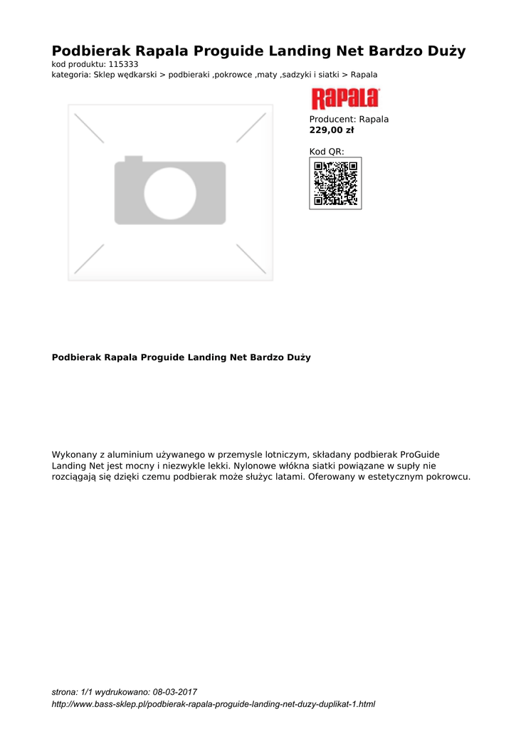 Podbierak Rapala Proguide Landing Net Bardzo Duży kod produktu: 115333 kategoria: Sklep wędkarski > podbieraki ,pokrowce ,maty ,sadzyki i siatki > Rapala Producent: Rapala 229,00 zł Kod QR: Podbierak Rapala Proguide Landing Net Bardzo Duży Wykonany z aluminium używanego w przemysle lotniczym, składany podbierak ProGuide Landing Net jest mocny i niezwykle lekki. Nylonowe włókna siatki powiązane w supły nie rozciągają się dzięki czemu podbierak może służyc latami. Oferowany w estetycznym pokrowcu. strona: 1/1 wydrukowano: 08-03-2017 http://www.bass-sklep.pl/podbierak-rapala-proguide-landing-net-duzy-duplikat-1.html