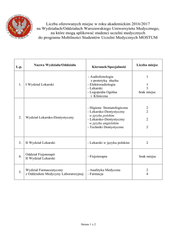 Liczba oferowanych miejsc w roku akademickim 2016/2017 na Wydziałach/Oddziałach Warszawskiego Uniwersytetu Medycznego, na które mogą aplikować studenci uczelni medycznych do programu Mobilności Studentów Uczelni Medycznych MOSTUM L.p. 1. 2. Nazwa Wydziału/Oddziału Kierunek/Specjalność - Audiofonologia z protetyką słuchu - Elektroradiologia - Lekarski - Logopedia Ogólna i Kliniczna I Wydział Lekarski Wydział Lekarsko-Dentystyczny Liczba miejsc 1 1 3 brak miejsc - Higiena Stomatologiczna - Lekarsko-Dentystyczny w języku polskim - Lekarsko-Dentystyczny w języku angielskim - Techniki Dentystyczne 2 2 2 3. II Wydział Lekarski - Lekarski w języku polskim 4. Oddział Fizjoterapii II Wydział Lekarski - Fizjoterapia 5. Wydział Farmaceutyczny z Oddziałem Medycyny Laboratoryjnej - Analityka Medyczna - Farmacja Strona 1 z 2 2 2 brak miejsc 2 4 6. Wydział Nauki o Zdrowiu - Dietetyka I stopnia: II rok III rok 10 10 - Dietetyka II stopnia: II rok 10 - Pielęgniarstwo I stopnia: II rok III rok 10 10 - Pielęgniarstwo II stopnia: II rok 10 - Położnictwo I stopnia: II rok III rok 10 10 - Położnictwo II stopnia: II rok 10 - Ratownictwo Medyczne: II rok III rok 10 10 - Zdrowie publiczne I stopnia: II rok III rok 10 10 - Zdrowie publiczne II stopnia II rok 10 Strona 2 z 2