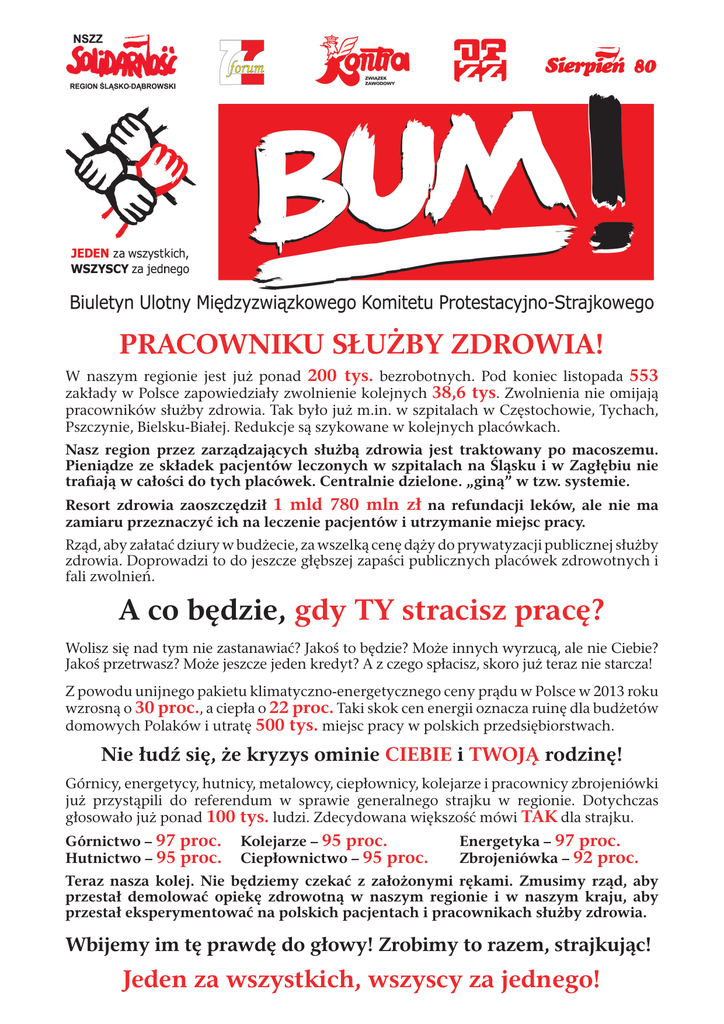 PRACOWNIKU SŁUŻBY ZDROWIA! W naszym regionie jest już ponad 200 tys. bezrobotnych. Pod koniec listopada 553 zakłady w Polsce zapowiedziały zwolnienie kolejnych 38,6 tys. Zwolnienia nie omijają pracowników służby zdrowia. Tak było już m.in. w szpitalach w Częstochowie, Tychach, Pszczynie, Bielsku-Białej. Redukcje są szykowane w kolejnych placówkach. Nasz region przez zarządzających służbą zdrowia jest traktowany po macoszemu. Pieniądze ze składek pacjentów leczonych w szpitalach na Śląsku i w Zagłębiu nie trafiają w całości do tych placówek. Centralnie dzielone. „giną” w tzw. systemie. Resort zdrowia zaoszczędził 1 mld 780 mln zł na refundacji leków, ale nie ma zamiaru przeznaczyć ich na leczenie pacjentów i utrzymanie miejsc pracy. Rząd, aby załatać dziury w budżecie, za wszelką cenę dąży do prywatyzacji publicznej służby zdrowia. Doprowadzi to do jeszcze głębszej zapaści publicznych placówek zdrowotnych i fali zwolnień. A co będzie, gdy TY stracisz pracę? Wolisz się nad tym nie zastanawiać? Jakoś to będzie? Może innych wyrzucą, ale nie Ciebie? Jakoś przetrwasz? Może jeszcze jeden kredyt? A z czego spłacisz, skoro już teraz nie starcza! Z powodu unijnego pakietu klimatyczno-energetycznego ceny prądu w Polsce w 2013 roku wzrosną o 30 proc., a ciepła o 22 proc. Taki skok cen energii oznacza ruinę dla budżetów domowych Polaków i utratę 500 tys. miejsc pracy w polskich przedsiębiorstwach. Nie łudź się, że kryzys ominie CIEBIE i TWOJĄ rodzinę! Górnicy, energetycy, hutnicy, metalowcy, ciepłownicy, kolejarze i pracownicy zbrojeniówki już przystąpili do referendum w sprawie generalnego strajku w regionie. Dotychczas głosowało już ponad 100 tys. ludzi. Zdecydowana większość mówi TAK dla strajku. Górnictwo – 97 proc. Hutnictwo – 95 proc. Kolejarze – 95 proc. Ciepłownictwo – 95 proc. Energetyka – 97 proc. Zbrojeniówka – 92 proc. Teraz nasza kolej. Nie będziemy czekać z założonymi rękami. Zmusimy rząd, aby przestał demolować opiekę zdrowotną w naszym regionie i w naszym kraju, aby przestał eksperymentować na polskich pacjentach i pracownikach służby zdrowia. Wbijemy im tę prawdę do głowy! Zrobimy to razem, strajkując! Jeden za wszystkich, wszyscy za jednego! W październiku przewodniczący największych central związkowych w regionie: NSZZ Solidarność, OPZZ, Forum Związków Zawodowych i WZZ Sierpień 80 powołali Międzyzwiązkowy Komitet Protestacyjno-Strajkowy. Żyjemy w kraju, w którym formalnie nie można ogłosić strajku generalnego przeciwko rządowi. Takie prawo nam stworzono. Na szczęście nie zakazano generalnego strajku solidarnościowego, czyli takiego, w którym pracownicy jednego zakładu strajkują w obronie pracowników innego zakładu, którzy nie mają prawa do strajku. I z tej możliwości Międzyzwiązkowy Komitet Protestacyjno-Strajkowy chce skorzystać. Przygotowujemy się do strajku w obronie pracowników sądownictwa, ale najważniejsze są postulaty strajkowe zgłoszone przez MKPS. Te postulaty dotyczą każdego z nas, każdej branży, każdego zakładu. NASZE POSTULATY: MKPS domaga się: 1. Stworzenia osłonowego systemu regulacji finansowych oraz ulg podatkowych dla przedsiębiorstw utrzymujących zatrudnienie w okresie niezawinionego przestoju produkcyjnego. (Chodzi o to, aby przedsiębiorstwa nie zwalniały ludzi i nie likwidowały miejsc pracy w czasie kryzysu, tylko razem z rządem płaciły postojowe). 2. Wprowadzenia systemu rekompensat dla przedsiębiorstw objętych skutkami pakietu klimatyczno-energetycznego. (Chodzi o to, aby rząd wspierał przedsiębiorstwa, które wykańcza zbyt drogi prąd, bo inaczej te zakłady i miejsca pracy zostaną przeniesione za wschodnią granicę). 3. Ograniczenia stosowania umów śmieciowych. (Chodzi o to, aby ludzie mieli stałą i stabilną pracę, aby mogli odkładać na emerytury). 4. Likwidacja NFZ. (Chodzi o to, aby nasze składki trafiały na leczenie pacjentów w naszym regionie, a nie były przejadane przez urzędników w Warszawie). 5. Utrzymania rozwiązań emerytalnych, przysługujących pracownikom zatrudnionym w warunkach szczególnych i szczególnym charakterze. (Chodzi o utrzymanie emerytur pomostowych na wcześniejszych, sprawiedliwych zasadach, aby ludzie przed emeryturą nie trafiali na bruk bez środków do życia). 6. Zaprzestania likwidacji szkół i zaprzestania przerzucania finansowania szkolnictwa publicznego na samorządy. (Chodzi o to, aby rząd zwiększył poziom finansowania polskiej oświaty. Dzisiaj większość kosztów związanych z utrzymaniem szkół spada na samorządy). Weź udział w referendum! Wystarczy, że powiesz TAK Rząd oderwał się od rzeczywistości i wydaje mu się, że problemy pracowników i pracodawców nie są ich problemami. Trzeba nim wstrząsnąć, albo zmienić. Zanim będzie za późno. Naszą najmocniejszą i najskuteczniejszą bronią jest strajk. Oni strajku się boją. Kiedy wspólnie zaprotestują hutnicy, kolejarze, górnicy, zbrojeniówka, służba zdrowia, oświata, zakłady motoryzacyjne, kiedy staną autobusy i tramwaje, to rząd nie będzie mógł już dalej wciskać kitu, że jesteśmy na zielonej wyspie, że tylko nielicznym gorzej się powodzi, a reszta ma się świetnie. Prawda jest taka, że wszystkim źle się powodzi poza rządzącymi i ludźmi, którymi poobsadzali stołki. Możemy ich od tych stołków oderwać i zmusić do uczciwej roboty. Warunek jest jeden. Musimy to zrobić razem! Jeden za wszystkich, wszyscy za jednego!
