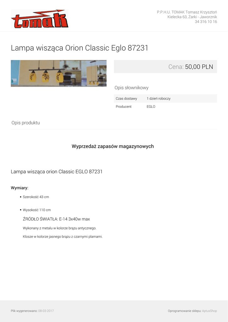 P.P.H.U. TOMAK Tomasz Krzysztoń Kielecka 63, Żarki - Jaworznik 34 316 10 16 Lampa wisząca Orion Classic Eglo 87231 Cena: 50,00 PLN Opis słownikowy Czas dostawy 1 dzień roboczy Producent EGLO Opis produktu Wyprzedaż zapasów magazynowych Lampa wisząca orion Classic EGLO 87231 Wymiary: Szerokość 43 cm Wysokość 110 cm ŹRÓDŁO ŚWIATŁA: E-14 3x40w max Wykonany z metalu w kolorze brązu antycznego. Klosze w kolorze jasnego brązu z czarnymi plamami. Plik wygenerowano: 08-03-2017 Oprogramowanie sklepu: AptusShop P.P.H.U. TOMAK Tomasz Krzysztoń Kielecka 63, Żarki - Jaworznik 34 316 10 16 Galeria Plik wygenerowano: 08-03-2017 Powered by TCPDF (www.tcpdf.org) Oprogramowanie sklepu: AptusShop