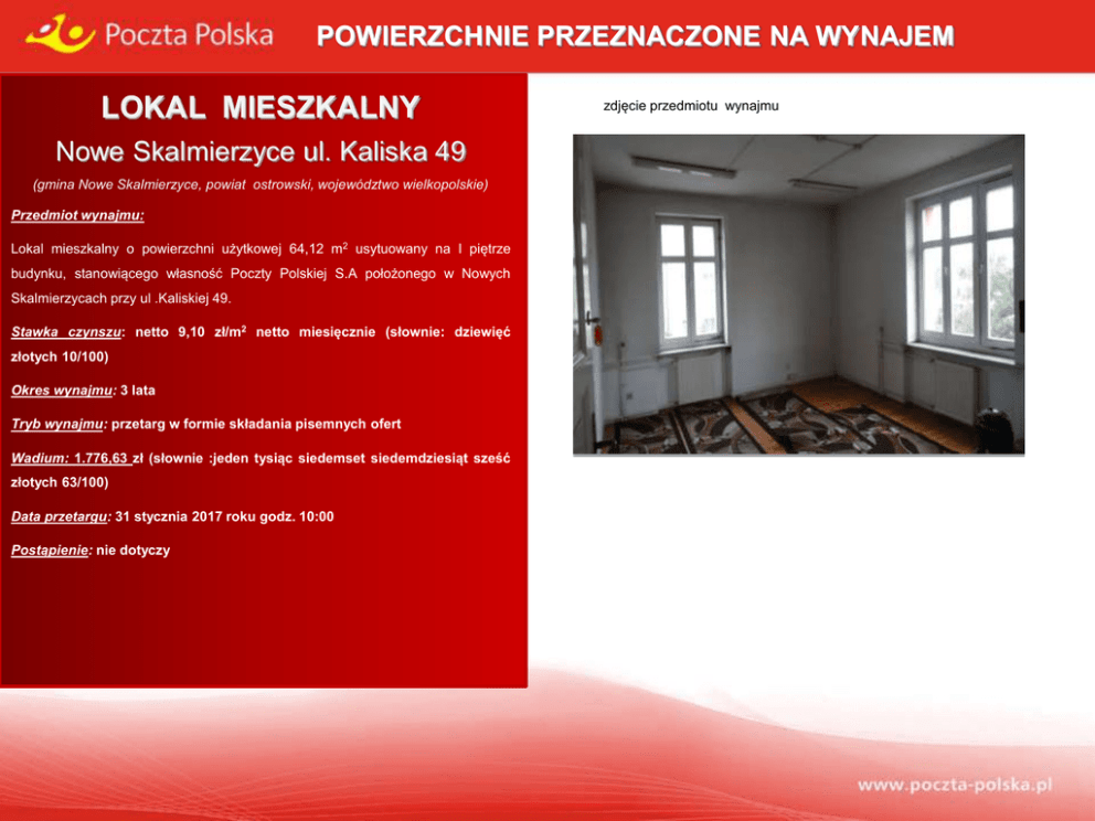POWIERZCHNIE PRZEZNACZONE NA WYNAJEM - LOKAL MIESZKALNY zdjęcie przedmiotu wynajmu Nowe Skalmierzyce ul. Kaliska 49 i zlokalizuj na mapie (gmina Nowe Skalmierzyce, powiat ostrowski, województwo wielkopolskie) Przedmiot wynajmu: Lokal mieszkalny o powierzchni użytkowej 64,12 m2 usytuowany na I piętrze budynku, stanowiącego własność Poczty Polskiej S.A położonego w Nowych Skalmierzycach przy ul .Kaliskiej 49. Stawka czynszu: netto 9,10 zł/m2 netto miesięcznie (słownie: dziewięć złotych 10/100) Okres wynajmu: 3 lata Tryb wynajmu: przetarg w formie składania pisemnych ofert Wadium: 1.776,63 zł (słownie :jeden tysiąc siedemset siedemdziesiąt sześć złotych 63/100) Data przetargu: 31 stycznia 2017 roku godz. 10:00 Postąpienie: nie dotyczy Opis przedmiotu wynajmu: • Pokoje • kuchnia • Łazienka z wc • Wejście i przedpokój Lokal mieszkalny usytuowany jest na I piętrze budynku stanowiącego własność Poczty Polskiej S.A. mieszczącego się w Nowych Skalmierzycach przy ul. Kaliskiej 49 Łączna powierzchnia użytkowa lokalu mieszkalnego wynosi – 64,12 m², na którą składa się 5 pomieszczeń: 1 pokój o powierzchni 16,09 m², 2 pokój o powierzchni 22,55 m², kuchnia o powierzchni 10,77 m², przedpokój o powierzchni 7,09 m² i łazienka z wc o powierzchni 7,62 m². Do lokalu przynależy pomieszczenie w piwnicy o powierzchni 8,72 m2 oraz pomieszczenie w budynku gospodarczym o powierzchni 5,97 m2. Ogrzewanie gazowe (z kotłowni lokalnej). Lokal wyposażony w instalacje: elektryczną, wodno-kanalizacyjną i gazową. Niezależnie od czynszu Najemca będzie ponosił opłaty za: • dostarczanie wody zimnej - wg odczytu wodomierzy i według obowiązującej stawki, • odprowadzanie ścieków - wg odczytu wodomierzy i według obowiązującej stawki, • energia elektryczna, wg odczytu podlicznika … zł//kWh netto x 1 kWh = …… zł netto + podatek VAT (wg obowiązującej stawki), • odbiór odpadów stałych, ilość osób x stawka za 1 osobę (zgodnie z uchwałą UMiG Nowe Skalmierzyce), • centralne ogrzewanie, zaliczka miesięczna 2,50 zł/m3 netto x 64,12 m2 = 160,30 zł netto + podatek według obowiązującej stawki. Opis nieruchomości: Miejscowość Nowe Skalmierzyce Ulica, nr budynku Kaliska 49 Powierzchnia budynku, w których zlokalizowany jest przedmiot wynajmu 666,43 m2 Nr działki ewidencyjnej, obręb 116, Nowe Skalmierzyce Księga wieczysta, Sąd Rejonowy, Nr Wydziału KZ1W/00070552/3 prowadzona przez Są d Rejonowy w Ostrowie Wielkopolskim Wydział Ksiąg Wieczystych Stan prawny gruntu Użytkowanie wieczyste na rzecz Poczty Polskiej S.A. Lokalizacja i dostępność komunikacyjna: Miasto Nowe Skalmierzyce położne jest w południowo-wschodniej części województwa wielkopolskiego. Oddalone jest o 9 km od Kalisza i 12 km od Ostrowa Wielkopolskiego. Wzdłuż ulicy Kaliskiej dominuje zabudowa zwarta – budynki prywatne i użyteczności publicznej, szkoła, kościół. Miejscowość ma bezpośrednie połączenie z miastem Kaliszem i Ostrowem Wlkp. poprzez komunikację miejską i kolej. Usytuowanie miejscowości Nowe Skalmierzyce, plan miasta Opis nieruchomości: Nieruchomość zabudowana jest budynkiem głównym usługowo-mieszkalnych oraz dwoma budynkami gospodarczymi. Na terenie posesji znajduje się ogród oraz z dwóch stron budynku na jego ścianach bocznych trawniki. widok budynku od frontu wejście do budynku mieszkalnego OBWIESZCZENIE O PRZETARGU NA WYNAJEM LOKALU MIESZKALNEGO Wynajmujący: POCZTA POLSKA S.A. z siedzibą w Warszawie, 00-940 Warszawa, ul. Rodziny Hiszpańskich 8. Prowadzący przetarg: Poczta Polska S.A., Pion Infrastruktury Obszar Operacyjny ds. Nieruchomości w Poznaniu, ul. Głogowska 17, 60-943 Poznań. Miejsce przetargu: Poczta Polska S.A. Pion Infrastruktury, Obszar Operacyjny ds. Nieruchomości w Poznaniu Dział Administrowania Nieruchomościami i Konserwacji, ul. Grodzka 6, 62-800 Kalisz, pokój nr 7. Poczta Polska S.A. Pion Infrastruktury Obszar Operacyjny ds. Nieruchomości w Poznaniu ogłasza przetarg pisemny na wynajem lokalu mieszkalnego o powierzchni użytkowej 64,12 m² zlokalizowanego na I piętrze budynku usługowo-mieszkalnego położonego na nieruchomości gruntowej zabudowanej w miejscowości Nowe Skalmierzyce przy ul. Kaliskiej 49. Okres trwania umowy - 3 lata. Charakterystyka nieruchomości: Nieruchomość znajduje się w centrum miejscowości. W sąsiedztwie nieruchomości znajdują się zabudowy usługowo-handlowe oraz mieszkalne. Na parterze budynku znajduje się Urząd Pocztowy Nowe Skalmierzyce. Przedmiot najmu: Łączna powierzchnia użytkowa lokalu mieszkalnego wynosi – 64,12 m2 na którą składa się 5 pomieszczeń: pokój o powierzchni 16,09 m², pokój o powierzchni 22,55 m², kuchnia o powierzchni 10,77 m², łazienka z wc o powierzchni 7,62 m², przedpokój o powierzchni 7,09 m². W pomieszczeniach lokalu zamontowane są grzejniki konwektorowe, płytowe. Stolarka okienna drewniana, oszklenie pełne. Drzwi wejściowe drewniane w stanie dobrym. Podłogi – w pokojach podłoga drewniana, w łazience płytki ceramiczne w stanie dobrym. Otynkowanie ścian i sufitów w stanie dobrym. Lokal wyposażony w instalacje: elektryczną, wodno-kanalizacyjną, centralnego ogrzewania z lokalnej kotłowni gazowej – wszystkie instalacje są sprawne. Lokal wyposażony w podlicznik wodomierzowy i energii elektrycznej. Ogólny stan techniczny określić można jako dobry. Część przynależną do lokalu stanowi pomieszczenie gospodarcze (piwnica) o powierzchni użytkowej 8,72 m2 oraz pomieszczenie w budynku gospodarczym o powierzchni użytkowej 5,97 m2. Najemca oprócz czynszu zobowiązany będzie ponosić koszty: zużycia wody i odprowadzania ścieków, energii elektrycznej, wnosić zaliczkę na c.o. oraz wywóz odpadów komunalnych Wywoławcza stawka czynszu netto wynosi: 9,10 zł/m2 miesięcznie. Szczegółowe informacje na temat przetargu i warunków najmu zostały zawarte w projekcie umowy najmu, z