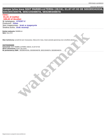 Informacje o produkcie Utworzono 08-03-2017 Lampa tylna lewa SEAT MARBELLA/TERRA (28/24), 01.87-07.93 OE SE028934203A, SE028934007B, SE021934007A, SE028934007A Cena : 81,81 zł (netto) 100,63 zł (brutto) Nr katalogowy : 670287-V Producent : Valeo Stan magazynowy : brak w magazynie Średnia ocena : brak recenzji er m ar k Rodzaj nadwozia: MARBELLA Opis: lewa ECE Stan techniczny: przedmiot jest nieużywany, fabrycznie nowy, towar posiada gwarancję oraz certyfikat jakości. w at ZASTOSOWANIE Samochód: SEAT MARBELLA/TERRA (28/24), 01.87-07.93 Okres stosowania: Przez cały okres Nr porównawczy OEM: SE028934203A, SE028934007B, SE021934007A, SE028934007A Wygenerowano w programie www.oscGold.com