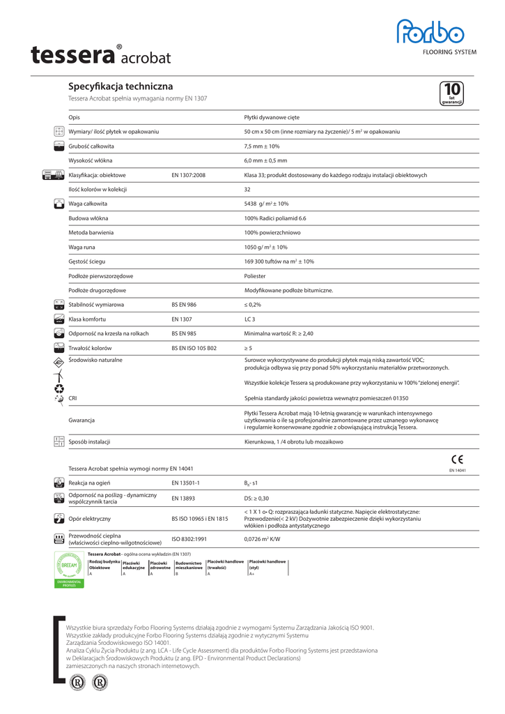 tessera®acrobat 10 Specyfikacja techniczna Tessera Acrobat spełnia wymagania normy EN 1307 ; 1 G . 2 m g > lat gwarancji Opis Płytki dywanowe cięte Wymiary/ ilość płytek w opakowaniu 50 cm x 50 cm (inne rozmiary na życzenie)/ 5 m2 w opakowaniu Grubość całkowita 7,5 mm ± 10% Wysokość włókna 6,0 mm ± 0,5 mm Klasyfikacja: obiektowe EN 1307:2008 Klasa 33; produkt dostosowany do każdego rodzaju instalacji obiektowych Ilość kolorów w kolekcji 32 Waga całkowita 5438 g/ m2 ± 10% Budowa włókna 100% Radici poliamid 6.6 Metoda barwienia 100% powierzchniowo Waga runa 1050 g/ m2 ± 10% Gęstość ściegu 169 300 tuftów na m2 ± 10% Podłoże pierwszorzędowe Poliester Podłoże drugorzędowe Modyfikowane podłoże bitumiczne. Stabilność wymiarowa BS EN 986 ≤ 0,2% Klasa komfortu EN 1307 LC 3 Odporność na krzesła na rolkach BS EN 985 Minimalna wartość R: ≥ 2,40 Trwałość kolorów BS EN ISO 105 B02 ≥5 Środowisko naturalne Surowce wykorzystywane do produkcji płytek mają niską zawartość VOC; produkcja odbywa się przy ponad 50% wykorzystaniu materiałów przetworzonych. Wszystkie kolekcje Tessera są produkowane przy wykorzystaniu w 100% “zielonej energii”. ] CRI Spełnia standardy jakości powietrza wewnątrz pomieszczeń 01350 Gwarancja Płytki Tessera Acrobat mają 10-letnią gwarancję w warunkach intensywnego użytkowania o ile są profesjonalnie zamontowane przez uznanego wykonawcę i regularnie konserwowane zgodnie z obowiązującą instrukcją Tessera. Sposób instalacji Kierunkowa, 1 /4 obrotu lub mozaikowo 7 Tessera Acrobat spełnia wymogi normy EN 14041 R Z L e EN 14041 Reakcja na ogień EN 13501-1 Bfl- s1 Odporność na poślizg - dynamiczny wspólczynnik tarcia EN 13893 DS: ≥ 0,30 Opór elektryczny BS ISO 10965 i EN 1815 < 1 X 1 o• Q: rozpraszająca ładunki statyczne. Napięcie elektrostatyczne: Przewodzenie(< 2 kV) Dożywotnie zabezpieczenie dzięki wykorzystaniu włókien i podłoża antystatycznego Przewodność cieplna (właściwości cieplno-wilgotnościowe) ISO 8302:1991 0,0726 m2 K/W Tessera Acrobat– ogólna ocena wykładzin (EN 1307) Rodzaj budynku Placówki Obiektowe edukacyjne Placówki zdrowotne Budownictwo mieszkaniowe Placówki handlowe (trwałość) Placówki handlowe (styl) A A B A A+ A Wszystkie biura sprzedaży Forbo Flooring Systems działają zgodnie z wymogami Systemu Zarządzania Jakością ISO 9001. Wszystkie zakłady produkcyjne Forbo Flooring Systems działają zgodnie z wytycznymi Systemu Zarządzania Środowiskowego ISO 14001. Analiza Cyklu Życia Produktu (z ang. LCA - Life Cycle Assessment) dla produktów Forbo Flooring Systems jest przedstawiona w Deklaracjach Środowiskowych Produktu (z ang. EPD - Environmental Product Declarations) zamieszczonych na naszych stronach internetowych.
