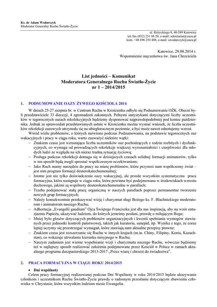 Ks. dr Adam Wodarczyk Moderator Generalny Ruchu Światło-Życie ul. Różyckiego 8, 40-589 Katowice tel./fax (032) 251 88 20, e-mail: [email protected] kom. +48 696 254 488, e-mail: [email protected] Katowice, 29.08.2014 r. Wspomnienie męczeństwa św. Jana Chrzciciela List jedności – Komunikat Moderatora Generalnego Ruchu Światło-Życie nr 1 – 2014/2015 1. PODSUMOWANIE OAZY ŻYWEGO KOŚCIOŁA 2014 W dniach 25-27 sierpnia br. w Centrum Ruchu w Krościenku odbyło się Podsumowanie OŻK. Obecni byli przedstawiciele 33 diecezji, 4 zgromadzeń zakonnych. Pełnymi statystykami dotyczącymi liczby uczestników w tegorocznych oazach rekolekcyjnych będziemy dysponować najprawdopodobniej pod koniec października. Jednak ze sprawozdań przedstawianych ustnie w Krościenku można wysnuć wniosek, że liczba uczestników rekolekcji oazowych utrzymała się na ubiegłorocznym poziomie, a być może nawet odnotujemy wzrost. Wśród wielu problemów, o których mówiono podczas Podsumowania, na podstawie tegorocznych oaz wakacyjnych i pracy w ciągu roku, warto zauważyć niektóre wątki: − Znakiem czasu jest wzrastająca liczba uczestników oaz pochodzących z rodzin rozbitych i dysfunkcyjnych, co wymaga od prowadzących rekolekcje większej wyrozumiałości i cierpliwości dla młodych ludzi ze względu na ich nieraz trudną sytuację życiową; − Posługa podczas rekolekcji domaga się w dzisiejszych czasach solidnej formacji animatorów, tylko w ten sposób będą mogli sprostać współczesnym oczekiwaniom; − Jako Ruch mamy narzędzie do pracy na miarę problemów, które przynosi nam współczesny świat – jest nim program formacji deuterokatechumenalnej; − Istotne jest nie tylko doświadczenie oazy wakacyjnej, ale przede wszystkim systematyczna praca formacyjna, która następuje w ciągu roku, która powinna być podejmowana w środowiskach wzrostu duchowego, jakimi są wspólnoty deuterokatechumenalne w parafiach; − Trzeba podejmować stałą pracę organiczną w naszych parafiach poprzez permanentne tworzenie nowych grup formacyjnych; − Należy konsekwentnie przekazywać wizję i charyzmat sługi Bożego ks. F. Blachnickiego moderatorom i animatorom naszego Ruchu; − Adhortacja „Evangelii gaudium” Ojca Świętego Franciszka jest dla nas inspiracją, aby na wzór entuzjazmu Papieża, ukazywać ludziom, do których jesteśmy posłani, prawdę o miłującym Bogu; − Mniej było głosów dotyczących problemów organizacyjnych i kwestii spełniania wymogów stawianych przez jednostki kontroli państwowej, takich jak kuratoria, sanepid, itp. Wynika z tego, że coraz lepiej uczymy się przestrzegać wymagań, które stawiają nam aktualne przepisy prawne; − Znakiem czasu jest rozszerzanie się Ruchu w innych krajach (m.in. Chiny, Filipiny, Kenia, Kazachstan), co wskazuje utrwalanie kierunku misyjnego w Ruchu; − Naszym zadaniem jest wierne wypełnianie wizji i charyzmatu naszego Ruchu, wówczas będziemy też w najlepszy sposób realizować założenia podejmowane przez Kościół w Polsce w ramach aktualnego programu duszpasterskiego 2013-2017 „Przez wiarę i chrzest do świadectwa”. 2. PRACA FORMACYJNA W CIĄGU ROKU 2014/2015 • Dni wspólnoty Celem pracy formacyjnej realizowanej podczas Dni Wspólnoty w roku 2014/2015 będzie ukazywanie członkom i uczestnikom Ruchu Światło-Życie prawdy o radosnym przesłaniu dotyczącym zbawienia człowieka w Chrystusie, które wszystkim ludziom niesie Ewangelia. Podczas dni wspólnoty spojrzymy najpierw na postać św. Jana Pawła II, patrona i wielkiego Przyjaciela naszego Ruchu. Będziemy chcieli odkryć go jako człowieka otwartego na innych ludzi, bezgranicznie oddanego służbie, otwartego na budowanie ekumenicznej jedności z chrześcijanami w celu wiarygodnego głoszenia światu Jezusa jako Pana i Zbawiciela. Adwentowe dni wspólnoty ukażą nam temat budowania jedności w Kościele powszechnym, w parafii i w Ruchu Światło-Życie. Wielkopostne dni wspólnoty skoncentrują się na temacie miłości ubogich. Zastanowimy się nad różnymi rodzajami ubóstwa, którego doświadczają dzisiaj ludzie oraz nad tym, czego uczą nas współcześni ubodzy. Będziemy też chcieli odkryć całą moc błogosławieństwa „błogosławieni ubodzy w duchu, albowiem do nich należy Królestwo niebieskie”. Paschalny cykl dni wspólnoty będzie skoncentrowany na temacie dzielenia się radością Ewangelii we współczesnym świecie poprzez odważne wyjście ewangelizacyjne do świata. Podobnie jak w minionych latach tematyka dni wspólnoty w roku formacyjnym 2014/2015 powinna budzić wszystkich członków Ruchu Światło-Życie do podjęcia nowej ewangelizacji, realizowanej w ramach Planu Ad Christum Redemptorem 2, poprzez dzielenie się radością Ewangelii z ludźmi, którzy wiary w Chrystusa Ukrzyżowanego i Zmartwychwstałego nigdy nie posiedli lub z różnych powodów ją utracili. Niech spotkania w ramach Dni Wspólnoty w roku formacyjnym 2014/2015 zachęcą nas, byśmy na co dzień byli radosnymi świadkami Ewangelii oraz rozpalą nas wszystkich do służby i do ewangelizacji. Dlatego zachęcam wszystkich do wytrwałego udziału w dniach wspólnoty. Mam nadzieję, że materiały te przyczynią się do umocnienia zapału ewangelizacyjnego członków Ruchu Światło-Życie, który jest warunkiem owocnego zrealizowania Planu Wielkiej Ewangelizacji „Ad Christum Redemptorem 2”, który ma nas przygotować na świętowanie Jubileuszu Odkupienia w roku 2033. Aby owocnie wypełnić to zadanie, trzeba na co dzień doświadczać radości Ewangelii, czego życzę wszystkim członkom Ruchu Światło-Życie! • Formacja permanentna Zgodnie z wcześniejszymi zapowiedziami, została wydana wersja studyjna podręcznika „Oazy Rekolekcyjnej Animatorów Ewangelizacji II stopnia – Akademia rozwoju chrześcijanina”. Odpowiada on na formacyjne potrzeby pogłębienia duchowego animatorów ewangelizacji w oparciu o osiem filarów 