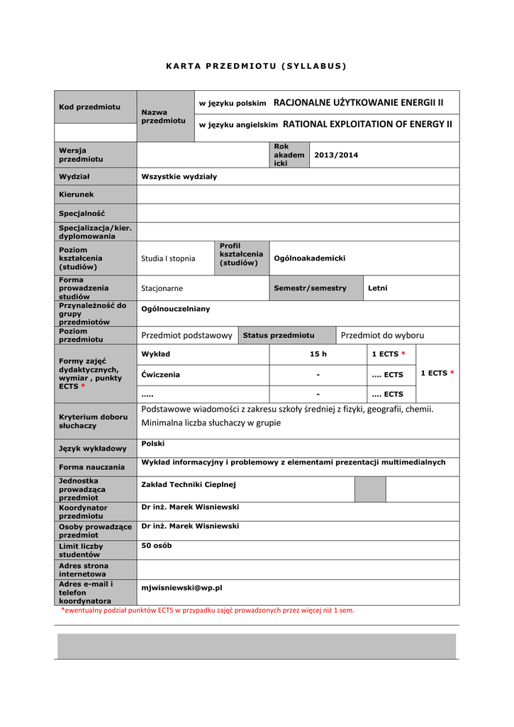 KARTA PRZEDMIOTU (SYLLABUS) Kod przedmiotu w języku polskim Nazwa przedmiotu w języku angielskim RATIONAL EXPLOITATION OF ENERGY II Rok akadem icki Wersja przedmiotu Wydział RACJONALNE UŻYTKOWANIE ENERGII II 2013/2014 Wszystkie wydziały Kierunek Specjalność Specjalizacja/kier. dyplomowania Poziom kształcenia (studiów) Forma prowadzenia studiów Przynależność do grupy przedmiotów Poziom przedmiotu Formy zajęć dydaktycznych, wymiar , punkty ECTS * Kryterium doboru słuchaczy Język wykładowy Forma nauczania Jednostka prowadząca przedmiot Koordynator przedmiotu Studia I stopnia Profil kształcenia (studiów) Stacjonarne Semestr/semestry Letni Ogólnouczelniany Przedmiot podstawowy Wykład Status przedmiotu Przedmiot do wyboru 15 h 1 ECTS * Ćwiczenia - …. ECTS ….. - …. ECTS 1 ECTS * Podstawowe wiadomości z zakresu szkoły średniej z fizyki, geografii, chemii. Minimalna liczba słuchaczy w grupie Polski Wykład informacyjny i problemowy z elementami prezentacji multimedialnych Zakład Techniki Cieplnej Dr inż. Marek Wisniewski Osoby prowadzące przedmiot Dr inż. Marek Wisniewski Limit liczby studentów 50 osób Adres strona internetowa Adres e-mail i telefon koordynatora Ogólnoakademicki [email protected] *ewentualny podział punktów ECTS w przypadku zajęć prowadzonych przez więcej niż 1 sem. EFEKTY KSZTAŁCENIA I SPOSÓB PROWADZENIA ZAJĘĆ Cel przedmiotu Celem zajęć jest :zapoznanie słuchaczy : - ze źródłami energii odnawialnej, ich zasobami, sposobami ich wykorzystania w życiu codziennym. - z oddziaływaniem technologii energetyki odnawialnej na środowisko naturalne. - ze sposobami oszczędzania energii cieplnej i elektrycznej w gospodarstwie domowym. Opis efektów kształcenia dla przedmiotu numer efektu kształcenia Student, który zaliczył przedmiot (W) wie/(U) umie/(K) potrafi: SYMBOL EKK SYMBOL EKO Forma realizacji zajęć dydakty cznych Metody weryfikacji efektów kształcenia (forma zaliczeń) Wykład Kolokwium Wykład Kolokwium Wykład Sprawdzian pisemny Wykład Sprawdzian pisemny Wykład Dyskusja WIEDZA W1 Student ma wiedzę o zasobach energii odnawialnej i ich pozycji w polityce energetycznej kraju i UE K_W22+++ K_W23+++ K_W24+++ T1A_W04 T1A_W05 T1A_W06 T1A_W07 T1A_W09 W2 Ma wiedzę w zakresie właściwości fizykochemicznych, sposobów pozyskania i technologii wykorzystania biomasy stałej i innych odnawialnych źródeł energii w energetyce.. K_W10+++ K_W25+++ T1A_W01 T1A_W09 T1A_W07 UMIEJĘTNOŚCI U1 Posiada umiejętność doboru urządzeń dla prostej instalacji wykorzystującej odnawialne źródła energii. K_U16+++ K_U24++ U2 Posiada umiejętność przewidywania wpływu technologii wykorzystującej odnawialne źródła energii na środowisko naturalne. K_U17+++ K_U20++ K_W23++ T1A_U01 T1A_U06 T1A_U07 T1A_U01 T1A_U11 T1A_U10 T1A_U08 KOMPETENCJE SPOŁECZNE K1 Ma świadomość wagi pozatechnicznych aspektów i skutków działalności inżynierskiej, w tym jej wpływu na środowisko, i związanej z tym odpowiedzialności za podejmowane decyzje. K_K02++ T1A_K02 Macierz efektów kształcenia dla przedmiotu w odniesieniu do form realizacji zajęć Wiedza W1 W2 Określa rodzaje energii ich zasoby i sposoby wykorzystania w energetyce. Zna definicję odpadów niebezpiecznych, ich identyfikację , źródła powstawania oraz podstawy prawne postępowania z odpadami niebezpiecznymi. + + UMIEJĘTNOŚCI U1 U2 Potrafi dobrać urządzenie na podstawie określonych kryteriów do wykorzystania odnawialnych źródeł energii. Posiada umiejętność analizy istniejącej technologii wykorzystania energii odnawialnych i wskazania możliwości wystąpienia zagrożeń dla środowiska. + + KOMPETENCJE SPOŁECZNE K1 Aktywnie dyskutuje i przygotowuje wystąpienia poszerzające wiedzę z zakresu technologii energetycznych. + inne ... Zajęcia praktyczne Pracownia artystyczna Konwersatorium (W) wie/(U) umie/(K) potrafi: Ćw. projektowe Ćw. audytoryjne Student, który zaliczył przedmiot Wykład numer efektu kształce nia Ćw. laboratoryjne Forma realizacji zajęć dydaktycznych Treści kształcenia dla każdej formy zajęć dydaktycznych Wykład: Energia geotermalna. Zasoby geotermiczne i ich wykorzystanie. Elektrownie i ciepłownie geotermalne. Instalacje geotermiczne w Polsce. Wykorzystanie zasobów energetycznych oceanów i mórz. Klasyfikacja urządzeń do wytwarzania energii elektrycznej. Przykładowe rozwiązania techniczne. Zamknięty obieg Rankine’a i otwarty obieg Clouda. Wykorzystanie energii wód śródlądowych. Mikro-, mini- i mała energetyka wodna. Turbiny wodne. Nisko-, średnio- i wysokospadowe elektrownie wodne. Mała energetyka wodna (MEW) w Polsce. Rynki energii odnawialnej. Oddziaływanie technologii energetyki odnawialnej na środowisko naturalne. Ekologiczna gospodarka energetyczna. Racjonalne wdrażanie technologii energii odnawialnej. Ekonomika energetyki odnawialnej. Oszczędzanie energii. Technologie energooszczędne. Energia odpadowa. Wykorzystanie ciepła odpadowego. Fizyczna i chemiczna energia odpadowa. Odpady komunalne i przemysłowe. Termiczne unieszkodliwianie odpadów. Racjonalna gospodarka odpadami. Paliwa z odpadów. Infrastruktura energetyczna obszarów wiejskich. Sposób obliczania oceny końcowej Przedmiot zalicza odpowiedni % liczby zdobytych punktów w teście wielokrotnego wyboru: - na ocenę 3 minimum 50% - na ocenę 4 minimum 65% - na ocenę 5 minimum 80% Literatura podstawowa i uzupełniająca; pomoce naukowe 1. Lewandowski W.M.: Proekologiczne odnawialne źródła energii, WNT, Warszawa 2006. 2. Bogdanienko J.: Odnawialne źródła energii, PWN, Warszawa 1991. 3. Nowak W., Stachel A.A., Borsukiewicz-Gozdur A.: Zastosowania odnawialnych źródeł energii, Wydawnictwo Uczelniane Politechniki Szczecińskiej, Szczecin 2008. 4. Ciechanowicz W.: Energia, środowisko i ekonomia, IBS AN, Warszawa 1997. 5. Mikielewicz J., Cieśliński J.T.: Niekonwencjonalne urządzenia i systemy konwersji energii, Ossolineum, Wrocław 1