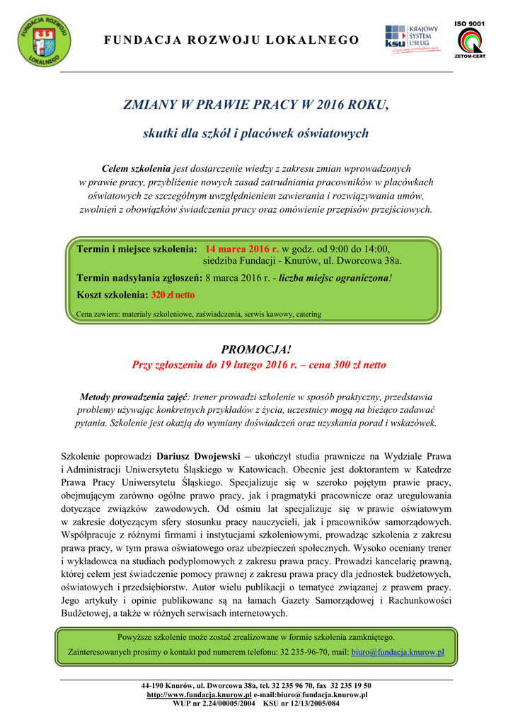 ISO 9001 FUNDACJA ROZWOJU LOKALNEGO ZETOM-CERT ZMIANY W PRAWIE PRACY W 2016 ROKU, skutki dla szkół i placówek oświatowych Celem szkolenia jest dostarczenie wiedzy z zakresu zmian wprowadzonych w prawie pracy, przybliżenie nowych zasad zatrudniania pracowników w placówkach oświatowych ze szczególnym uwzględnieniem zawierania i rozwiązywania umów, zwolnień z obowiązków świadczenia pracy oraz omówienie przepisów przejściowych. Termin i miejsce szkolenia: 14 marca 2016 r. w godz. od 9:00 do 14:00, siedziba Fundacji - Knurów, ul. Dworcowa 38a. Termin nadsyłania zgłoszeń: 8 marca 2016 r. - liczba miejsc ograniczona! Koszt szkolenia: 320 zł netto Cena zawiera: materiały szkoleniowe, zaświadczenia, serwis kawowy, catering PROMOCJA! Przy zgłoszeniu do 19 lutego 2016 r. – cena 300 zł netto Metody prowadzenia zajęć: trener prowadzi szkolenie w sposób praktyczny, przedstawia problemy używając konkretnych przykładów z życia, uczestnicy mogą na bieżąco zadawać pytania. Szkolenie jest okazją do wymiany doświadczeń oraz uzyskania porad i wskazówek. Szkolenie poprowadzi Dariusz Dwojewski – ukończył studia prawnicze na Wydziale Prawa i Administracji Uniwersytetu Śląskiego w Katowicach. Obecnie jest doktorantem w Katedrze Prawa Pracy Uniwersytetu Śląskiego. Specjalizuje się w szeroko pojętym prawie pracy, obejmującym zarówno ogólne prawo pracy, jak i pragmatyki pracownicze oraz uregulowania dotyczące związków zawodowych. Od ośmiu lat specjalizuje się w prawie oświatowym w zakresie dotyczącym sfery stosunku pracy nauczycieli, jak i pracowników samorządowych. Współpracuje z różnymi firmami i instytucjami szkoleniowymi, prowadząc szkolenia z zakresu prawa pracy, w tym prawa oświatowego oraz ubezpieczeń społecznych. Wysoko oceniany trener i wykładowca na studiach podyplomowych z zakresu prawa pracy. Prowadzi kancelarię prawną, której celem jest świadczenie pomocy prawnej z zakresu prawa pracy dla jednostek budżetowych, oświatowych i przedsiębiorstw. Autor wielu publikacji o tematyce związanej z prawem pracy. Jego artykuły i opinie publikowane są na łamach Gazety Samorządowej i Rachunkowości Budżetowej, a także w różnych serwisach internetowych. Powyższe szkolenie może zostać zrealizowane w formie szkolenia zamkniętego. Zainteresowanych prosimy o kontakt pod numerem telefonu: 32 235-96-70, mail: [email protected] 44-190 Knurów, ul. Dworcowa 38a, tel. 32 235 96 70, fax 32 235 19 50 http://www.fundacja.knurow.pl e-mail:[email protected] WUP nr 2.24/00005/2004 KSU nr 12/13/2005/084 ISO 9001 FUNDACJA ROZWOJU LOKALNEGO ZETOM-CERT Program szkolenia: 1. Nowe zasady zatrudniania pracowników na podstawie umów terminowych: limity umów na czas określony - „zasada 33 lub 3” oraz wyjątki, przyczynowość umowy terminowej i obowiązki z tym związane, rozwiązywanie umów na czas określony – nowe zasady w zakresie możliwości wypowiedzeń, omówienie przepisów przejściowych – umowy obowiązujące w chwili wejścia w życie zmian – co dalej? szczególna ochrona stosunku pracy przy umowach terminowych, zasady zatrudniania nauczycieli na czas określony w kontekście zmienionych przepisów, awans zawodowy nauczycieli zatrudnianych na czas określony, w tym na zastępstwo, przejście na emeryturę lub nauczycielskie świadczenie kompensacyjne z umowy zawartej na czas określony, świadectwa pracy przy umowach terminowych. 2. Nawiązywanie stosunku pracy w szkole: a) b) c) d) wymogi zatrudnienia na stanowisku nauczyciela i omówienie rodzajów dokumentacji potwierdzającej ich spełnienie, nowe zasady wstępnych badań lekarskich, kiedy można wykorzystać zaświadczenie z innego zakładu, niezdolność do pracy jako podstawa rozwiązania stosunku pracy, badania realizowane „na własną rękę” przez pracownika, zatrudnianie asystenta nauczyciela oraz specjalistów bez uprawnień pedagogicznych, roszczenia dotyczące nawiązania stosunku pracy w szkole, ustalenie właściwej podstawy zatrudnienia, przekształcenie formy zatrudnienia nauczyciela. 3. Zwolnienia z obowiązku świadczenia pracy: zwolnienie od pracy w okresie wypowiedzenia, obowiązkowe zwolnienia od pracy (płatne i niepłatne), prywatne wyjścia pracowników, nowe zasady korzystania z opieki na zdrowie dziecko w wieku do lat 14 – wątpliwości dotyczące nauczycieli. 4. Zmiany w przepisach dotyczących uprawnień rodzicielskich: likwidacja dodatkowego urlopu macierzyńskiego, nowe urlopy rodzicielskie – procedury, zasady odpłatności za urlop rodzicielski, urlopy dodatkowe i ojcowskie, na czym polega obowiązkowy, a na czym dobrowolny urlop macierzyński, zmniejszenie wymiaru etatu zamiast dodatkowego urlopu macierzyńskiego, w jaki sposób chroniony jest rodzic, który zamiast urlopu wychowawczego korzysta ze zmniejszenia wymiaru etatu, w jakich terminach i jakie wnioski są wymagane, aby korzystać z urlopu macierzyńskiego, dodatkowego urlopu macierzyńskiego i urlopu rodzicielskiego, korzystanie z uprawnień rodzicielskich a awans zawodowy nauczyciela. 5. Zmiany w stosowaniu przepisów wynikające z najnowszego orzecznictwa sądowego: kryteria doboru pracowników do zwolnień, prawidłowe formułowanie przyczyny wypowiedzenia w przypadku zwolnień wynikających z konieczności organizacyjnych, szczególna ochrona stosunku pracy nauczycieli w świetle orzecznictwa sądowego, zakres współpracy ze związkami zawodowymi przy redukcjach zatrudnienia w szkole, odrębności dotyczące postępowania z pracownikami zatrudnionymi na stanowiskach urzędniczych w szkołach i placówkach oświatowych w razie reorganizacji. 6. zmiany w przepisach o urlopach wychowawczych: nowe procedury udzielania urlopu wychowawczego, maksymalny czas trwania urlopu i możliwość jego dzielenia na części, urlop wychowawczy a urlop wypoczynkowy, odrębności dotyczące urlopów wychowawczych. 44-190 Knurów, ul. Dworcowa 38a, tel. 32 235 96 70, fax 32 235 19 50 ht