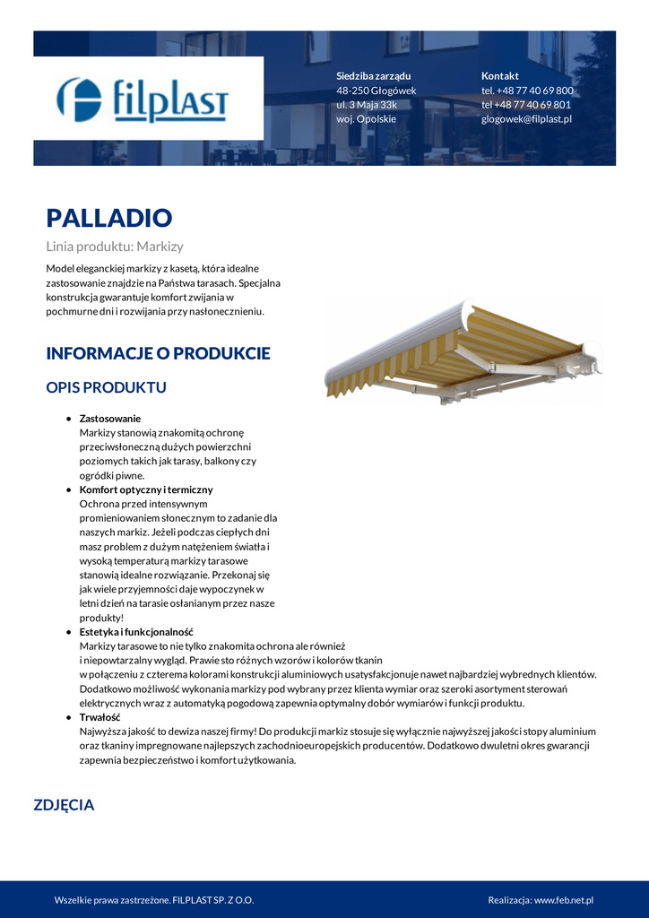 Siedziba zarządu 48-250 Głogówek ul. 3 Maja 33k woj. Opolskie Kontakt tel. +48 77 40 69 800 tel +48 77 40 69 801 [email protected] PALLADIO Linia produktu: Markizy Model eleganckiej markizy z kasetą, która idealne zastosowanie znajdzie na Państwa tarasach. Specjalna konstrukcja gwarantuje komfort zwijania w pochmurne dni i rozwijania przy nasłonecznieniu. INFORMACJE O PRODUKCIE OPIS PRODUKTU Zastosowanie Markizy stanowią znakomitą ochronę przeciwsłoneczną dużych powierzchni poziomych takich jak tarasy, balkony czy ogródki piwne. Komfort optyczny i termiczny Ochrona przed intensywnym promieniowaniem słonecznym to zadanie dla naszych markiz. Jeżeli podczas ciepłych dni masz problem z dużym natężeniem światła i wysoką temperaturą markizy tarasowe stanowią idealne rozwiązanie. Przekonaj się jak wiele przyjemności daje wypoczynek w letni dzień na tarasie osłanianym przez nasze produkty! Estetyka i funkcjonalność Markizy tarasowe to nie tylko znakomita ochrona ale również i niepowtarzalny wygląd. Prawie sto różnych wzorów i kolorów tkanin w połączeniu z czterema kolorami konstrukcji aluminiowych usatysfakcjonuje nawet najbardziej wybrednych klientów. Dodatkowo możliwość wykonania markizy pod wybrany przez klienta wymiar oraz szeroki asortyment sterowań elektrycznych wraz z automatyką pogodową zapewnia optymalny dobór wymiarów i funkcji produktu. Trwałość Najwyższa jakość to dewiza naszej firmy! Do produkcji markiz stosuje się wyłącznie najwyższej jakości stopy aluminium oraz tkaniny impregnowane najlepszych zachodnioeuropejskich producentów. Dodatkowo dwuletni okres gwarancji zapewnia bezpieczeństwo i komfort użytkowania. ZDJĘCIA Wszelkie prawa zastrzeżone. FILPLAST SP. Z O.O. Realizacja: www.feb.net.pl Wszelkie prawa zastrzeżone. FILPLAST SP. Z O.O. Realizacja: www.feb.net.pl