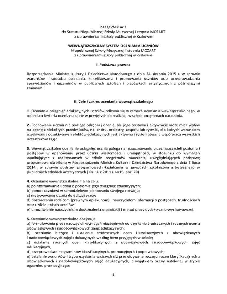 ZAŁĄCZNIK nr 1 do Statutu Niepublicznej Szkoły Muzycznej I stopnia MOZART z uprawnieniami szkoły publicznej w Krakowie WEWNĄTRZSZKOLNY SYSTEM OCENIANIA UCZNIÓW Niepublicznej Szkoły Muzycznej I stopnia MOZART z uprawnieniami szkoły publicznej w Krakowie I. Podstawa prawna Rozporządzenie Ministra Kultury i Dziedzictwa Narodowego z dnia 24 sierpnia 2015 r. w sprawie warunków i sposobu oceniania, klasyfikowania i promowania uczniów oraz przeprowadzania sprawdzianów i egzaminów w publicznych szkołach i placówkach artystycznych z późniejszymi zmianami II. Cele i zakres oceniania wewnątrzszkolnego 1. Ocenianie osiągnięć edukacyjnych uczniów odbywa się w ramach oceniania wewnątrzszkolnego, w oparciu o kryteria oceniania ujęte w przyjętych do realizacji w szkole programach nauczania. 2. Zachowanie ucznia nie podlega odrębnej ocenie, ale jego postawa i aktywność może mieć wpływ na ocenę z niektórych przedmiotów, np. chóru, orkiestry, zespołu lub rytmiki, dla których warunkiem uzyskiwania oczekiwanych efektów edukacyjnych jest aktywna i systematyczna współpraca wszystkich uczestników zajęć. 3. Wewnątrzszkolne ocenianie osiągnięć ucznia polega na rozpoznawaniu przez nauczycieli poziomu i postępów w opanowaniu przez ucznia wiadomości i umiejętności, w stosunku do wymagań wynikających z realizowanych w szkole programów nauczania, uwzględniających podstawę programową określoną w Rozporządzeniu Ministra Kultury i Dziedzictwa Narodowego z dnia 2 lipca 2014r. w sprawie podstaw programowych kształcenia w zawodach szkolnictwa artystycznego w publicznych szkołach artystycznych ( Dz. U. z 2011 r. Nr15, poz. 70) 4. Ocenianie wewnątrzszkolne ma na celu: a) poinformowanie ucznia o poziomie jego osiągnięć edukacyjnych; b) pomoc uczniowi w samodzielnym planowaniu swojego rozwoju; c) motywowanie ucznia do dalszej pracy; d) dostarczenie rodzicom (prawnym opiekunom) i nauczycielom informacji o postępach, trudnościach oraz uzdolnieniach uczniów; e) umożliwienie nauczycielom doskonalenia organizacji i metod pracy dydaktyczno-wychowawczej. 5. Ocenianie wewnątrzszkolne obejmuje: a) formułowanie przez nauczycieli wymagań niezbędnych do uzyskania śródrocznych i rocznych ocen z obowiązkowych i nadobowiązkowych zajęć edukacyjnych; b) ocenianie bieżące i ustalanie śródrocznych ocen klasyfikacyjnych z obowiązkowych i nadobowiązkowych zajęć edukacyjnych według form przyjętych w szkole; c) ustalanie rocznych ocen klasyfikacyjnych z obowiązkowych i nadobowiązkowych zajęć edukacyjnych, d) przeprowadzanie egzaminów klasyfikacyjnych, promocyjnych i poprawkowych; e) ustalanie warunków i trybu uzyskania wyższych niż przewidywane rocznych ocen klasyfikacyjnych z obowiązkowych i nadobowiązkowych zajęć edukacyjnych, z wyjątkiem oceny ustalonej w trybie egzaminu promocyjnego; 1 f) ustalanie warunków i sposobu przekazywania rodzicom (prawnym opiekunom) uczniów informacji o postępach i trudnościach w nauce podopiecznych. 6. Dyrektor szkoły zwalnia ucznia z realizacji chóru na podstawie opinii o ograniczonych możliwościach uczestniczenia ucznia w tych zajęciach, wydanej przez lekarza, na czas określony tej opinii. 7. Dyrektor szkoły artystycznej, na wniosek rodziców lub pełnoletniego ucznia , może zwolnić ucznia z realizacji obowiązkowych zajęć edukacyjnych artystycznych, jeżeli uczeń zrealizował te zajęcia w zakresie zgodnym z podstawą programową kształcenia w zawodach szkolnictwa artystycznego, zwaną dalej „podstawą programową”. 8. Na podstawie pisemnej opinii poradni psychologiczno - pedagogicznej lub innej poradni specjalistycznej, nauczyciel zobowiązany jest dostosować wymagania edukacyjne w stosunku do ucznia, u którego stwierdzono specyficzne trudności w uczeniu się lub deficyty rozwojowe uniemożliwiające sprostaniu wymogom edukacyjnym wynikającym z programu nauczania. III. Formy i sposób oceniania 9. Bieżące, śródroczne, roczne oraz końcowe oceny klasyfikacyjne z zajęć edukacyjnych ustala się w stopniach według następującej skali: 1) stopnień celujący – 6 2) stopień bardzo dobry – 5 3) stopnień dobry – 4 4) stopień dostateczny – 3 5) stopień dopuszczający – 2 6) stopień niedostateczny -1 PRZEDMIOTY TEORETYCZNE 10. Ocenianie wiedzy i umiejętności z przedmiotów teoretycznych odbywa się na podstawie: - prac sprawdzających - odpowiedzi ustnych na lekcjach - prac domowych: ustnych i pisemnych - referatów, prelekcji, prezentacji itp. - aktywności na zajęciach - obecności i aktywnym uczestnictwie na wydarzeniach szkolnych Nauczyciele przechowują sprawdzone przez siebie prace kontrolne uczniów do końca roku kalendarzowego po rocznej klasyfikacji. 11. Ocenianiu podlegają: - wiadomości ucznia - rozumienie przerabianego materiału - umiejętność korzystania i stosowania wiedzy w praktyce - sposób przekazywania wiadomości: zasób merytoryczny, jasność i precyzja wypowiedzi, kultura języka. 2 12. Kryteria oceniania Uczeń otrzymuje ocenę celującą wtedy, gdy: ▪ posiada wiadomości wykraczające poza zakres wymagań podstawy programowej ▪ potrafi wyjaśnić zagadnienia bez pomocy nauczyciela, samodzielnie i sprawnie posługuje się wiedzą dla celów teoretycznych i praktycznych ▪ swobodnie posługuje się terminologią naukową bez ingerencji nauczyciela ▪ samodzielnie poszukuje dodatkowych źródeł wiedzy Uczeń otrzymuje ocenę bardzo dobrą wtedy, gdy: ▪ w pełni i w sposób wyczerpujący opanował cały materiał podstawy programowej ▪ samodzielnie i w sposób wyczerpujący wykorzystuje wiadomości w teorii i praktyce; analizuje zagadnienia bez pomocy nauczyciela ▪ poprawnie posługuje się terminologią poznaną na lekcjach; jego wypowiedzi są precyzyjne i logiczne Uczeń otrzymuje ocenę dobrą wtedy, gdy: ▪ opanował materiał określony w podstawie programowej ▪ stosuje wiedzę w teorii i praktyce w sytuacjach inspirowanych