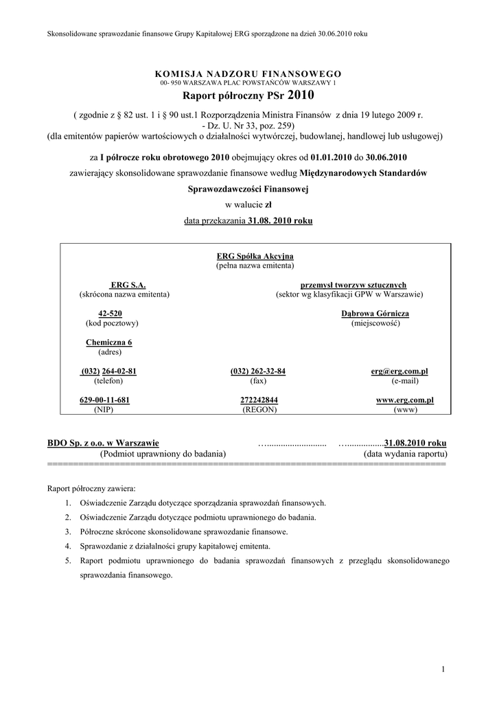 Skonsolidowane sprawozdanie finansowe Grupy Kapitałowej ERG sporządzone na dzień 30.06.2010 roku KOMISJA NADZO RU FINANSOWEGO 00- 950 WARSZAWA PLAC POWSTAŃCÓW WARSZAWY 1 Raport półroczny PSr 2010 ( zgodnie z § 82 ust. 1 i § 90 ust.1 Rozporządzenia Ministra Finansów z dnia 19 lutego 2009 r. - Dz. U. Nr 33, poz. 259) (dla emitentów papierów wartościowych o działalności wytwórczej, budowlanej, handlowej lub usługowej) za I półrocze roku obrotowego 2010 obejmujący okres od 01.01.2010 do 30.06.2010 zawierający skonsolidowane sprawozdanie finansowe według Międzynarodowych Standardów Sprawozdawczości Finansowej w walucie zł data przekazania 31.08. 2010 roku ERG Spółka Akcyjna (pełna nazwa emitenta) przemysł tworzyw sztucznych (sektor wg klasyfikacji GPW w Warszawie) ERG S.A. (skrócona nazwa emitenta) 42-520 (kod pocztowy) Dąbrowa Górnicza (miejscowość) Chemiczna 6 (adres) (032) 264-02-81 (telefon) 629-00-11-681 (NIP) (032) 262-32-84 (fax) 272242844 (REGON) [email protected] (e-mail) www.erg.com.pl (www) BDO Sp. z o.o. w Warszawie ….......................... …................31.08.2010 roku (Podmiot uprawniony do badania) (data wydania raportu) ============================================================================= Raport półroczny zawiera: 1. Oświadczenie Zarządu dotyczące sporządzania sprawozdań finansowych. 2. Oświadczenie Zarządu dotyczące podmiotu uprawnionego do badania. 3. Półroczne skrócone skonsolidowane sprawozdanie finansowe. 4. Sprawozdanie z działalności grupy kapitałowej emitenta. 5. Raport podmiotu uprawnionego do badania sprawozdań finansowych z przeglądu skonsolidowanego sprawozdania finansowego. 1 Skonsolidowane sprawozdanie finansowe Grupy Kapitałowej ERG sporządzone na dzień 30.06.2010 roku Spis treści raportu półrocznego PSr 2010 I. Oświadczenie Zarządu dotyczące sporządzenia sprawozdania finansowego..........................3 II. Oświadczenie Zarządu dotyczące podmiotu uprawnionego do badania..................................4 III. Informacje ogólne.....................................................................................................................5 IV. Stosowane zasady rachunkowości............................................................................................8 V. Skonsolidowane sprawozdanie finansowe.............................................................................10 2 Skonsolidowane sprawozdanie finansowe Grupy Kapitałowej ERG sporządzone na dzień 30.06.2010 roku I. Oświadczenie Zarządu dotyczące sporządzenia sprawozdania finansowego ERG S.A. OŚWIADCZENIE CZŁONKÓW ZARZĄDU Dla Akcjonariuszy ERG S.A. Zarząd ERG S.A. oświadcza, że zgodnie z jego wiedzą skonsolidowane sprawozdanie finansowe Grupy Kapitałowej ERG S.A. za I półrocze 2010 roku i dane porównywalne za I półrocze 2009 roku sporządzone zostały zgodnie z obowiązującymi Międzynarodowymi Standardami Rachunkowości przyjętymi do stosowania w Unii Europejskiej oraz z Międzynarodowym Standardem Rachunkowości nr 34 „Śródroczna sprawozdawczość finansowa”. Niniejszy raport odzwierciedla w sposób prawdziwy, rzetelny i jasny sytuację majątkową i finansową Spółki oraz jej wynik finansowy. Oświadczamy również, że „Sprawozdanie Zarządu” zawiera prawdziwy obraz rozwoju i osiągnięć oraz sytuacji Grupy w okresie sprawozdawczym, w tym opis podstawowych ryzyk i zagrożeń. ………………………. Maciej Błasiak Prezes Zarządu 3 Skonsolidowane sprawozdanie finansowe Grupy Kapitałowej ERG sporządzone na dzień 30.06.2010 roku II. Oświadczenie Zarządu dotyczące podmiotu uprawnionego do badania ERG S.A. OŚWIADCZENIE CZŁONKÓW ZARZĄDU Dla Akcjonariuszy ERG S.A. Zarząd ERG S.A. oświadcza, że podmiot uprawniony do badania sprawozdań finansowych BDO Sp. z o.o. z siedzibą w Warszawie dokonujący przeglądu półrocznego skonsolidowanego sprawozdania finansowego za 2010 rok ERG S.A. został wybrany zgodnie z przepisami prawa. Oświadczamy również, że podmiot ten oraz biegły rewident dokonujący tego przeglądu spełniali warunki do bezstronnego i niezależnego raportu z badania, zgodnie z właściwymi przepisami prawa. ………………………. Maciej Błasiak Prezes Zarządu 4 Skonsolidowane sprawozdanie finansowe Grupy Kapitałowej ERG sporządzone na dzień 30.06.2010 roku III. Informacje ogólne 1. Informacje o jednostce dominującej, grupie kapitałowej oraz skonsolidowanym sprawozdaniu finansowym. Spółką dominującą jest ERG Spółka Akcyjna, który posiada 100% udziałów we wszystkich podmiotach objętych konsolidacją. Kapitał zakładowy ERG S.A. na 30.06.2010 roku zarejestrowany w KRS wynosi 17.322.000,00 zł. Dzieli się na 43.305.000 akcji zwykłych na okaziciela. Przedmiotem działalności ERG S.A. jest: • produkcja opakowań z tworzyw sztucznych; • produkcja płyt, arkuszy, rur i kształtek z tworzyw sztucznych; • produkcja pozostałych wyrobów z tworzyw sztucznych; • sprzedaż hurtowa wyrobów chemicznych; • sprzedaż hurtowa nie wyspecjalizowana. Rejestracja: Sąd Rejestrowy w Katowicach, wydział Gospodarczy Krajowego Rejestru Sądowego Nr KRS: 000085389 PKD: 2222Z - produkcja opakowań z tworzyw sztucznych. Branża według klasyfikacji przyjętej przez rynek – przemysł tworzyw sztucznych. 2. Skład grupy kapitałowej. W skład grupy kapitałowej wchodzi ERG Spółka Akcyjna oraz następujące spółki zależne: - BIOERG S.A. - FOLPAK Ciechanów Sp. z o.o. Struktura organizacyjna Grupy Kapitałowej: ERG S.A. 42-520 Dąbrowa Górnicza, ul. Chemiczna 6 BIOERG S.A. 42-520 Dąbrowa Górnicza, ul. Chemiczna 6 FOLPAK Sp. z o.o. 06-400 Ciechanów, ul. Towarowa 2 5 Skonsolidowane sprawozdanie finansowe Grupy Kapitałowej ERG sporządzone na dzień 30.06.2010 roku ERG S.A. jest 100% udziałowcem w w/w spółkach. o FOLPAK Ciechanów Sp. z o.o. z siedzibą w Ciechanowie Kapitał zakładowy spółki zależnej FOLPAK Ciec