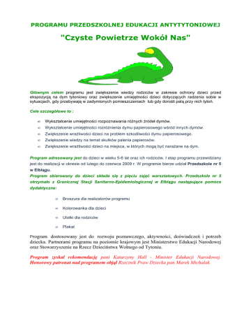 PROGRAMU PRZEDSZKOLNEJ EDUKACJI ANTYTYTONIOWEJ "Czyste Powietrze Wokół Nas" Głównym celem programu jest zwiększenie wiedzy rodziców w zakresie ochrony dzieci przed ekspozycją na dym tytoniowy oraz zwiększenie umiejętności dzieci dotyczących radzenia sobie w sytuacjach, gdy przebywają w zadymionych pomieszczeniach lub gdy dorośli palą przy nich tytoń. Cele szczegółowe to : • Wykształcenie umiejętności rozpoznawania różnych źródeł dymów. • Wykształcenie umiejętności rozróżnienia dymu papierosowego wśród innych dymów. • Zwiększenie wrażliwości dzieci na problem szkodliwości dymu papierosowego. • Zwiększenie wiedzy na temat skutków palenia papierosów. • Zwiększenie wrażliwości dzieci na miejsca, w których mogą być narażane na dym. Program adresowany jest do dzieci w wieku 5-6 lat oraz ich rodziców. I etap programu przewidziany jest do realizacji w okresie od lutego do czerwca 2009 r. W programie bierze udział Przedszkole nr 5 w Elblągu. Program skierowany do dzieci składa się z pięciu zajęć warsztatowych. Przedszkole nr 5 otrzymało z Granicznej Stacji Sanitarno-Epidemiologicznej w Elblągu następujące pomoce dydaktyczne: • Broszura dla realizatorów programu • Kolorowanka dla dzieci • Ulotki dla rodziców • Plakat Program dostosowany jest do rozwoju poznawczego, aktywności, doświadczeń i potrzeb dziecka. Partnerami programu na poziomie krajowym jest Ministerstwo Edukacji Narodowej oraz Stowarzyszenie na Rzecz Dzieciństwa Wolnego od Tytoniu. Program zyskał rekomendację pani Katarzyny Hall - Minister Edukacji Narodowej. Honorowy patronat nad programem objął Rzecznik Praw Dziecka pan Marek Michalak.