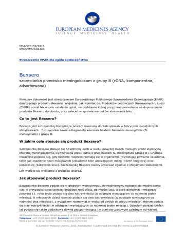 EMA/595159/2015 EMEA/H/C/002333 Streszczenie EPAR dla ogółu społeczeństwa Bexsero szczepionka przeciwko meningokokom z grupy B (rDNA, komponentna, adsorbowana) Niniejszy dokument jest streszczeniem Europejskiego Publicznego Sprawozdania Oceniającego (EPAR) dotyczącego produktu Bexsero. Wyjaśnia, jak Komitet ds. Produktów Leczniczych Stosowanych u Ludzi (CHMP) ocenił lek w celu ustalenia opinii, na podstawie której przyznano pozwolenie na dopuszczenie produktu Bexsero do obrotu, oraz zaleceń w sprawie warunków stosowania leku. Co to jest Bexsero? Bexsero jest szczepionką dostępną w postaci zawiesiny do wstrzykiwań w fabrycznie napełnionych strzykawkach. Szczepionka zawiera fragmenty komórek bakterii Neisseria meningitidis (N. meningitidis) z grupy B. W jakim celu stosuje się produkt Bexsero? Szczepionkę Bexsero stosuje się do ochrony osób w wieku powyżej dwóch miesięcy przed inwazyjną chorobą meningokokową wywoływaną przez jedną z grup bakterii N. meningitidis (grupę B). Choroba inwazyjna pojawia się, gdy bakterie rozprzestrzeniają się w organizmie, wywołując poważne zakażenia, takie jak zapalenie opon mózgowych (zakażenie błon otaczających mózg i rdzeń kręgowy) oraz posocznicę (zakażenie krwi). Szczepionkę Bexsero należy stosować zgodnie z oficjalnymi zaleceniami. Lek wydaje się wyłącznie z przepisu lekarza. Jak stosować produkt Bexsero? Szczepionkę Bexsero podaje się w głębokim wstrzyknięciu domięśniowym, najlepiej do mięśni barku lub, w przypadku dzieci poniżej drugiego roku życia, do mięśni uda. U osób dorosłych i młodzieży powyżej 11. roku życia podaje się dwa wstrzyknięcia (w odstępie wynoszącym co najmniej jeden miesiąc). U młodszych dzieci również podaje się dwa wstrzyknięcia (w odstępie wynoszącym co najmniej dwa miesiące), z wyjątkiem niemowląt w wieku od dwóch do pięciu miesięcy, którym podaje się trzy wstrzyknięcia (w odstępach wynoszących co najmniej jeden miesiąc). Dzieciom poniżej dwóch lat podaje się także dodatkową dawkę przypominającą (w punkcie czasowym zależnym od wieku). 30 Churchill Place ● Canary Wharf ● London E14 5EU ● United Kingdom Telephone +44 (0)20 3660 6000 Facsimile +44 (0)20 3660 5555 Send a question via our website www.ema.europa.eu/contact An agency of the European Union © European Medicines Agency, 2015. Reproduction is authorised provided the source is acknowledged. Jak działa produkt Bexsero? Szczepionki działają poprzez „uczenie” układu odpornościowego (naturalnych mechanizmów obronnych organizmu) sposobów obrony przed chorobą. Po podaniu szczepionki układ odpornościowy człowieka rozpoznaje fragmenty bakterii zawarte w szczepionce jako obce i odpowiada wytwarzaniem przeciwciał. Po kontakcie zaszczepionej osoby z bakteriami przeciwciała wraz z innymi składnikami układu odpornościowego będą w stanie zabijać te bakterie i pomagać w obronie organizmu przed chorobą. Szczepionka Bexsero zawiera cztery białka obecne na powierzchni komórek bakterii N. meningitidis z grupy B. Szczepionka jest „adsorbowana”: Oznacza to, że białka są przyłączone do powierzchni związku zawierającego glin, aby skuteczniej pobudzały odpowiedź układu odpornościowego. Jak badano produkt Bexsero? Zdolność szczepionki Bexsero do wywoływania produkcji przeciwciał (immunogenność) oceniono w dwóch badaniach głównych. W pierwszym badaniu głównym wzięło udział 2627 dzieci, które w chwili rozpoczęcia badania miały dwa miesiące. Skutki podania trzech dawek szczepionki Bexsero w odstępach dwumiesięcznych wraz z innymi, rutynowymi szczepieniami niemowląt porównano ze skutkami podania wyłącznie szczepień rutynowych. Badanie to rozszerzono o obserwację skutków podania dawki przypominającej szczepionki Bexsero u dzieci w wieku 12 miesięcy lub starszych, które otrzymały szczepionkę Bexsero w okresie wczesnego niemowlęctwa, w porównaniu z podaniem dwóch dawek „uzupełniających” u dzieci, które wcześniej tej szczepionki nie otrzymały. W drugim badaniu głównym wzięło udział 1631 nastolatków w wieku od 11 do 17 lat. Skutki podania jednej, dwóch lub trzech dawek szczepionki Bexsero (w co najmniej miesięcznych odstępach) porównano ze skutkami podania placebo (leczenia pozorowanego). Przeprowadzono także mniejsze badanie uzupełniające z udziałem osób dorosłych. W badaniach oceniano zdolność szczepionki Bexsero do pobudzenia odpowiedzi układu odpornościowego przeciwko bakteriom N. meningitidis z grupy B poprzez ilościową ocenę produkcji przeciwciał ochronnych, które były w stanie zabijać komórki bakterii. Jakie korzyści ze stosowania produktu Bexsero zaobserwowano w badaniach? Badania wykazały, że szczepionka Bexsero skutecznie pobudzała odpowiedź układu odpornościowego względem bakterii N. meningitidis z grupy B. Badanie u dzieci wykazało też, że pojedyncza dawka przypominająca szczepionki Bexsero podana w 12. miesiącu życia wywoływała silniejszą odpowiedź układu odpornościowego u dzieci, które wcześniej otrzymały szczepionkę Bexsero, niż pierwsza z dwóch dawek uzupełniających u dzieci w tym samym wieku, które wcześniej tej szczepionki nie otrzymały. W badaniu z udziałem nastolatków wykazano, że do wywołania odpowiednio silnej odpowiedzi układu odpornościowego potrzebne były dwie dawki. Podobne wyniki uzyskano w przypadku osób dorosłych. Jakie ryzyko wiąże się ze stosowaniem produktu Bexsero? Najczęstsze działania niepożądane związane ze stosowaniem szczepionki Bexsero u dzieci do 10. roku życia (obserwowane u więcej niż 1 pacjenta na 10) to zaburzenia odżywiania, senność, nietypowa płaczliwość, ból głowy, biegunka, wymioty, wysypka, artralgia (ból stawów), gorączka i drażliwość, a także tkliwość, obrzęk, stwardnienie i zaczerwienienie skóry w miejscu wstrzyknięcia. Najczęstsze działania niepożądane związan